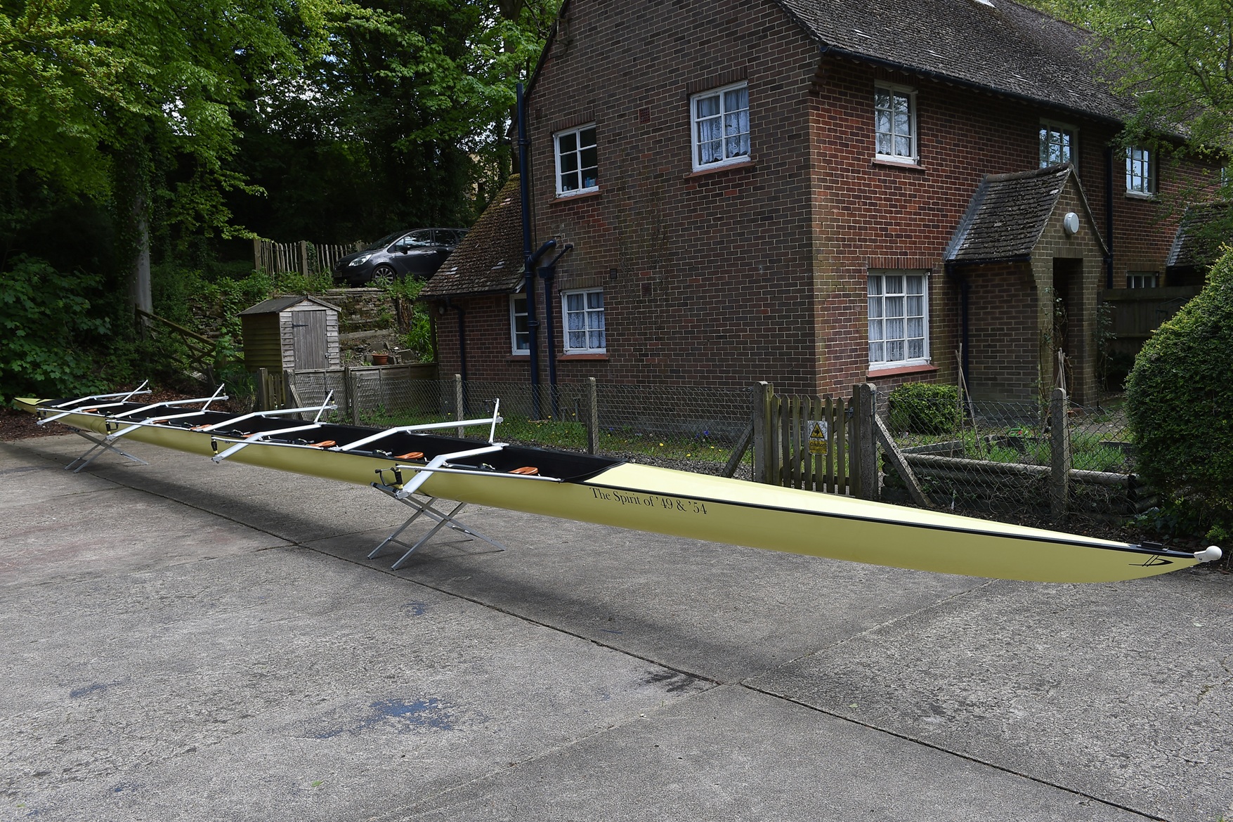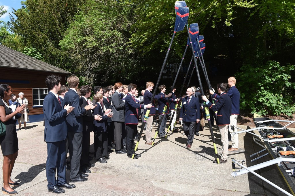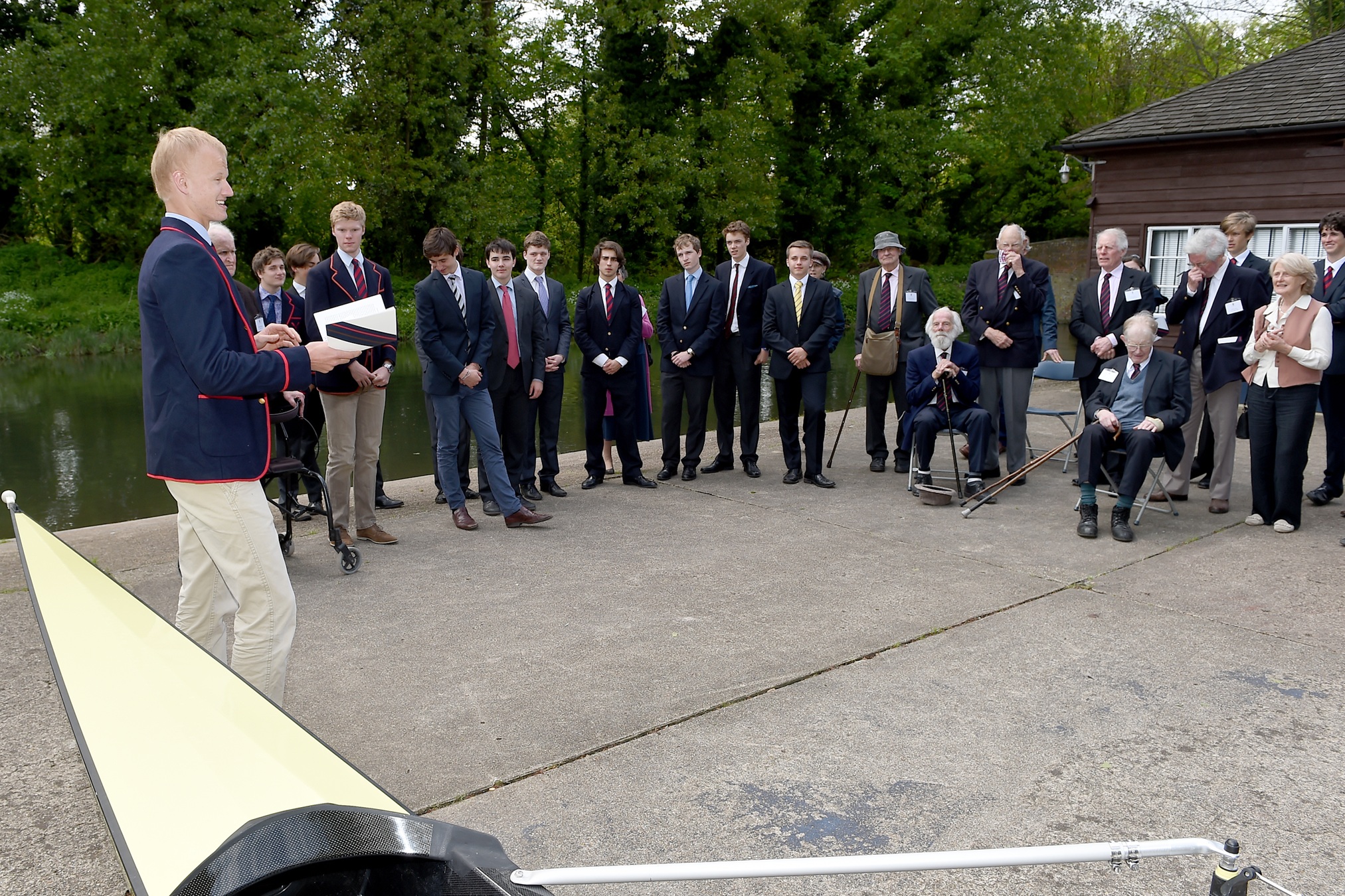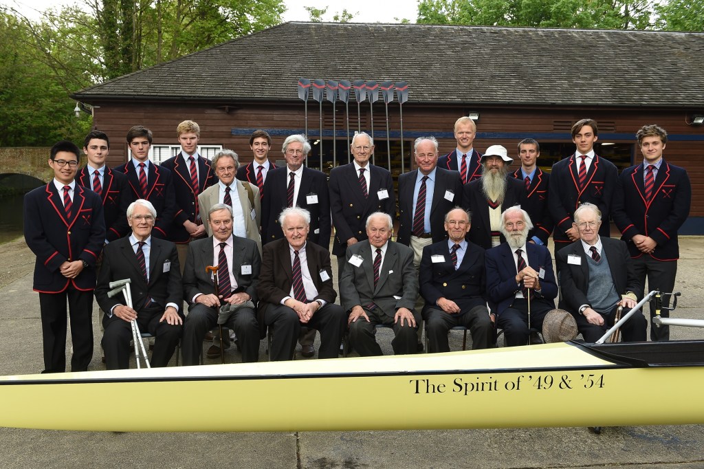 That led fittingly to the naming ceremony of the new School eight, gleaming on its trestles on the hard, and proudly bearing the name Spriit of ’49 & ’54. Champagne was duly poured over the bows by Presidents Breyfogle (’49) and Sutcliffe (’54) – without any unseemly shaking and squirting, thus leaving some for a quiet tipple afterwards.