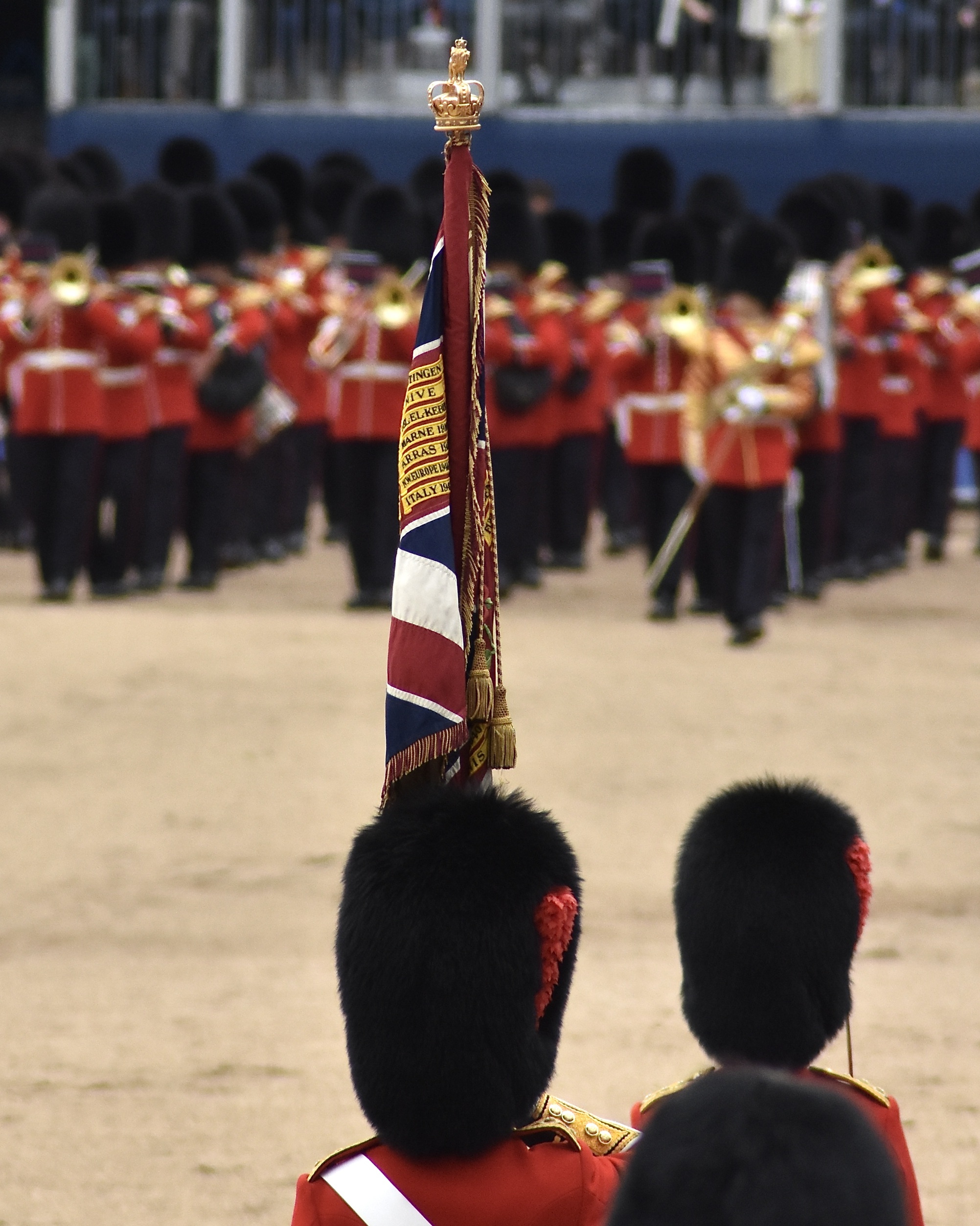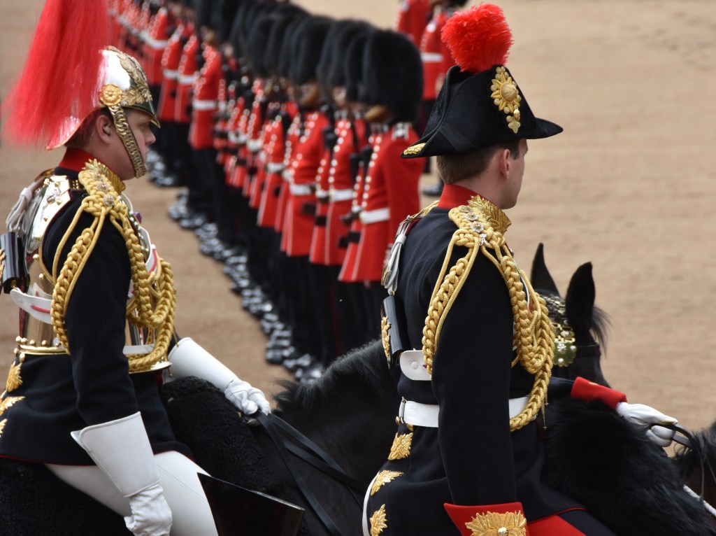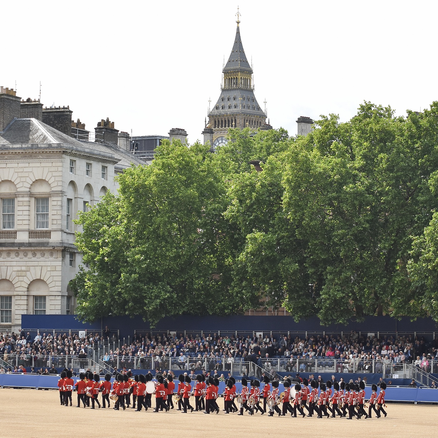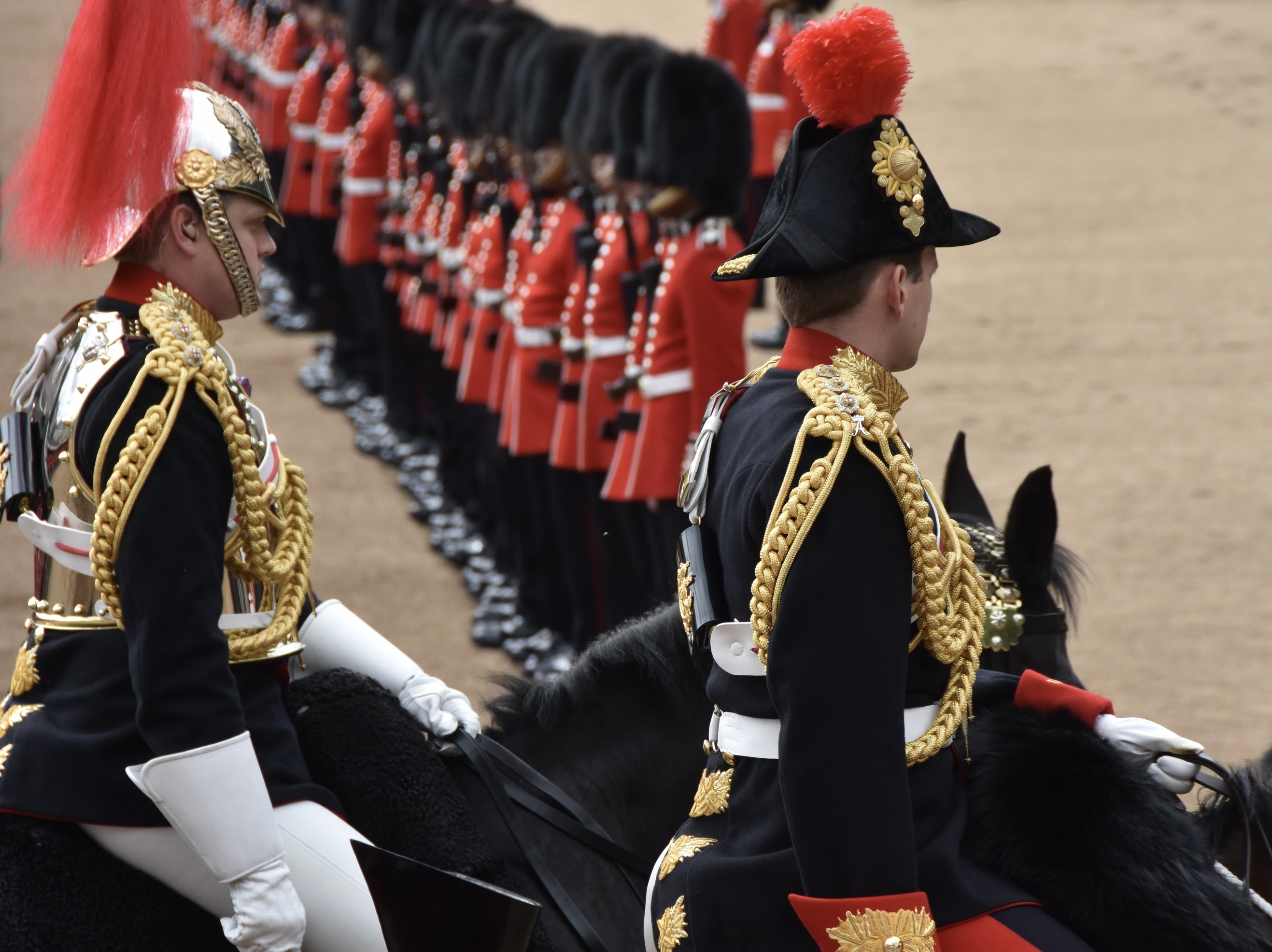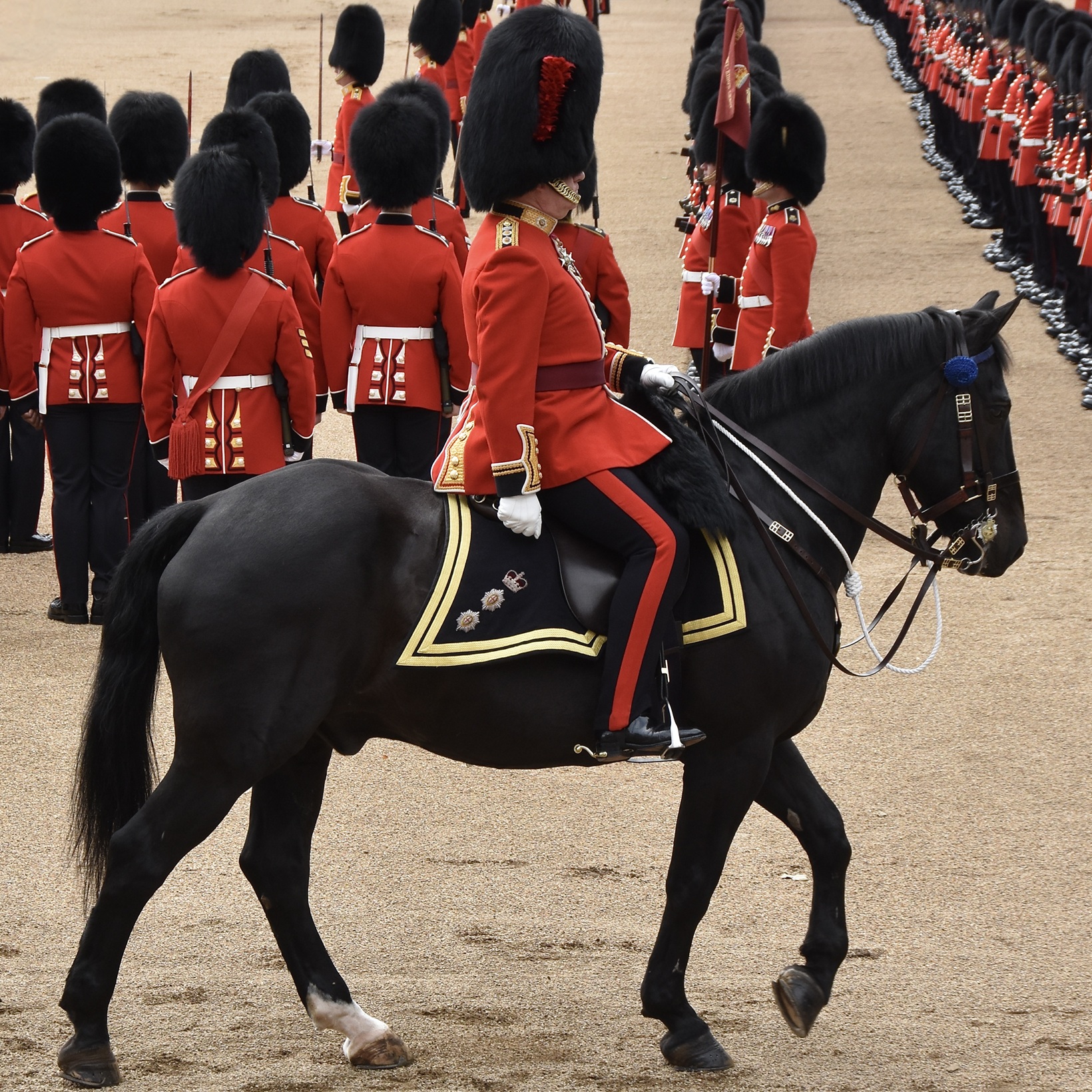 The Household Division is made up of the Household Cavalry (the Life Guards and the Blues & Royals) and five regiments of foot guards (Grenadier Guards, Coldstream Guards, Scots Guards, Irish Guards and Welsh Guards). For Trooping the Colour, they are joined by the King’s Troop, Royal Horse Artillery, a mounted ceremonial battery.