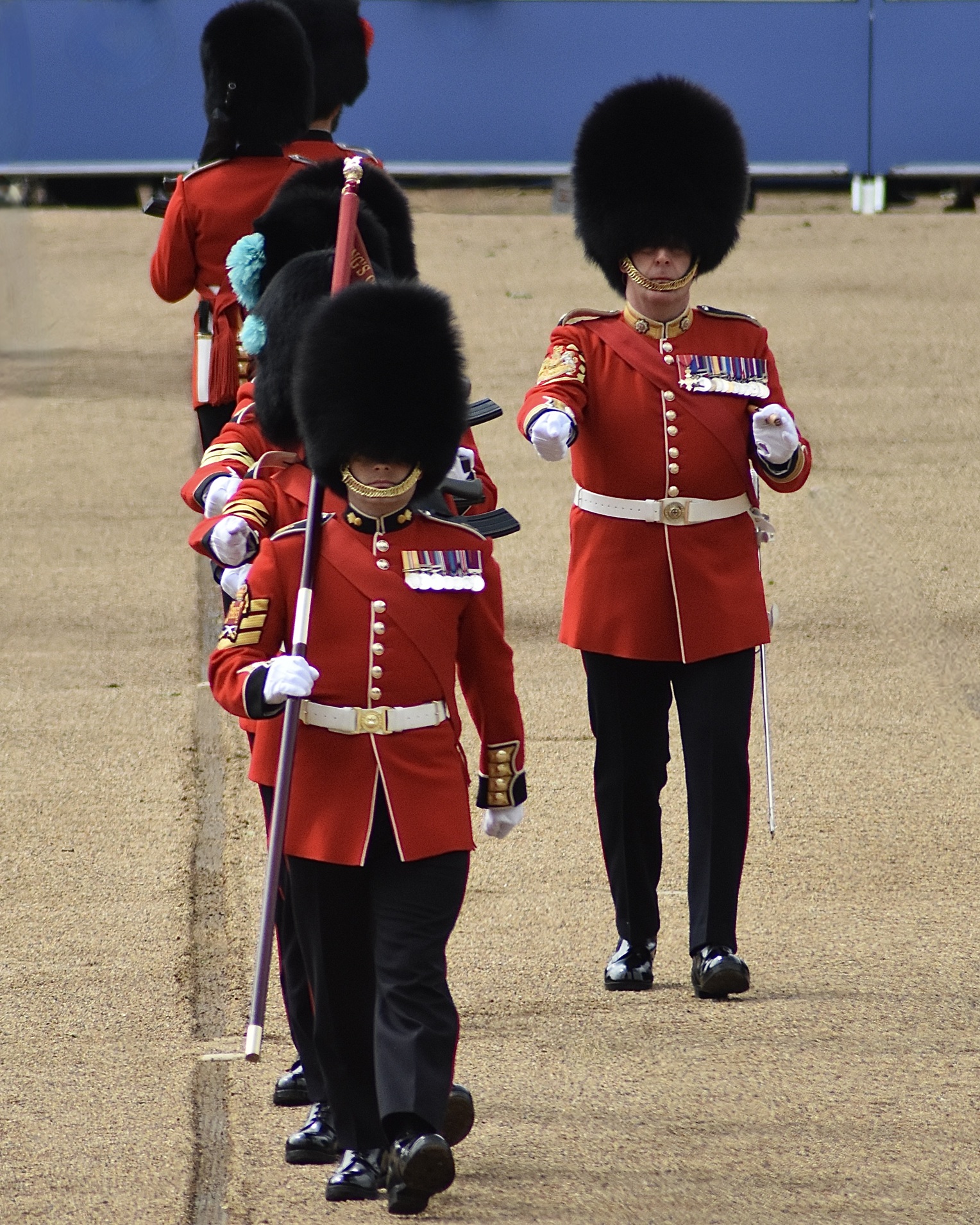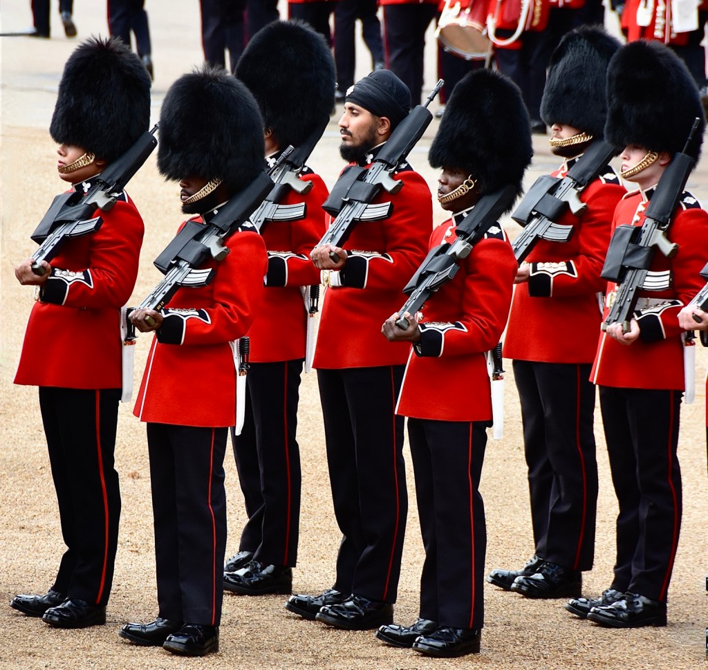 The Colonel whose review it is, Lieutenant General Sir James Bucknall, Colonel of the Coldstream Guards. The regiment is the only one in the Household Division without a Royal Colonel. Sir James wears the insignia of a colonel despite the fact that he is a higher ranking lieutenant general. Major General James Bowder, General Officer Commanding, London District and the Major General commanding the Household Division.Non-commissioned officers (NCOs) of the Blues & Royals (left) and the Life Guards (right). NCOs and warrant officers of the Household Cavalry do not wear rank insignia on their full dress uniforms. Rank is indicated by a system of aiguillettes (the ornamental braided cord with metal tips).A full sergeant of the Irish Guards.An ensign (Guards’ argo for 2nd Lieutenant) of the Scots Guards.Guests from the Royal Australian Regiment look on.Some of the 300 musicians from the Massed Bands of the Household Division. Also taking part were over 1350 soldiers of the Household Division and King’s Troop, Royal Horse Artillery. Behind the trees is the garden of 10 Downing Street and peeking above the trees is the parliamentary clocktower commonly called “Big Ben.”There were (I think) six companies of Foot Guards (each of three officers and 71 guardsmen) on parade. Each had its initial position marked by a Company pennant, one of which is being put into place here under the supervision of GSM Vern Stokes (right).Five of the six companies, Number 2 Guard to Number 6 Guard, are lined up here. Number 1 Guard is out of the picture on the left as it is the battalion trooping its colour, the Escort For The Colour.Sikh guardsmen are allowed to wear turbans in place of bearskins. Sikhs have long enjoyed a reputation as excellent soldiers and, in colonial times, they were enthusiastically recruited into the British Indian Army.