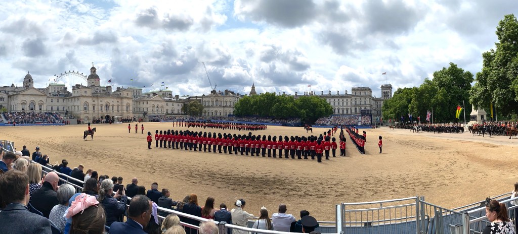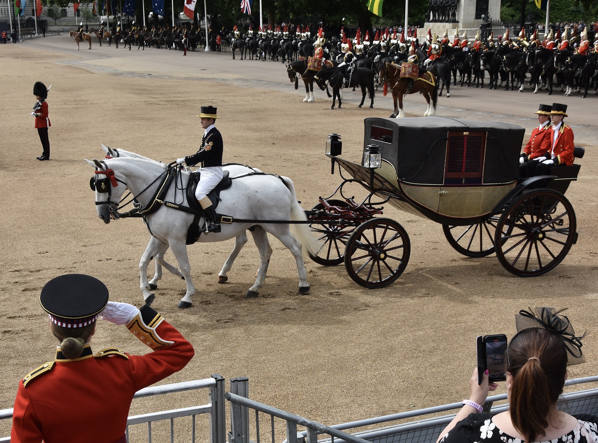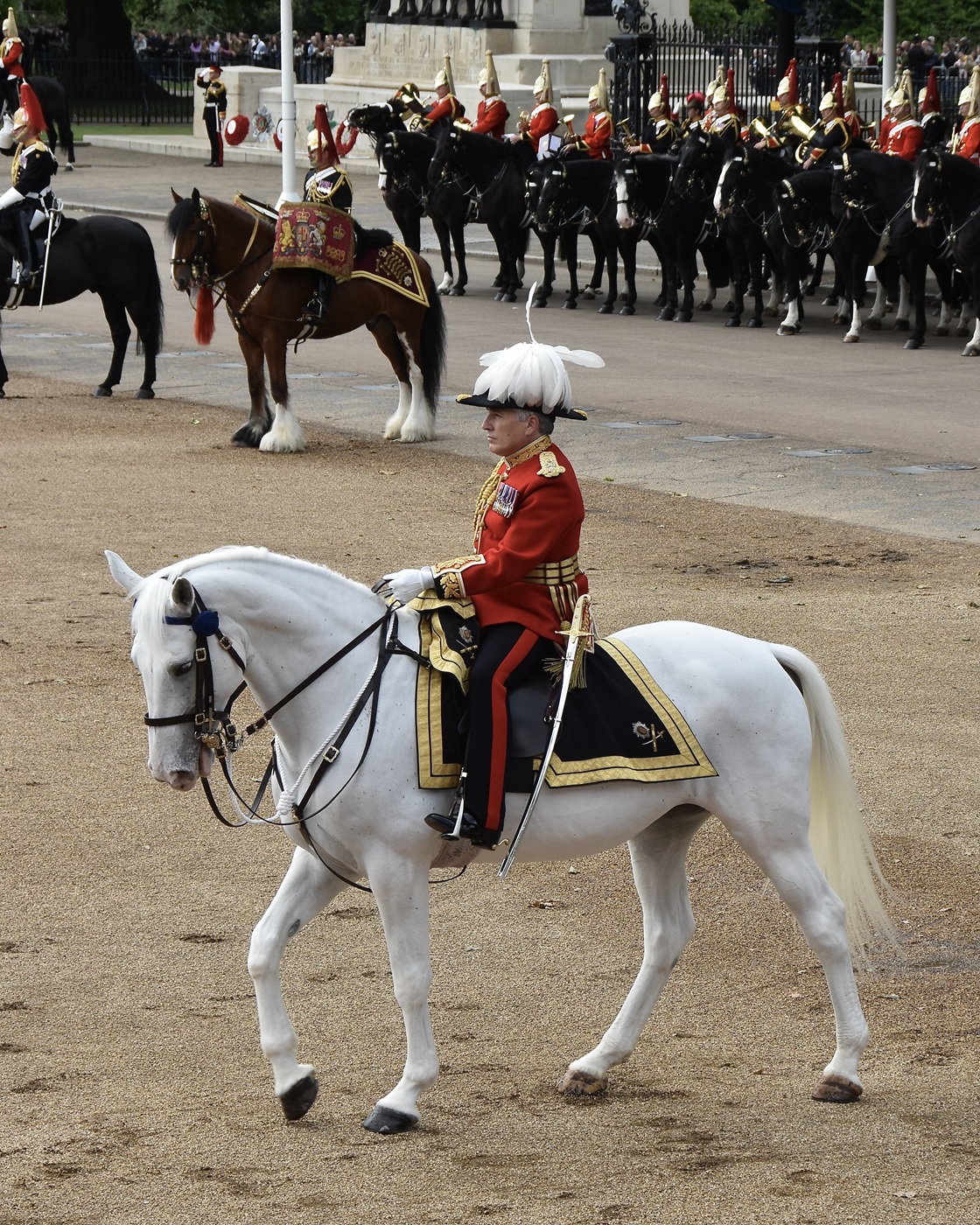 The Royal carriage, minus Royal occupants on this occasion. Clearly the King, not the Colonel, will carry out the inspection on 14 June.Baron Ashton of Hyde, The Master of the Horse, one whose primarily ceremonial role is to attend the sovereign on state occasions, especially when the monarch is on horseback.In red, a lieutenant colonel of the Irish Guards and, in blue, a colonel of the Blues & Royals.Captains of the Blues & Royals. I do not know why the officer on the right is wearing a bicorn hat.The Colonel then returned to the royal dias and remained mounted while the massed bands then “trooped” before him in slow and in quick time.Were there 76 of these?It was finally time to Troop the Colour.