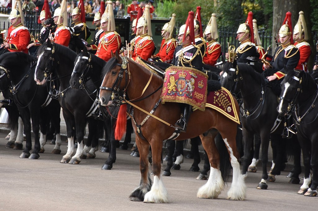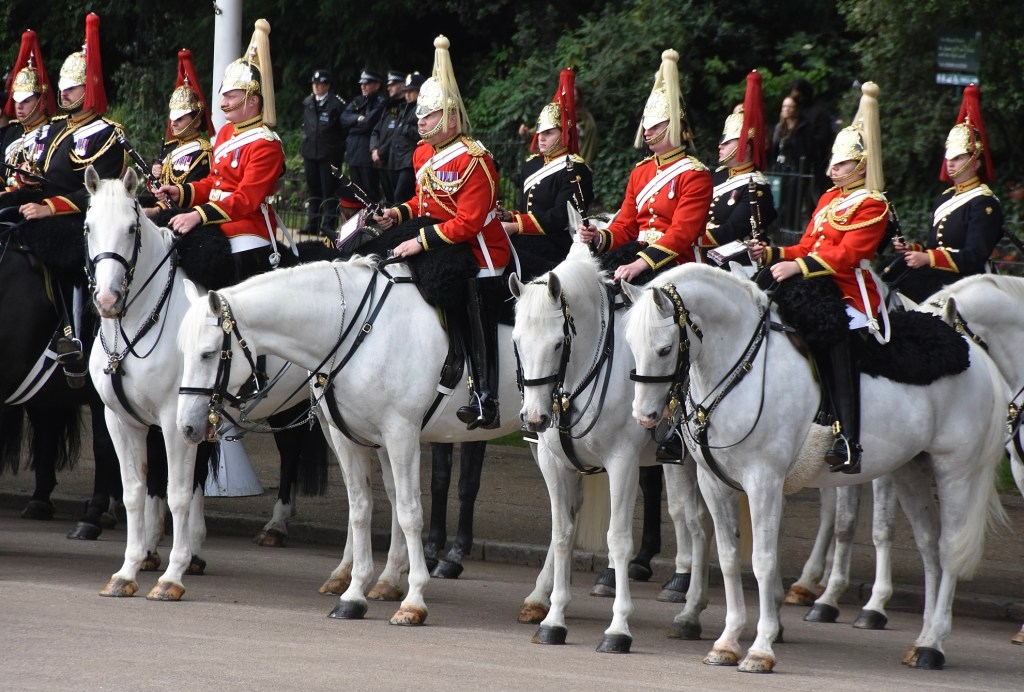 The horses used by the Household Cavalry are known as Cavalry Blacks. They are typically Irish-bred with thoroughbred and Irish Draught breeding and are selected for their size, conformation and temperament. The large and powerful drum horses are usually Shire or Clydesdale breeds. They lead the Mounted Band of the Household Cavalry, carrying two solid silver kettle drums and a drummer.The Life Guards are in red, the Blues & Royals in Blue. Trumpeters ride “grey” (white) horses, a colour chosen to help mark them out in the chaos of battle where the trumpeters would have communicated orders.