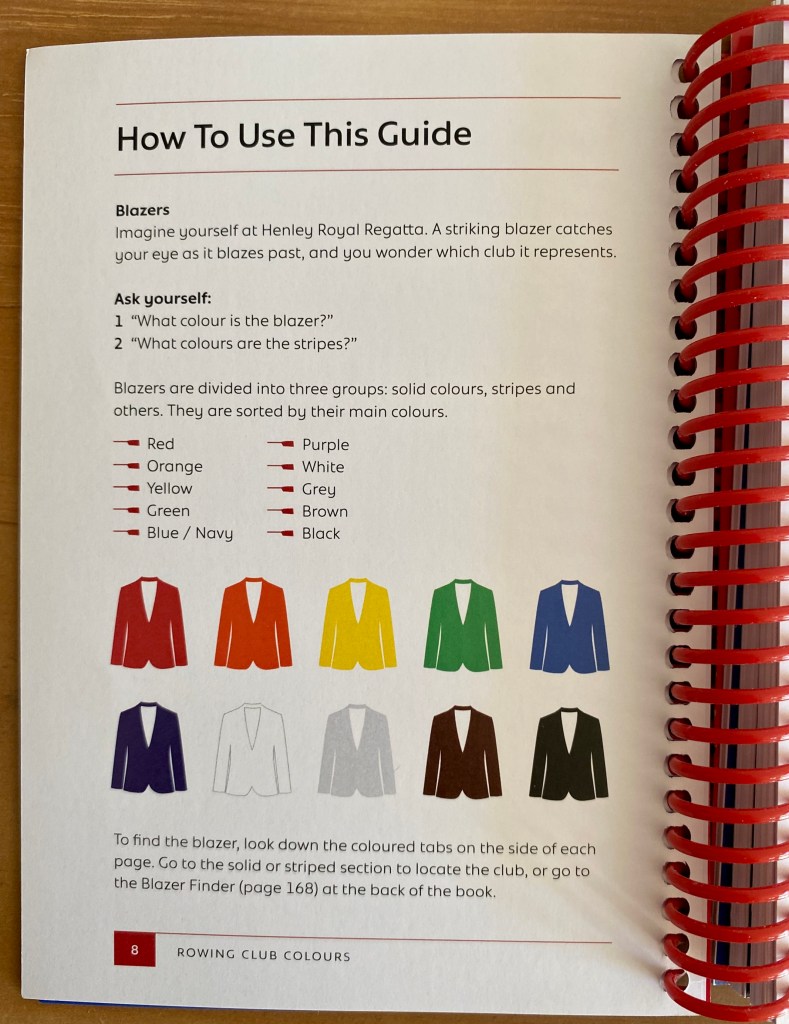 This handy little guide by rower Jenifer Andersen has been cleverly designed for easy use by even the most enthusiastic Pimm’s drinker at the end of a long day in the Fawley Bar. The spiral bound book fits easily in a handbag or blazer pocket and the clear and simple graphics showing over 120 blazers are handily arranged by colour.
