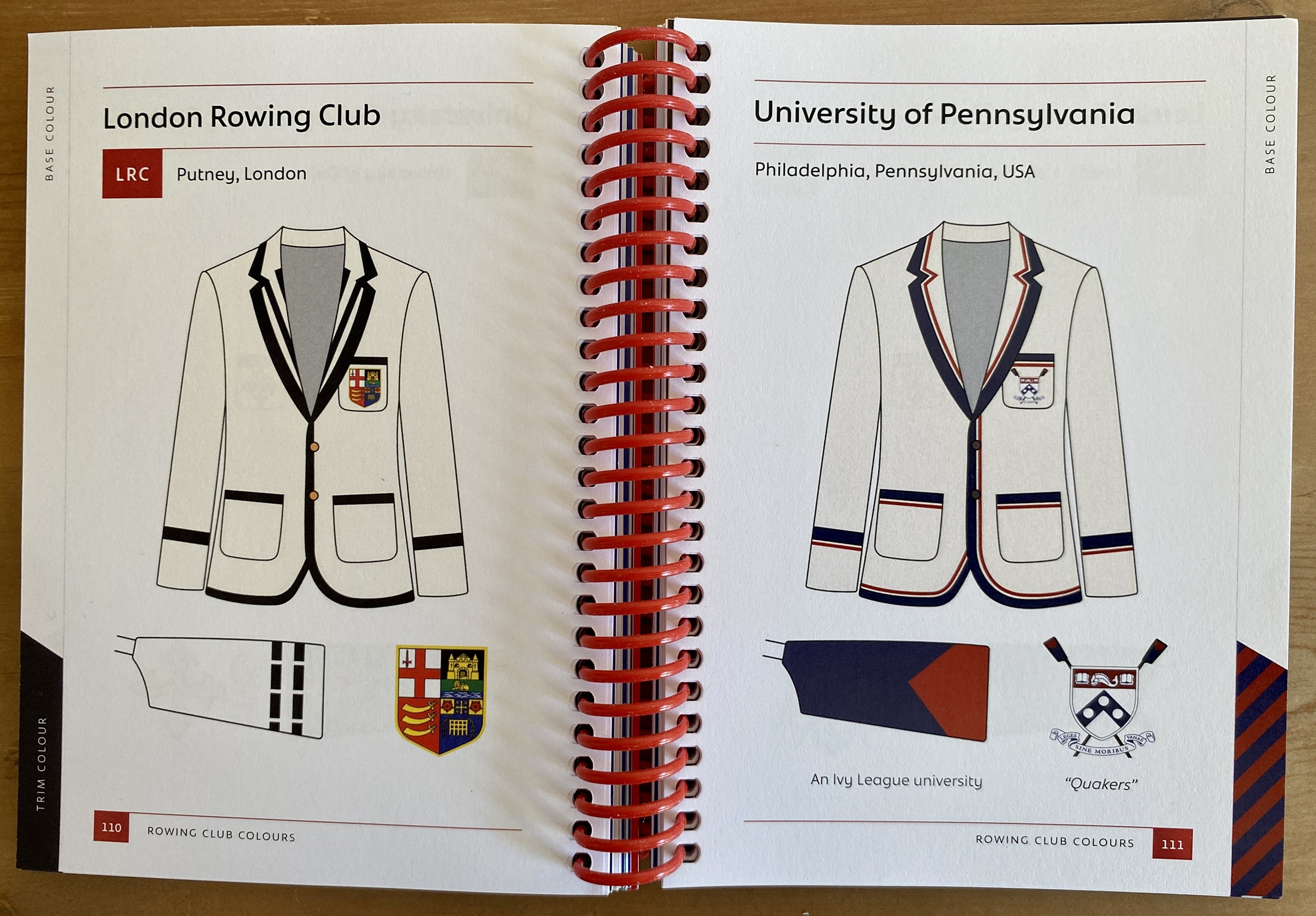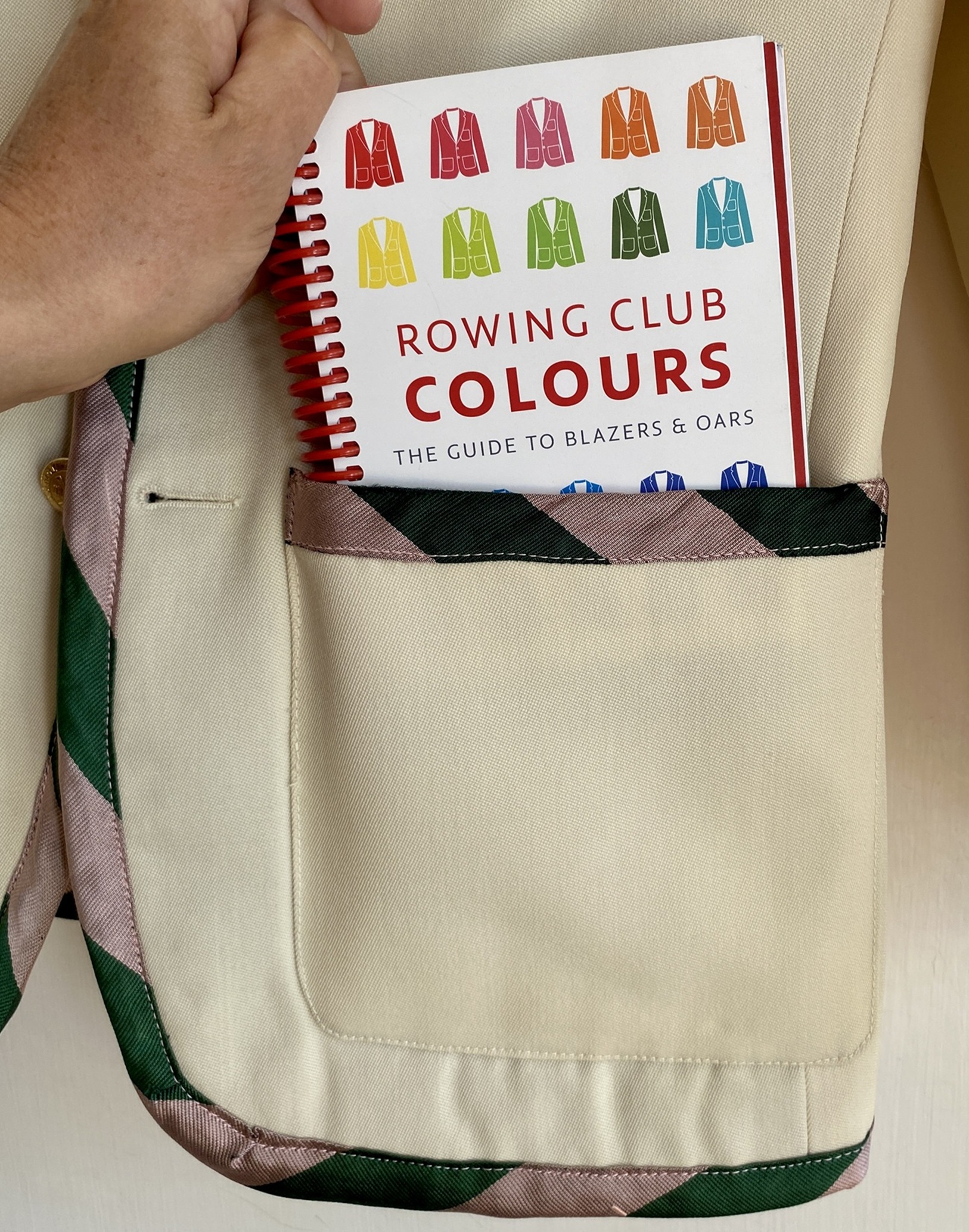 This handy little guide by rower Jenifer Andersen has been cleverly designed for easy use by even the most enthusiastic Pimm’s drinker at the end of a long day in the Fawley Bar. The spiral bound book fits easily in a handbag or blazer pocket and the clear and simple graphics showing over 120 blazers are handily arranged by colour.