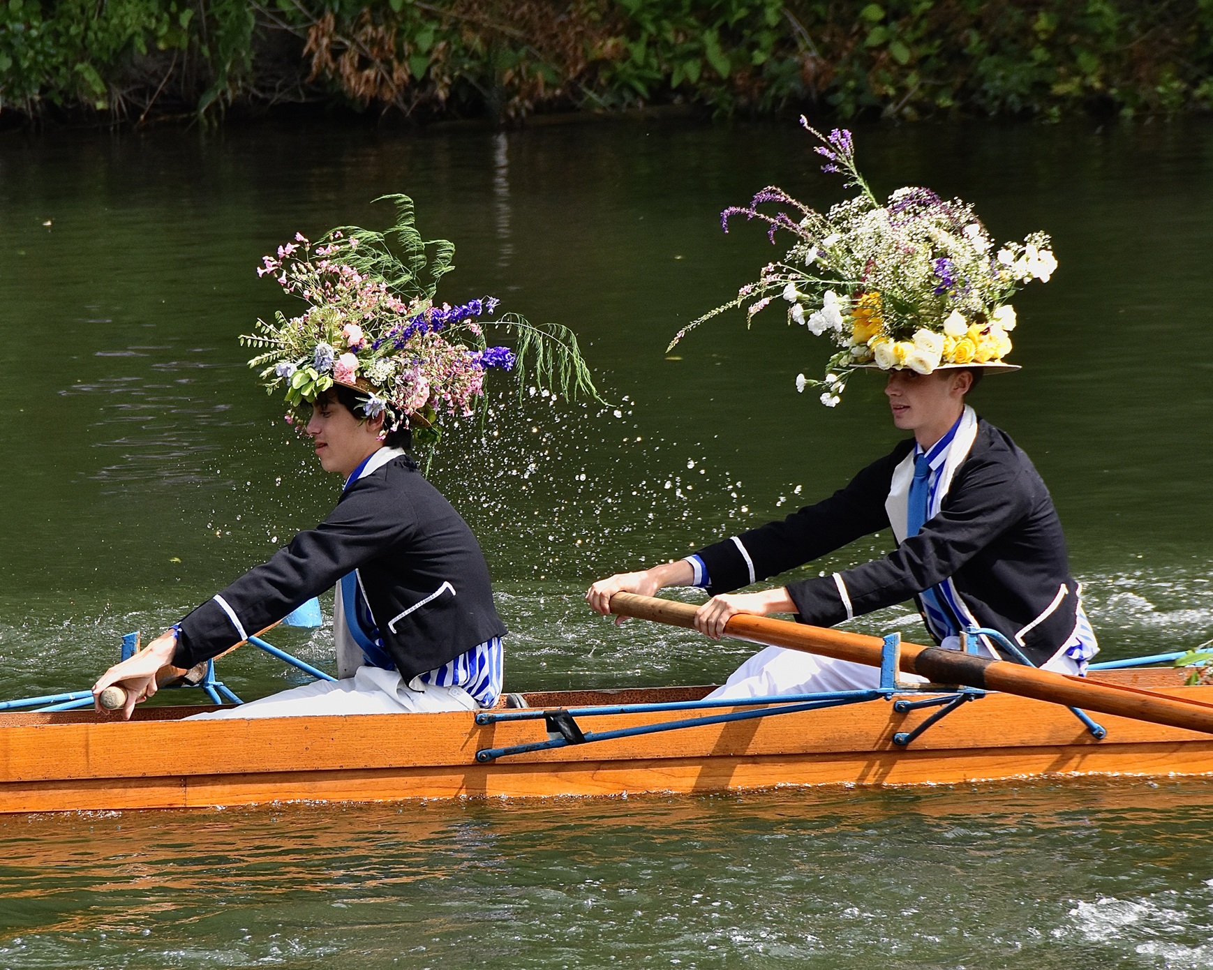 All the rowers are dressed in the uniform of eighteenth-century midshipmen, with the cox dressed as a captain or other senior naval officer from Britain’s naval past. Most strikingly, the oarsmen wear straw boaters that have been extravagantly decorated with fresh flowers by their house matrons or “Dames.”