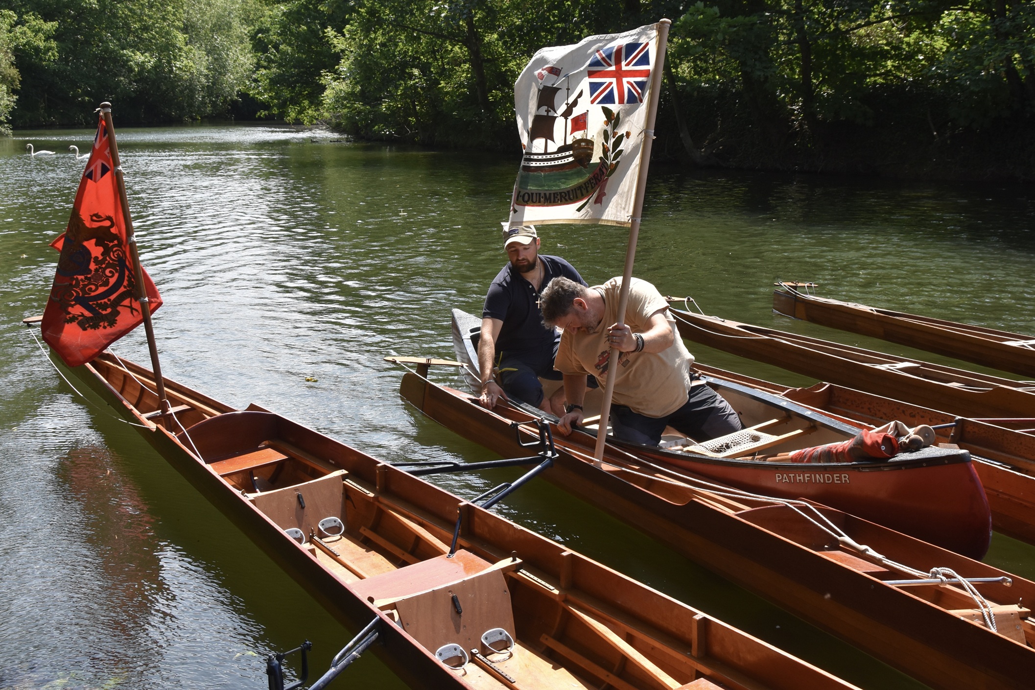 Boatmen fitting distinctive flags to five of the six “Lower Boats”.