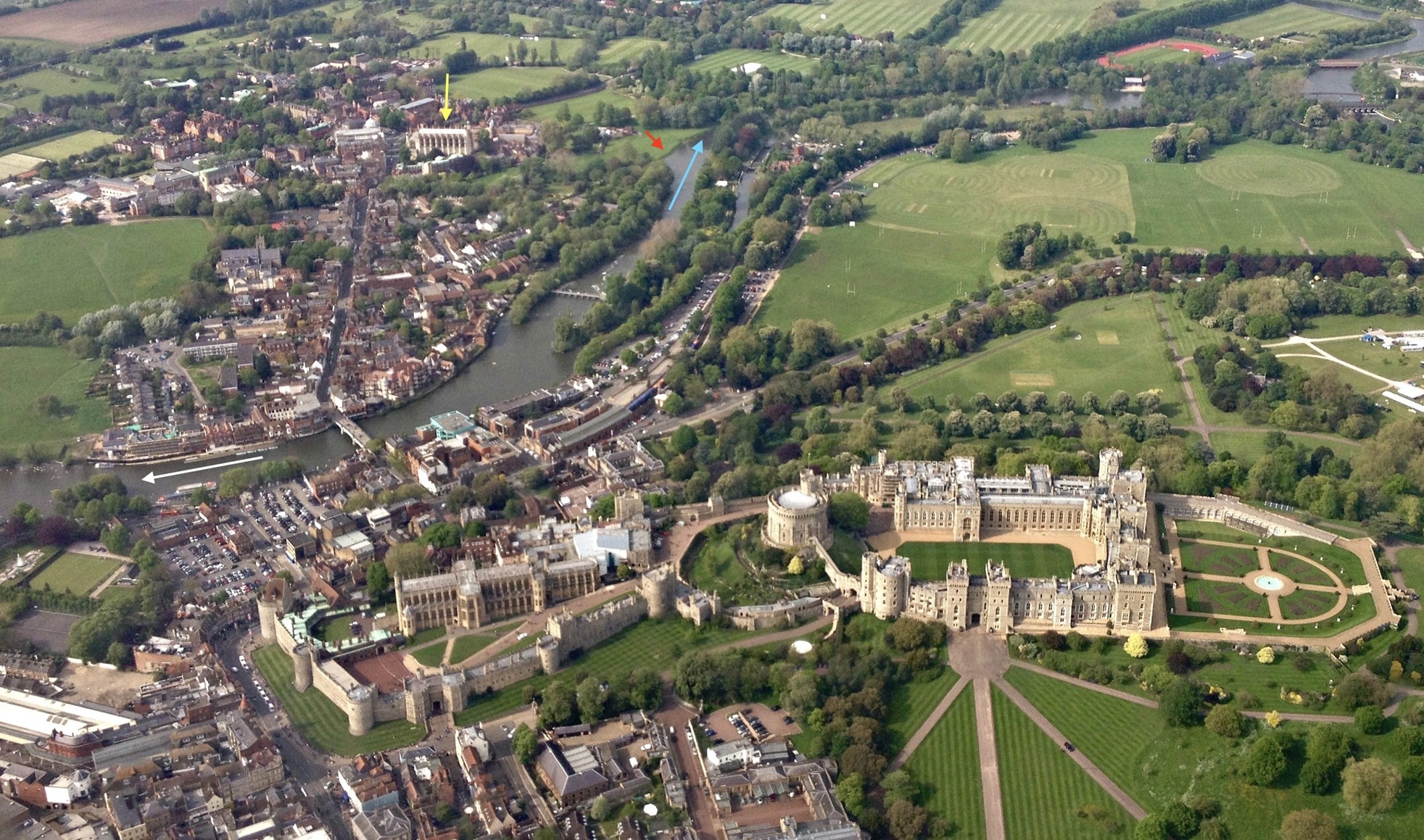 Eton (left) and Windsor (right) from the air. On the Eton side, the yellow arrow points to the centre of the school, the Eton College Chapel of 1441. The blue arrow shows the direction taken by this year’s Procession of Boats, white indicates where the Procession took place until the Second World War and red marks where parents and staff gather to watch the proceedings today.
