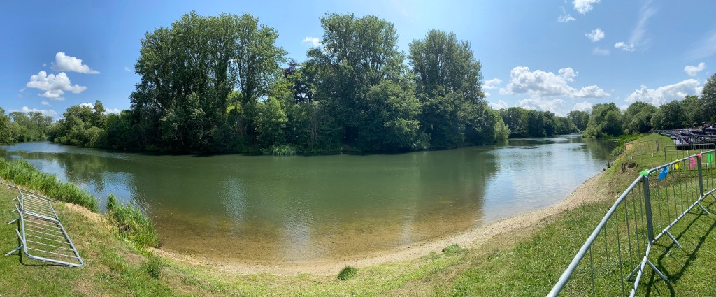 The stretch of the Thames behind Fellows’ Eyot where the Procession of Boats takes place. The boats row down from Masters’ Boathouse (out of sight on the left) and marshal downriver on the far right. At the appointed time, they will turn individually, process to where parents, alumni, friends and staff have gathered and briefly stop and stand and cheer Charles III, George III and Eton College.