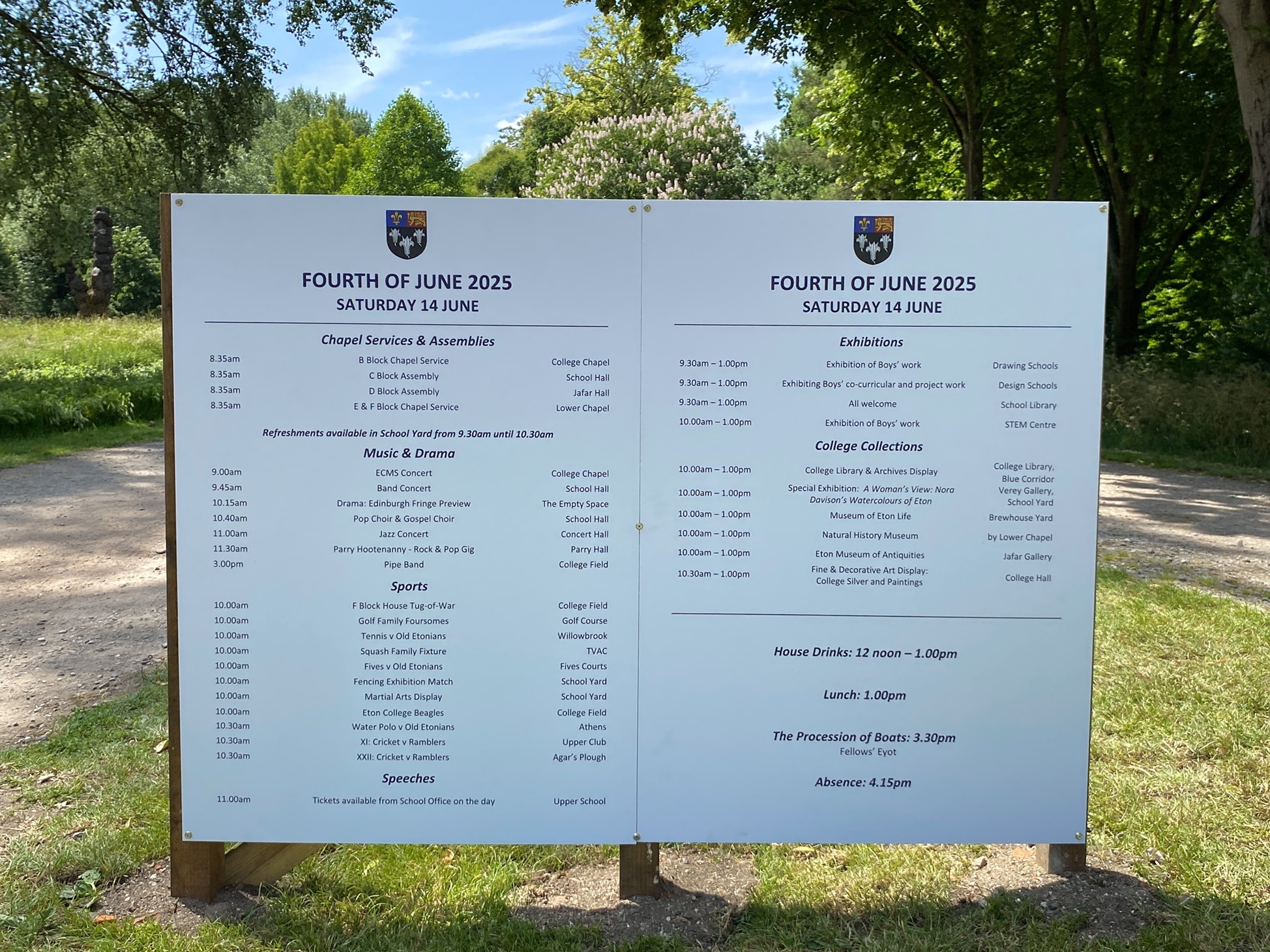The entertainments on The Fourth include a wide range of exhibitions, a promenade concert, a performance of speeches, a cricket match against Old Etonians, and most famously, The Procession of Boats.