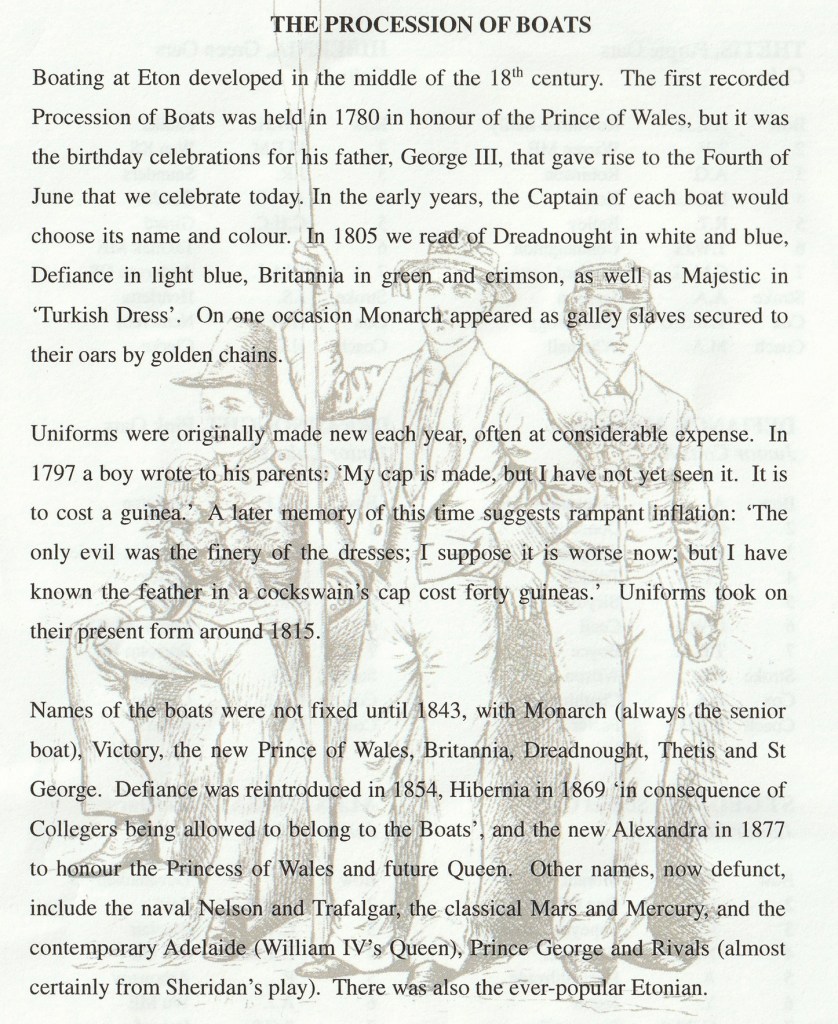 A short history of the Procession of Boats from this year’s official programme. The Collegers mentioned are King’s Scholars, boys with academic potential who have been awarded King’s Scholarships.