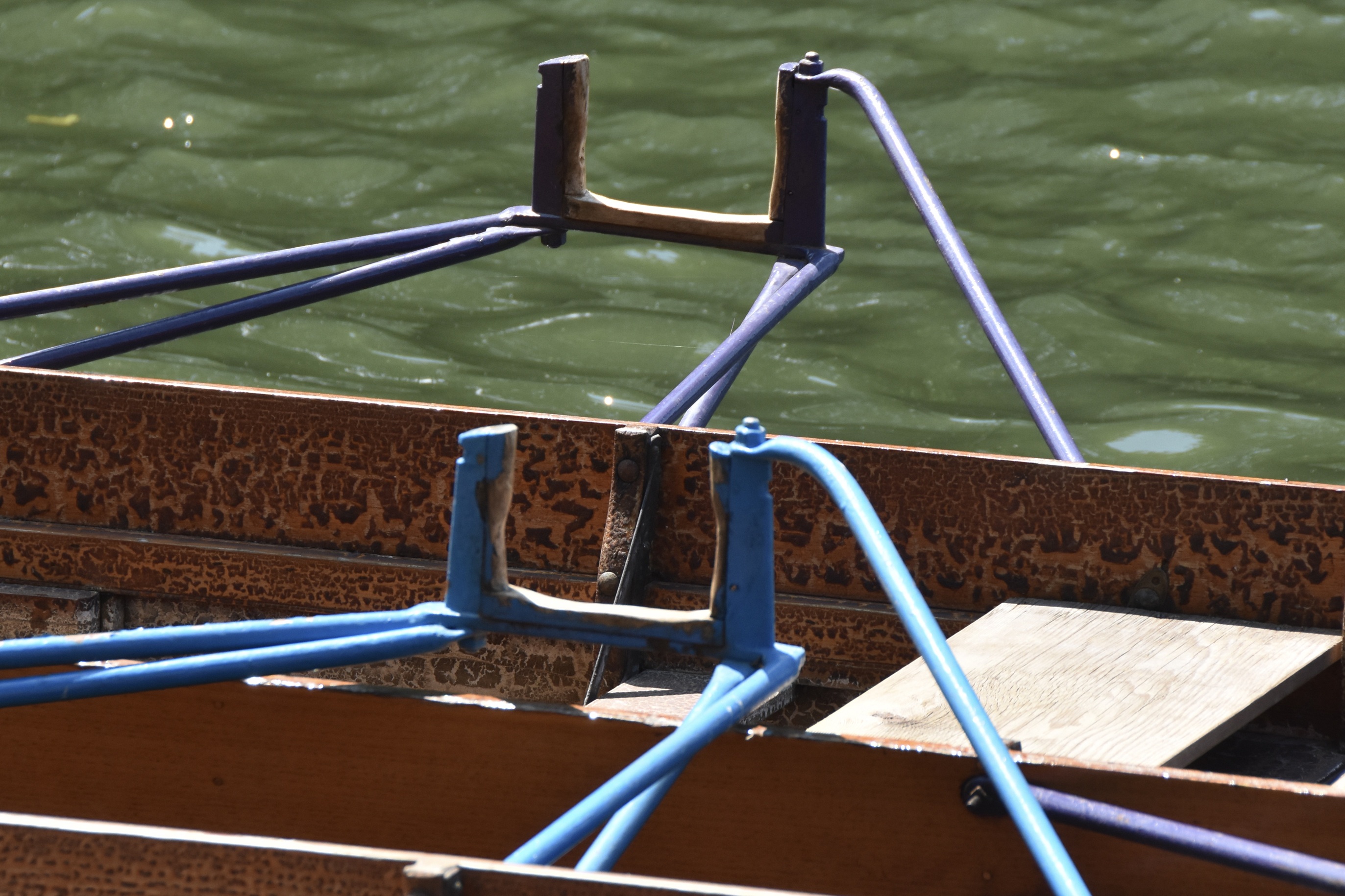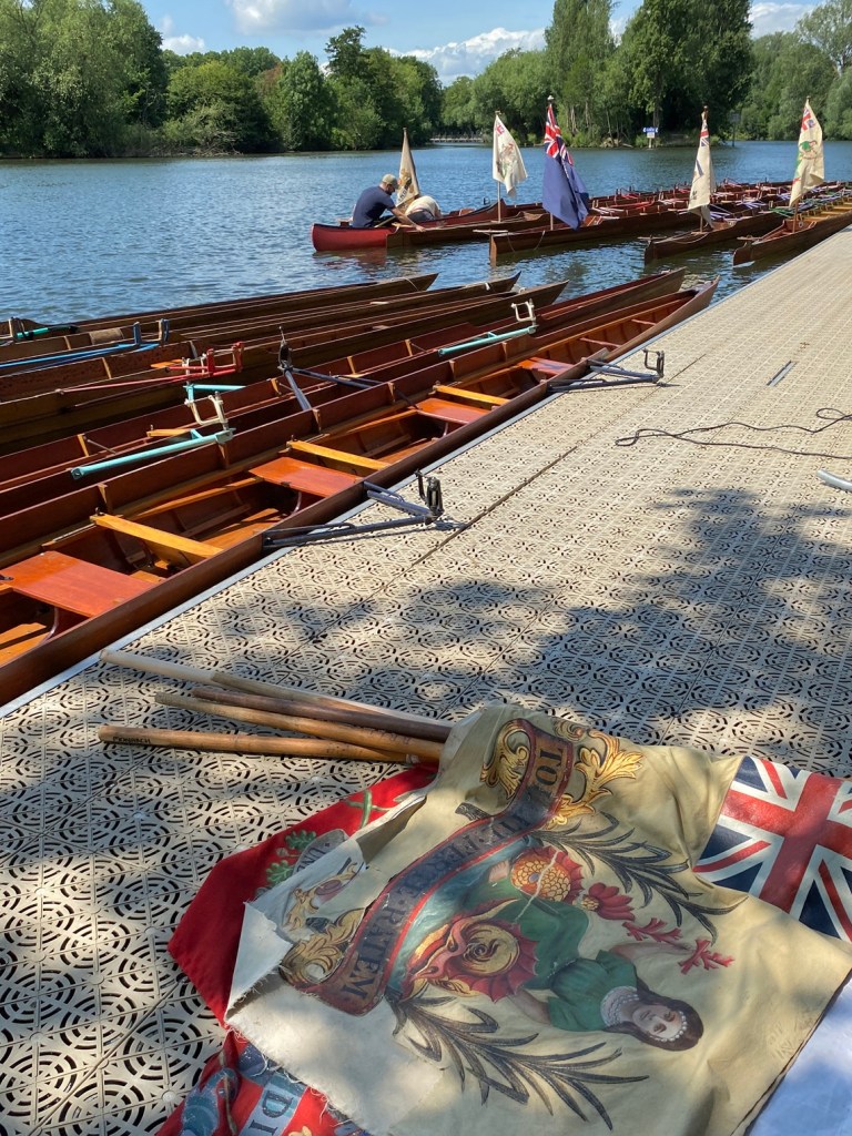 Both fixed pin and swivel rowlocks are on display here. The boat with the red riggers has “closed” the fixed pin gates with a piece of twine over the top. This would have been the usual practice when such rowlocks were in common use.
