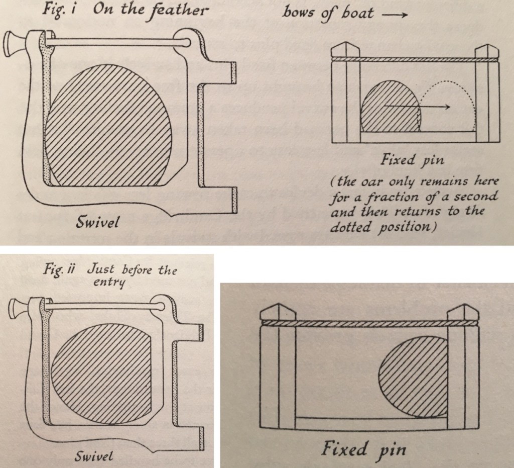 Diagrams from P. Haig Thomas and M.A. Nicholson’s book The English Style of Rowing (1958), showing how the oar moves in a fixed pin rowlock. In the Boat Race, they were last used by Cambridge in 1950 and Oxford in 1951.