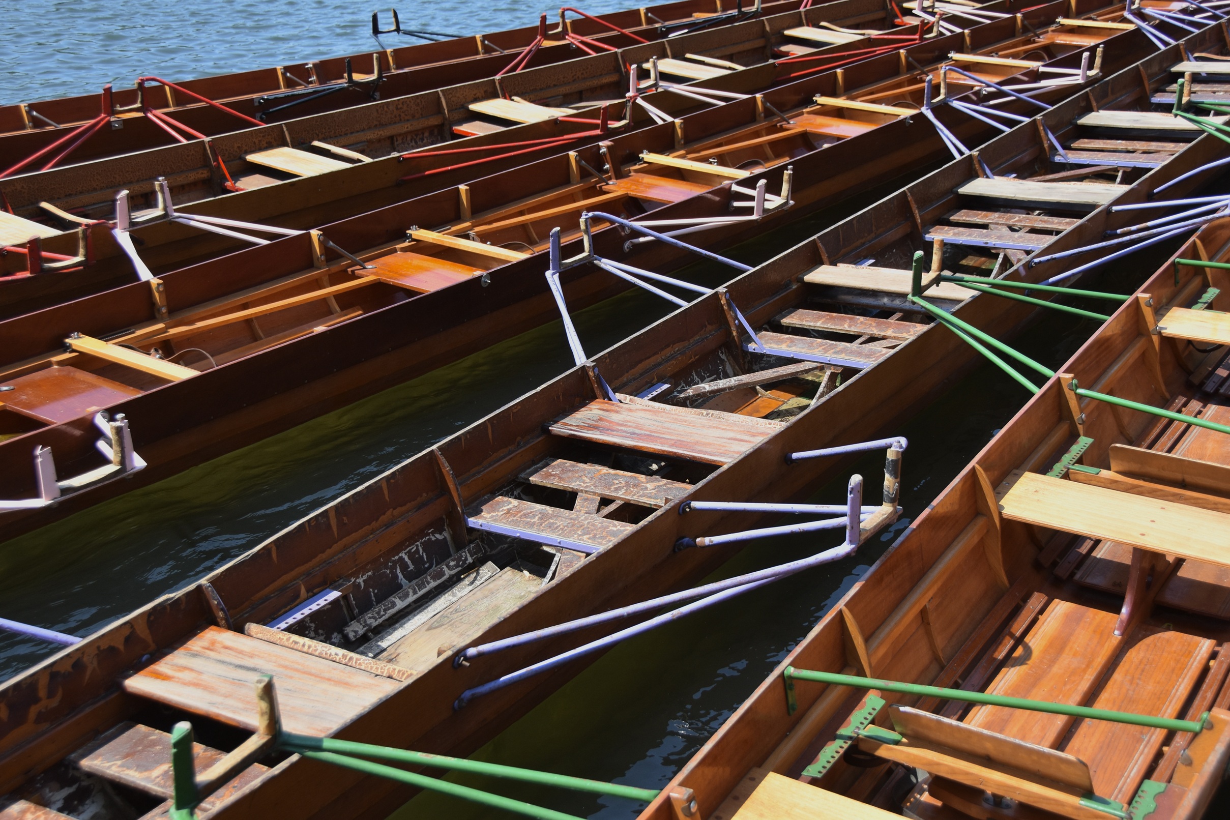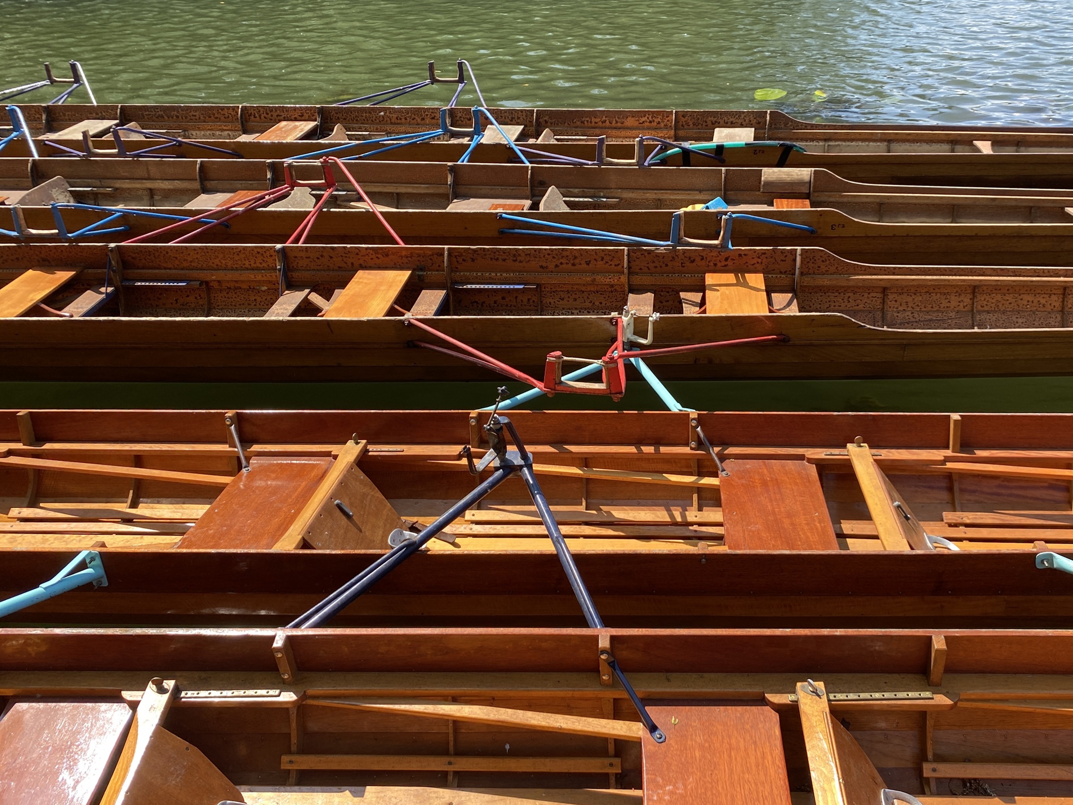 The ten wooden boats involved are fixed seat and most have fixed pin (as opposed to swivel) rowlocks. The blades have “needle” spoons and the leading boat is a ten-oar.