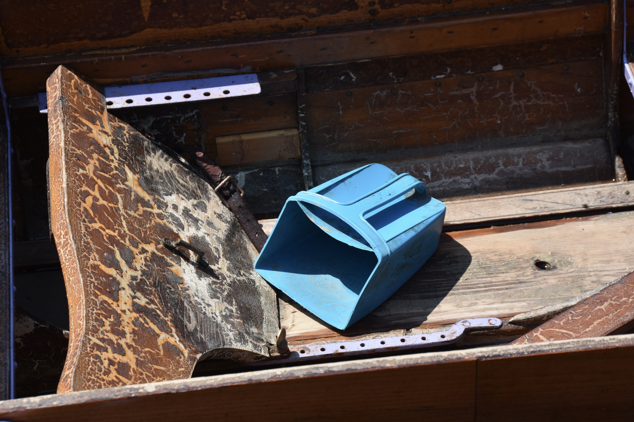 While the newest boat in the Procession was built as recently as 2005, some are very old and, being of clinker construction, take on water. Defiance (here with the mauve riggers) is particularly aged.