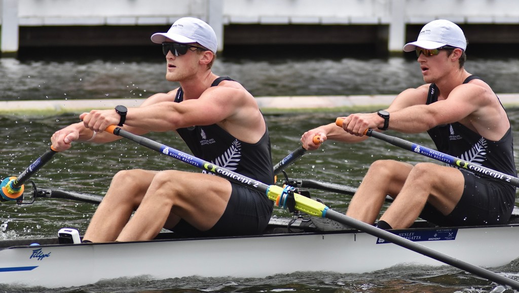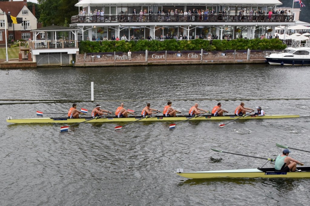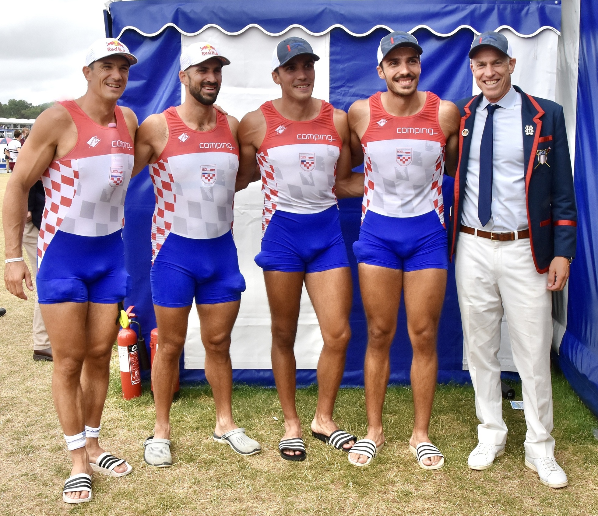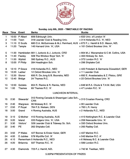 Hamill and Mason of Waiariki Rowing Club, New Zealand (pictured) beat Jones and Been, Rowing Canada, by 1 1/2 lengths in a semi-final of the Double Sculls (Premier Open Double Sculls).In a semi-final of the Fawley (Junior Open Quad Sculls) Hinksey Sculling School beat Molesey Boat Club by 3/4 length.Famously, Dutch student rowing blazers are passed for one intake of students to the next with cleaning and repair forbidden.The lightweights of Harvard University ‘A’, USA, rowed into a head wind to beat Amsterdamsche Studenten Roeivereeniging Nereus ‘A’, Netherlands, by 1/3 length in a semi-final of the Temple (Student Open Eights).In a semi-final of the Stewards’ (Premier Open Coulees Fours), the Croatian Rowing Federation (pictured) beat Oxford Brookes University and Leander Club by 2 1/2 lengths.The Croatian four, the Sinković brothers (left) and the Lončarić twins (right) pose with Henley Steward, Jamie Koven.The Windsor Boys’ School ‘A’ beat the Tideway Scullers’ School by 1 1/4 lengths in a semi-final of the Fawley (Junior Open Quad Sculls).Anastasiadou and Fitsiou of Nautical Club of Kastoria and Nautical Club of Mavrochori, Greece (pictured), beat Keto and Obukohwo of Thames Rowing Club and Twickenham Rowing Club by 1 1/2 lengths in a semi-final of the Stoner (Premier Women’s Double Sculls).Marlow Rowing Club beat Leander Club and Mercantile Rowing Club, Australia, by 2/3 length in a semi-final of the Prince of Wales (Intermediate Open Quad Sculls).Saturday’s weather was changeable with mild temperatures and light showers.London Rowing Club ‘A’ beat Leander Club by 1 3/4 lengths in a semi-final of the Thames (Club Open Eights).Oxford Brookes goes afloat for their race in the Bridge against Cambridge.In a semi-final of the Bridge (Intermediate Women’s Eights), Oxford Brookes University ‘A’ beat Cambridge University by a Canvas.The new trophy for a new event, The Bridge Challenge Plate.This year’s Cambridge Blue Boat entered not the Temple or the Ladies but the Premier Open Eights event, the Grand, a race usually for crews of internationals, not students. At the Mile, Hollandia Roeiclub, Netherlands, had a slight lead.Throughout the race, the Dutch maintained a lead of between 1/3 and 3/4 of a length. At the finish, Hollandia Roeiclub, Netherlands, beat Cambridge University by 1/3 length.This year, those who had been members of the Stewards’ Enclosure for fifty years or more received a commemorative badge and there were a surprisingly large number on display. This particular one belongs to Kensington RC and Auriol Kensington RC stalwart, Jimmy Pigden who started rowing at the age of 14 in 1954.The biggest upset of the day came in a semi-final of the Diamonds (Premier Open Single Sculls) where Oliver Zeidler of Germany, the 2024 Paris Olympic Champion, raced Finlay Hamill of New Zealand. Starting at a high rate, Zeidler possessed a lead of 2 ½ lengths at the Barrier, but as the race progressed, he looked uncomfortable and Hamill passed him at the Mile.Hamill of Waikato Rowing Club, New Zealand, beat Zeidler of Frankfurter Rudergesellschaft Germania 1869 e.V., Germany by 1 length.Zeidler in defeat.