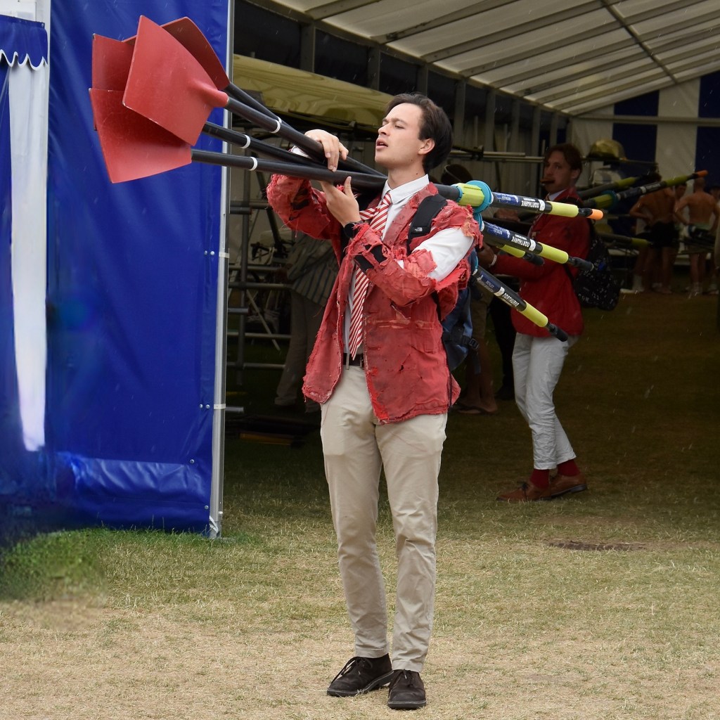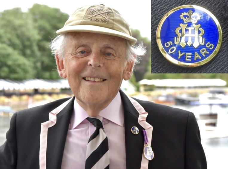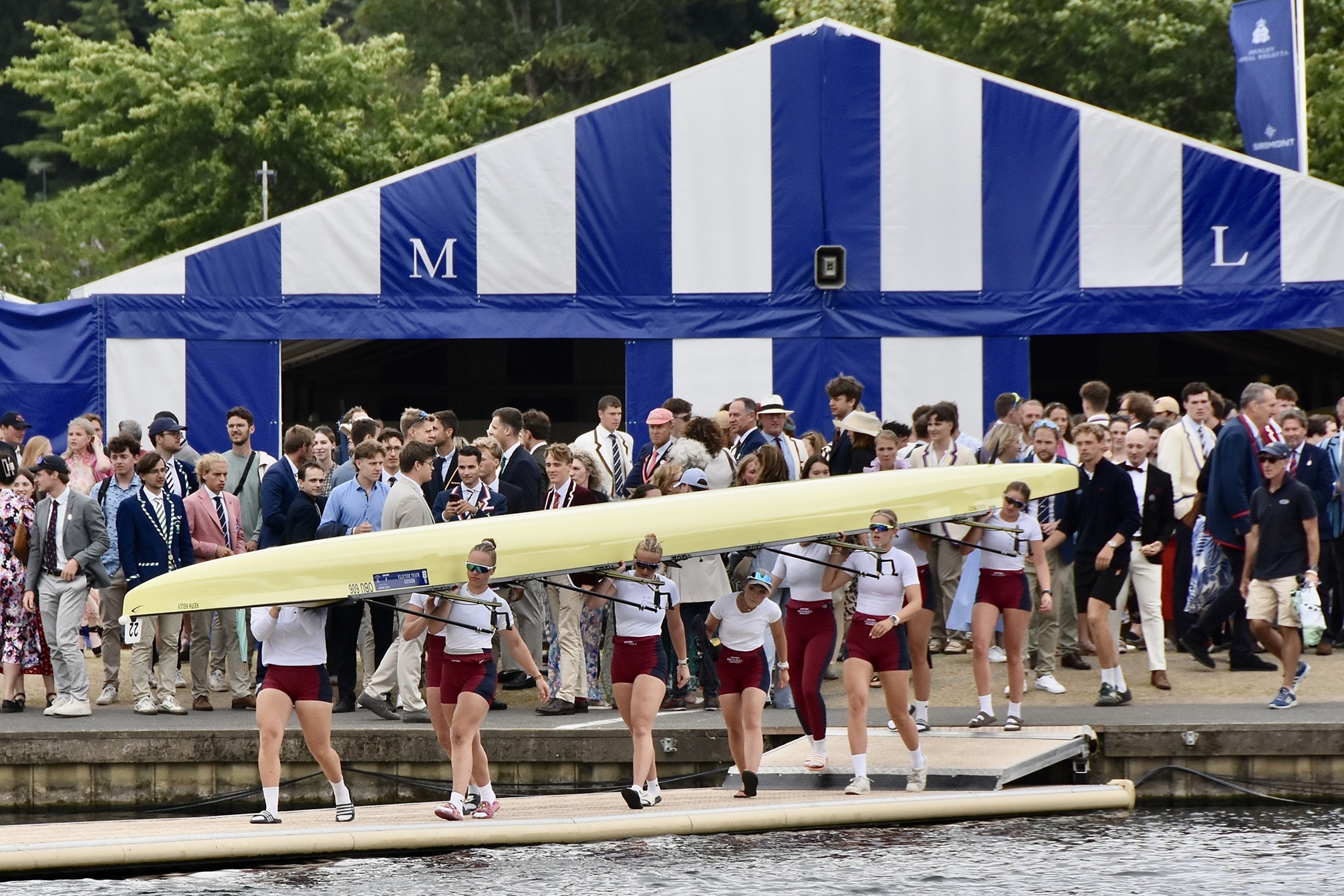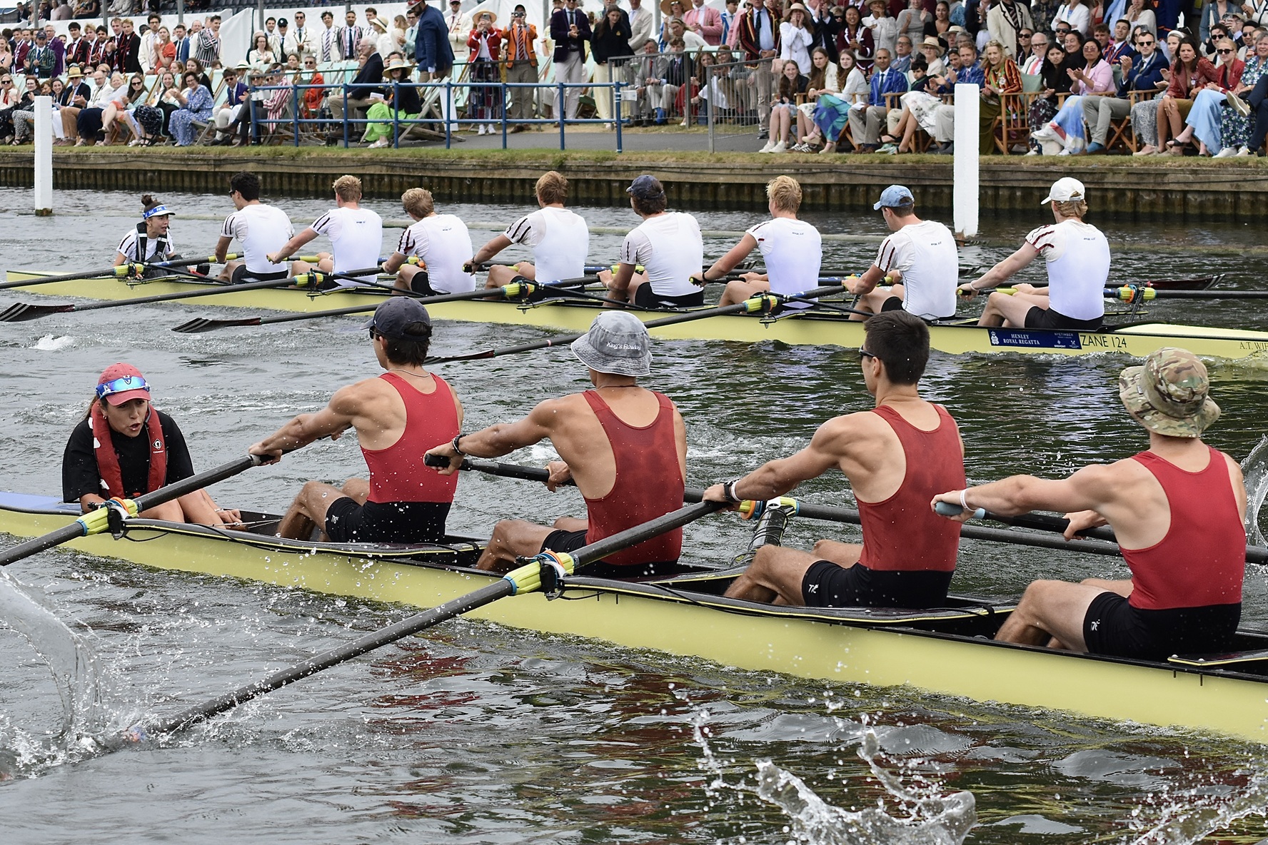 Hamill and Mason of Waiariki Rowing Club, New Zealand (pictured) beat Jones and Been, Rowing Canada, by 1 1/2 lengths in a semi-final of the Double Sculls (Premier Open Double Sculls).In a semi-final of the Fawley (Junior Open Quad Sculls) Hinksey Sculling School beat Molesey Boat Club by 3/4 length.Famously, Dutch student rowing blazers are passed for one intake of students to the next with cleaning and repair forbidden.The lightweights of Harvard University ‘A’, USA, rowed into a head wind to beat Amsterdamsche Studenten Roeivereeniging Nereus ‘A’, Netherlands, by 1/3 length in a semi-final of the Temple (Student Open Eights).In a semi-final of the Stewards’ (Premier Open Coulees Fours), the Croatian Rowing Federation (pictured) beat Oxford Brookes University and Leander Club by 2 1/2 lengths.The Croatian four, the Sinković brothers (left) and the Lončarić twins (right) pose with Henley Steward, Jamie Koven.The Windsor Boys’ School ‘A’ beat the Tideway Scullers’ School by 1 1/4 lengths in a semi-final of the Fawley (Junior Open Quad Sculls).Anastasiadou and Fitsiou of Nautical Club of Kastoria and Nautical Club of Mavrochori, Greece (pictured), beat Keto and Obukohwo of Thames Rowing Club and Twickenham Rowing Club by 1 1/2 lengths in a semi-final of the Stoner (Premier Women’s Double Sculls).Marlow Rowing Club beat Leander Club and Mercantile Rowing Club, Australia, by 2/3 length in a semi-final of the Prince of Wales (Intermediate Open Quad Sculls).Saturday’s weather was changeable with mild temperatures and light showers.London Rowing Club ‘A’ beat Leander Club by 1 3/4 lengths in a semi-final of the Thames (Club Open Eights).Oxford Brookes goes afloat for their race in the Bridge against Cambridge.In a semi-final of the Bridge (Intermediate Women’s Eights), Oxford Brookes University ‘A’ beat Cambridge University by a Canvas.The new trophy for a new event, The Bridge Challenge Plate.This year’s Cambridge Blue Boat entered not the Temple or the Ladies but the Premier Open Eights event, the Grand, a race usually for crews of internationals, not students. At the Mile, Hollandia Roeiclub, Netherlands, had a slight lead.Throughout the race, the Dutch maintained a lead of between 1/3 and 3/4 of a length. At the finish, Hollandia Roeiclub, Netherlands, beat Cambridge University by 1/3 length.This year, those who had been members of the Stewards’ Enclosure for fifty years or more received a commemorative badge and there were a surprisingly large number on display. This particular one belongs to Kensington RC and Auriol Kensington RC stalwart, Jimmy Pigden who started rowing at the age of 14 in 1954.The biggest upset of the day came in a semi-final of the Diamonds (Premier Open Single Sculls) where Oliver Zeidler of Germany, the 2024 Paris Olympic Champion, raced Finlay Hamill of New Zealand. Starting at a high rate, Zeidler possessed a lead of 2 ½ lengths at the Barrier, but as the race progressed, he looked uncomfortable and Hamill passed him at the Mile.Hamill of Waikato Rowing Club, New Zealand, beat Zeidler of Frankfurter Rudergesellschaft Germania 1869 e.V., Germany by 1 length.Zeidler in defeat.
