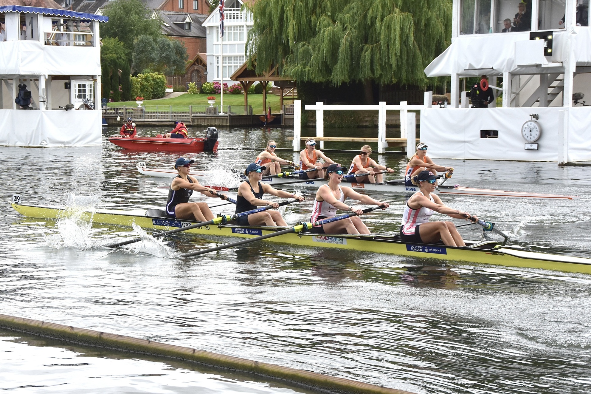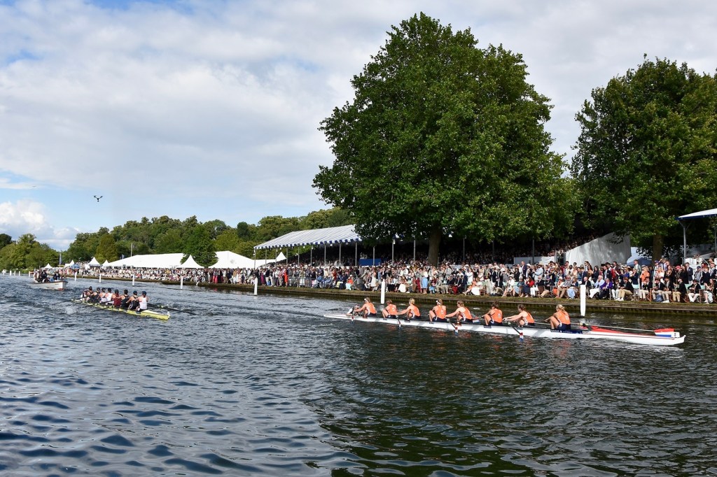 The contest unravelled in compelling fashion as The Dutch National Team and the British senior four – moonlighting as Leander Club and Reading University – went head to head. Hollandia were a length up by the Barrier, but what transpired down the remainder of the course was a fascinating mix of grit, chaotic steering and repeated flag-waving warnings from the Umpire. With the Dutch a length up, the British were not able to claw that margin back…