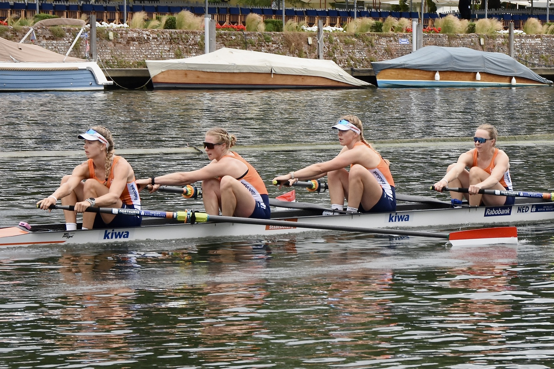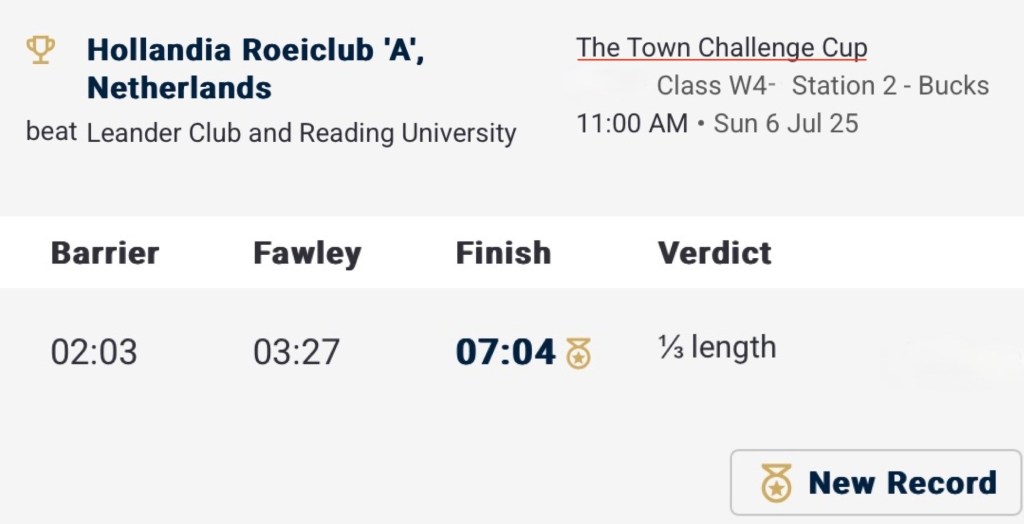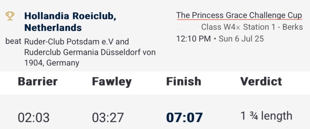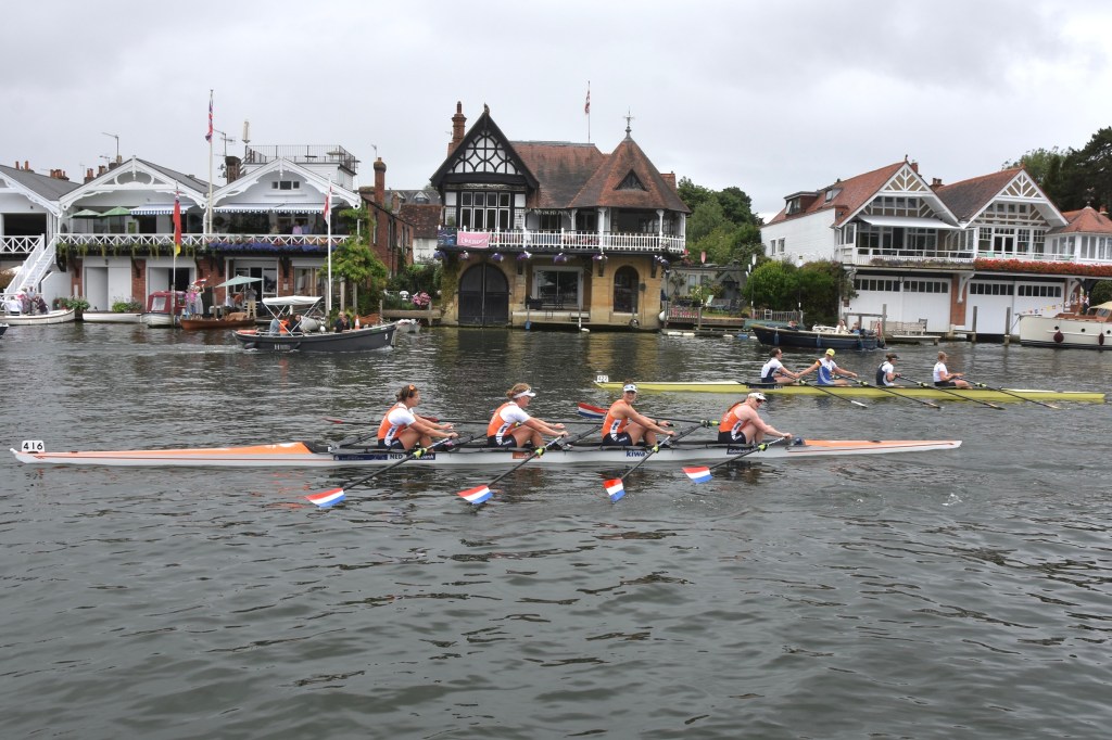 The prize giving was a warm and wet affair.In the Remenham, Hollandia reversed the result from the European Rowing Championships on 1 June (when they lost to the British by over two seconds) and beat the home crew by 3/4 length.Hollandia in control.The last few strokes.Five hours earlier, four of the crew had also won the Town, the premier women’s coxless four race.Hollandia on their way to the start.Hollandia on their way to the finish.A second trophy for this four with a record time of 7:04.