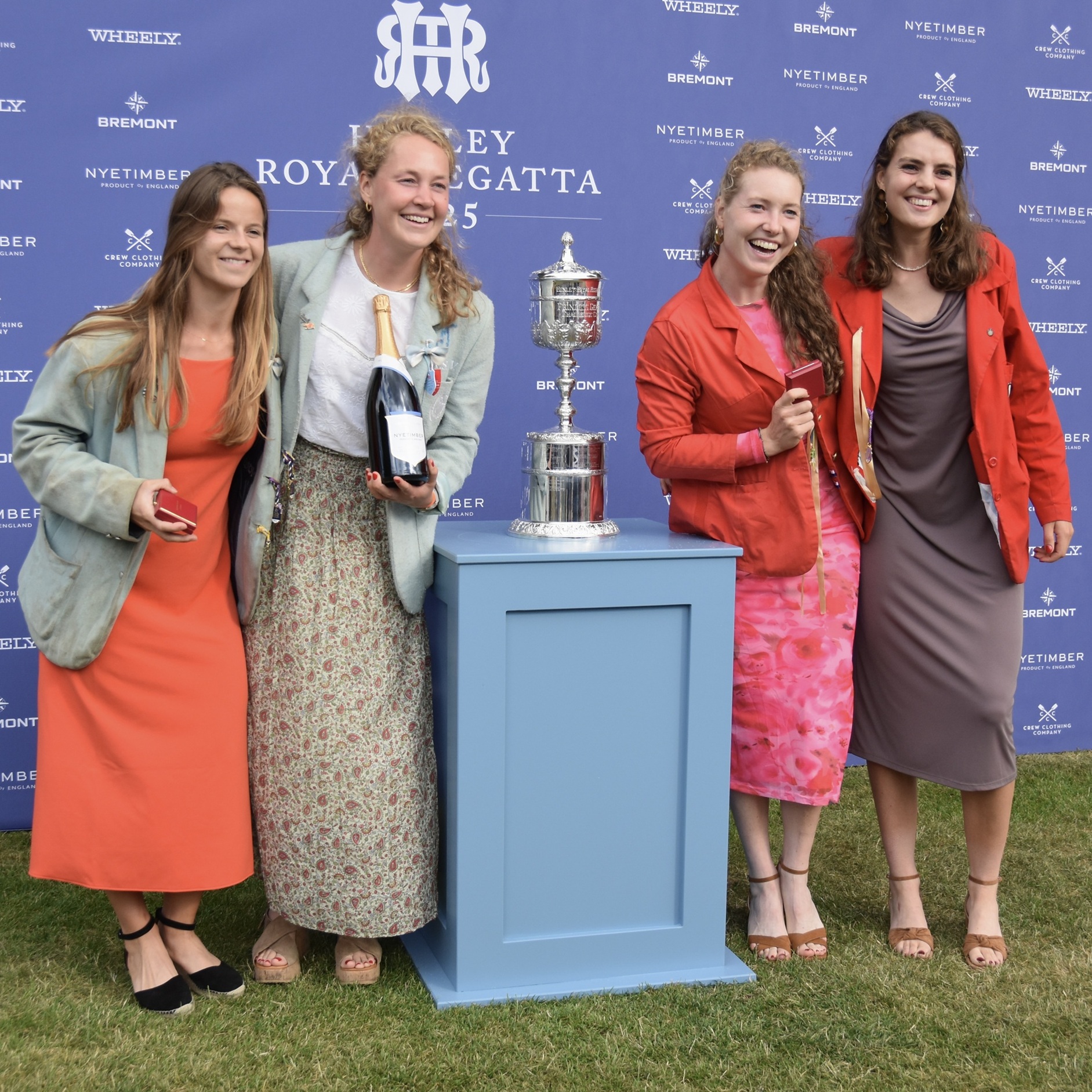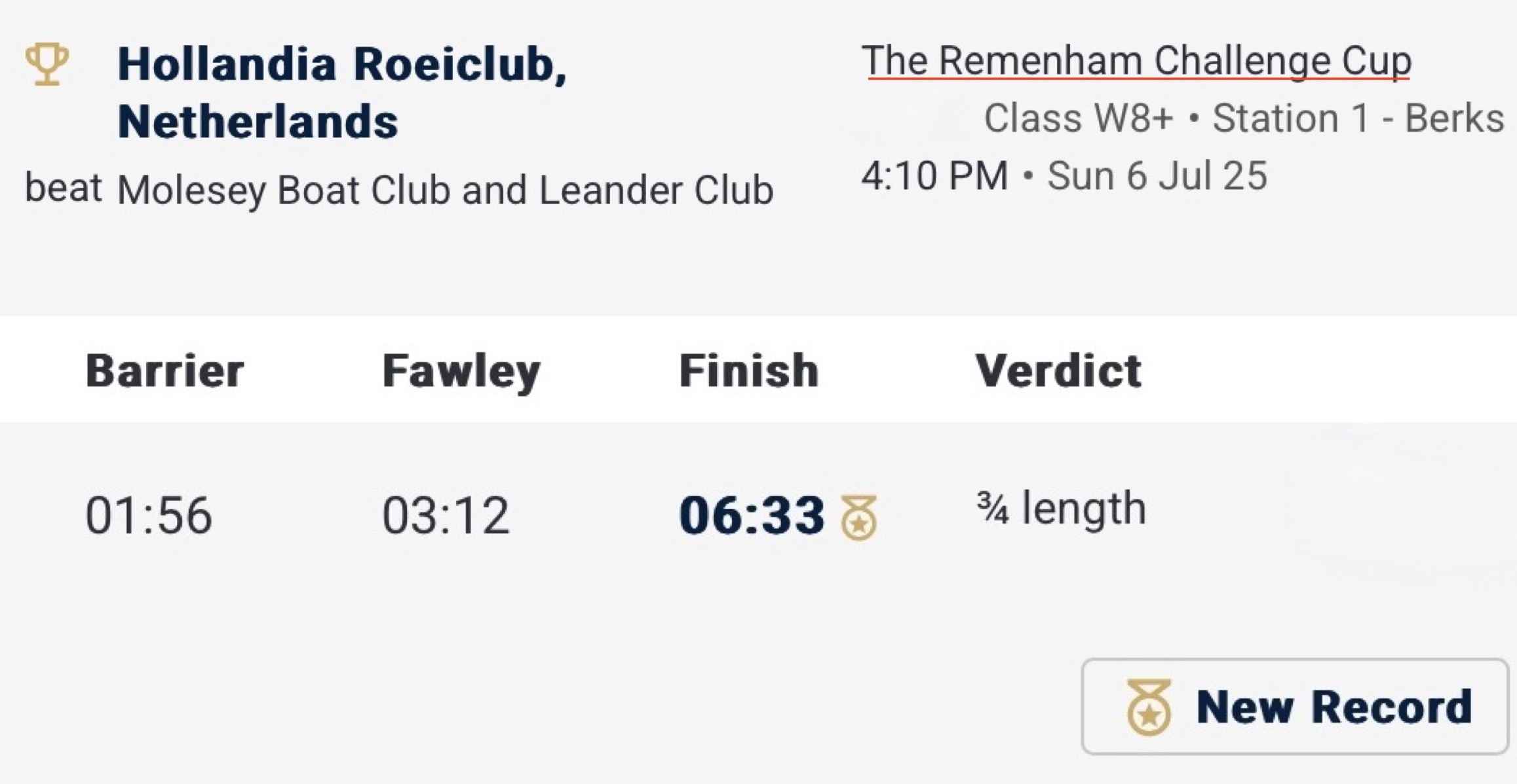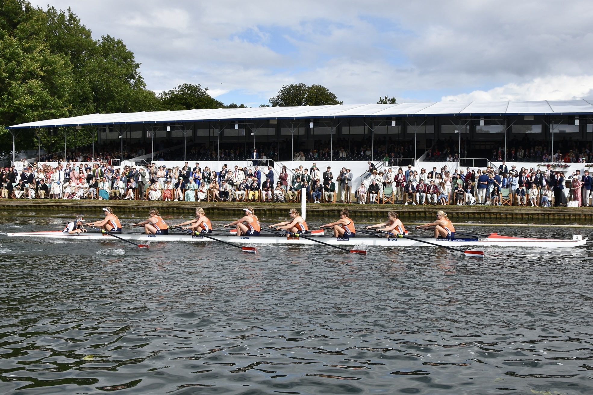 The prize giving was a warm and wet affair.In the Remenham, Hollandia reversed the result from the European Rowing Championships on 1 June (when they lost to the British by over two seconds) and beat the home crew by 3/4 length.Hollandia in control.The last few strokes.Five hours earlier, four of the crew had also won the Town, the premier women’s coxless four race.Hollandia on their way to the start.Hollandia on their way to the finish.A second trophy for this four with a record time of 7:04.