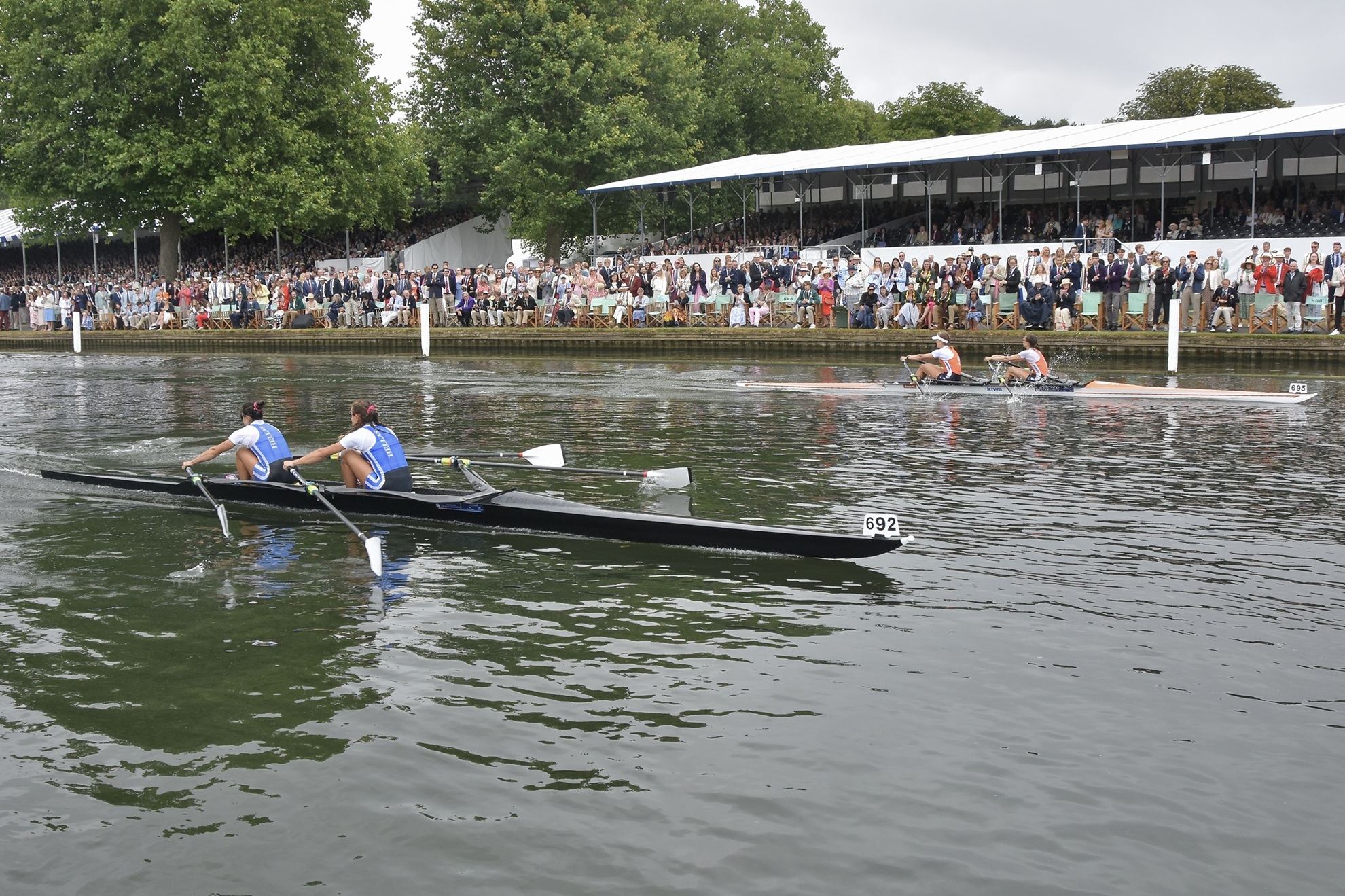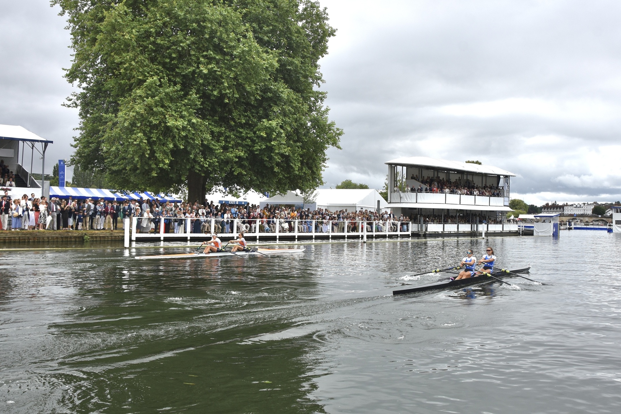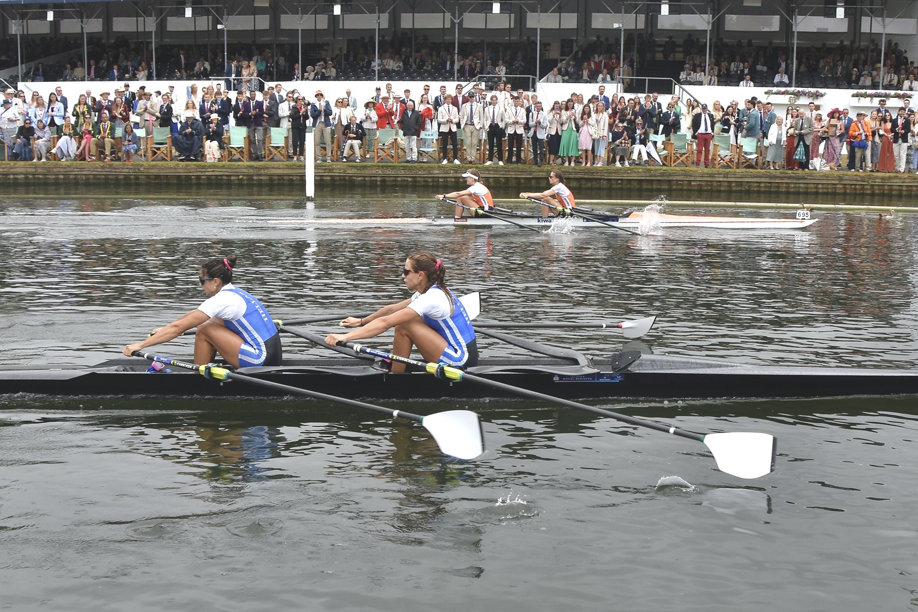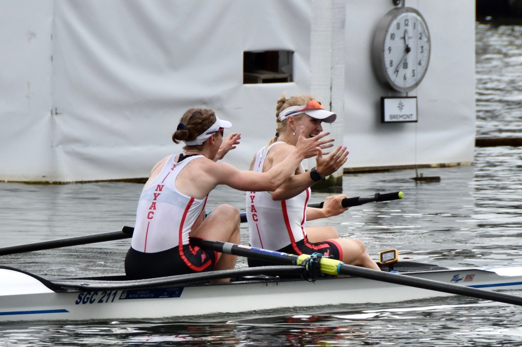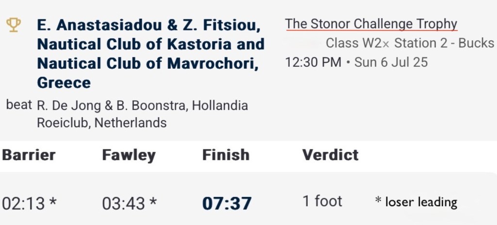 One of the stories of the Regatta came in The Stonor Challenge Trophy for women’s double sculls. With a starting roster featuring multiple Olympic gold medallists – including Steward Emma Twigg – this promised much and delivered in spades, providing us with one of the most exhilarating finals in recent years. E. Anastasiadou & Z. Fitsiou, Nautical Club of Kastoria and Nautical Club of Mavrochori, Greece were certainly second favourite approaching their final against the might of the Dutch, which featured Paris gold medal winner Benthe Boonstra, and it did not seem the script would be flipped for basically all of the contest. The Dutch led for 99.9% of the race, only for the fast-finishing Greeks to mount a stunning late charge to the line, surpassing their opponents for the first time as their bows crossed the line…