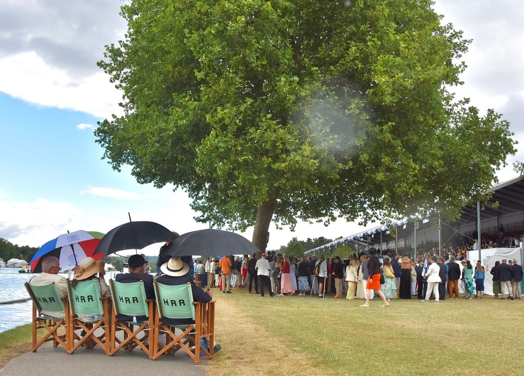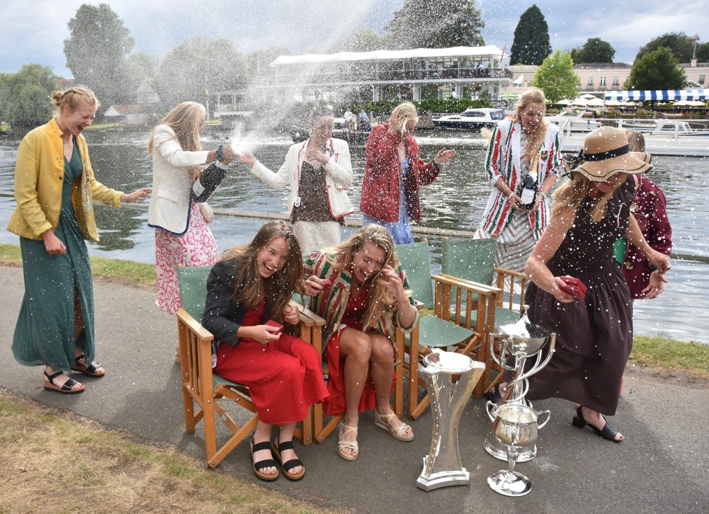 Hollandia and Potsdam & Dusseldorf past the finish line.Happy Holliandia.Passing the Progress Board, about ten strokes from the finish.It’s still anyone’s race.The crowd in Stewards’ equalled any “Remenham Roar” as the Greeks appeared to surge on the last few strokes – but then went silent as they waited for the judges to study the photo finish. The winning verdict was one foot to Anastasiadou and Fitsiou.Anastasiadou and Fitsiou pose with the Stonor Trophy and also with the new Henley Steward, Lord Camoys, the 8th Baron Camoys. Thomas Stonor, the 3rd Baron Camoys, was one of the founders of Henley Regatta in 1839 and all the successors to the barony (bar one) have served on the Committee.