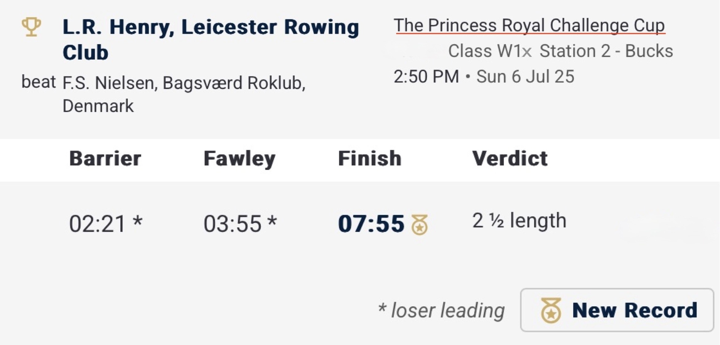 Lauren Henry of Leicester Rowing Club took on Frida Nielsen in the final of The Princess Royal Challenge Cup. The race wasn’t won at the start but developed in pristine fashion. Henry, down a length at Remenham Farm and then just a canvas at Fawley, would mesmerise any viewer with her technique. Cool, calm and collected, she reaped the reward of her skilful strokes, leading by three lengths by the Hole in the Wall. Fast moving in flowing waters, Henry crossed the line seven seconds ahead of the previous record, another notch on her highly impressive belt.