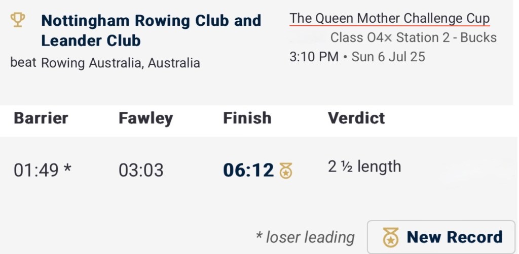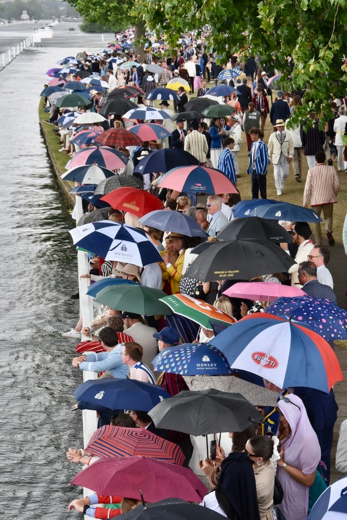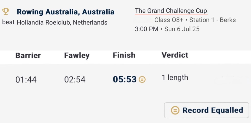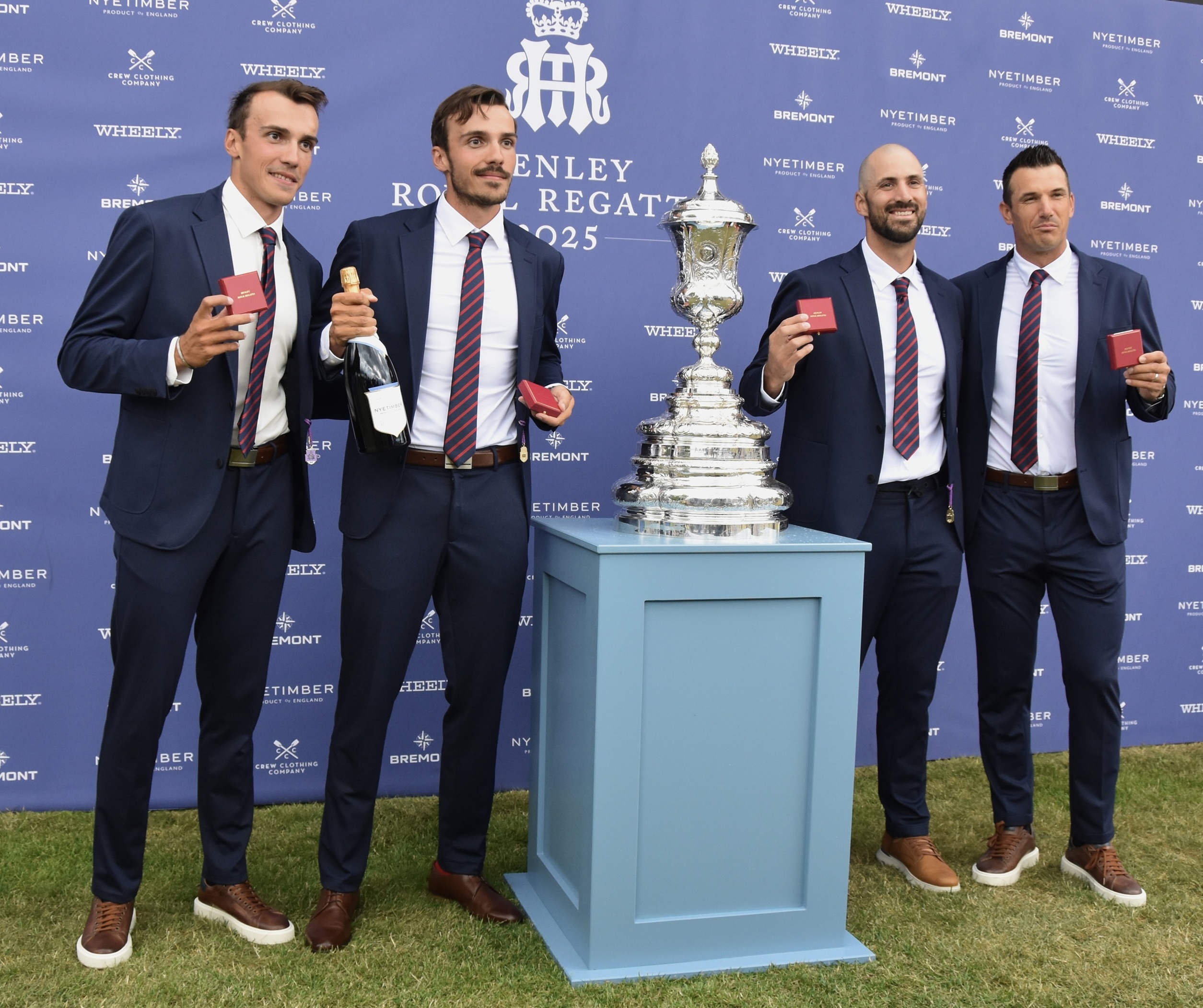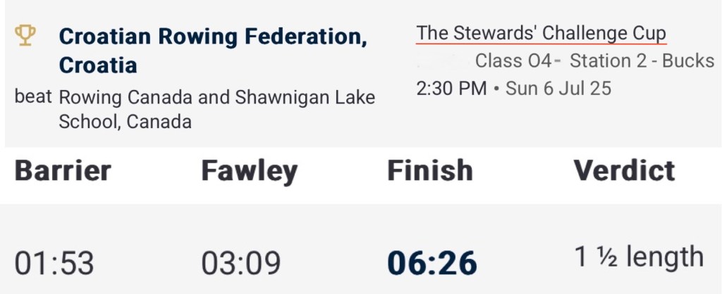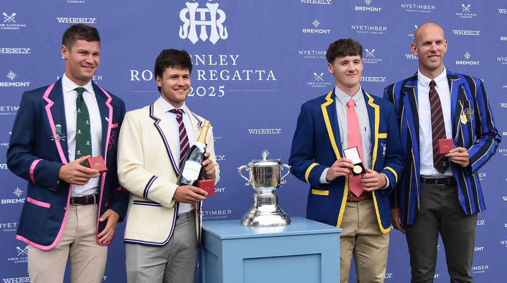 Some of the glittering prizes that in a short time will be covered in fingerprints, the regatta’s “Official Sparkling Wine” and various body fluids – though hopefully these will be limited to sweat and spittle.The Grand was a convincing one length win by the Australian national crew over the Dutch. The day before they had beaten the British by 2/3 length and Hollandia had beaten Cambridge University by just 1/3 of a length. It was a remarkable effort by CUBC, who were eligible for the Ladies’ Plate, and afterwards they seemed to have no regrets at undertaking the very brave attempt. The Australian crew included the coxless four that had back to back wins in the 2025 Rowing World Cups.Ain’t life Grand?Despite a sudden if brief downpour mid-race, the Croatians had no problem in finishing 1 1/2 lengths up on Canada.The four is a new boat for the remarkable Sinkovic brothers, Martin and Valent (now aged 36 and 37), who were joined by twins, Patrik and Anton Loncaric. The double Olympic Gold winning Sinkovics are arguably the two best rowers in the world and have one previous Henley win, the Silver Goblets in 2018.Umpire Pinsent could not be distracted by donning his waterproofs and stoically endured the rain.