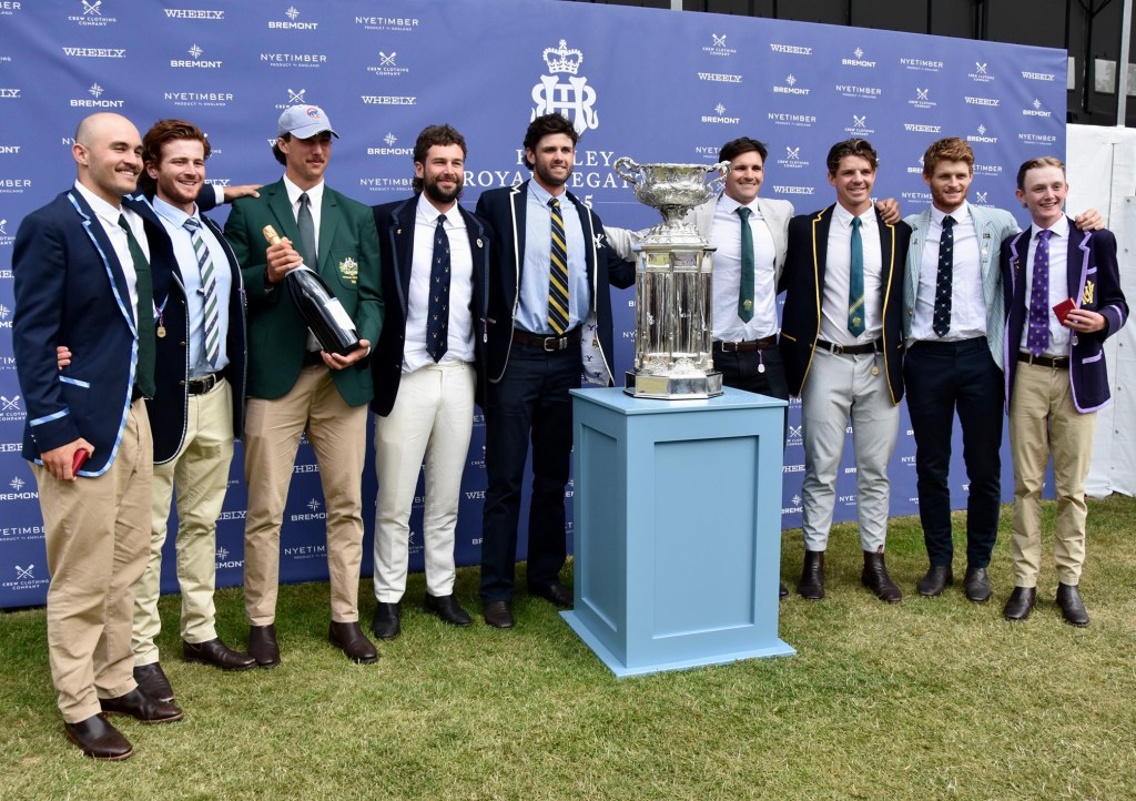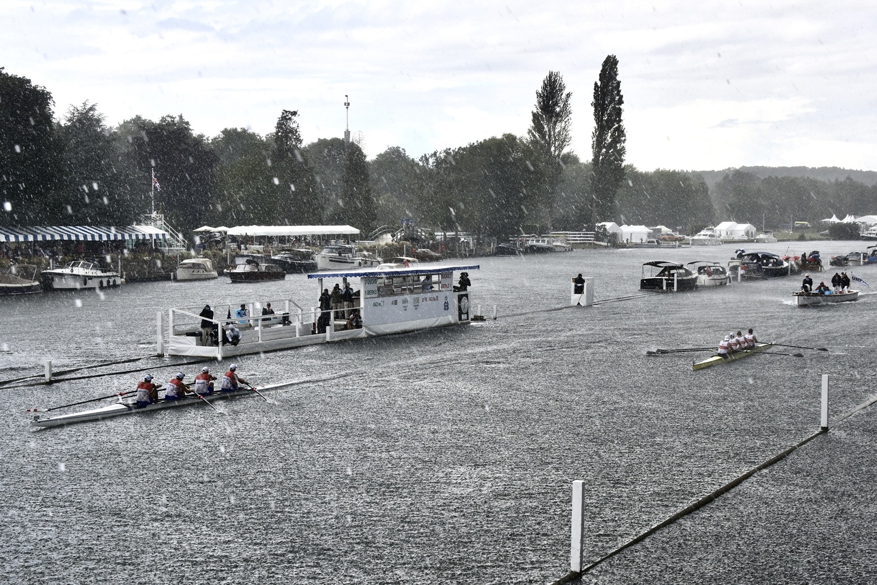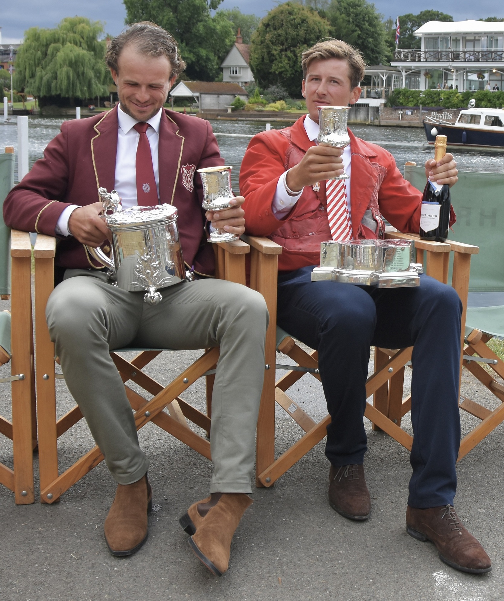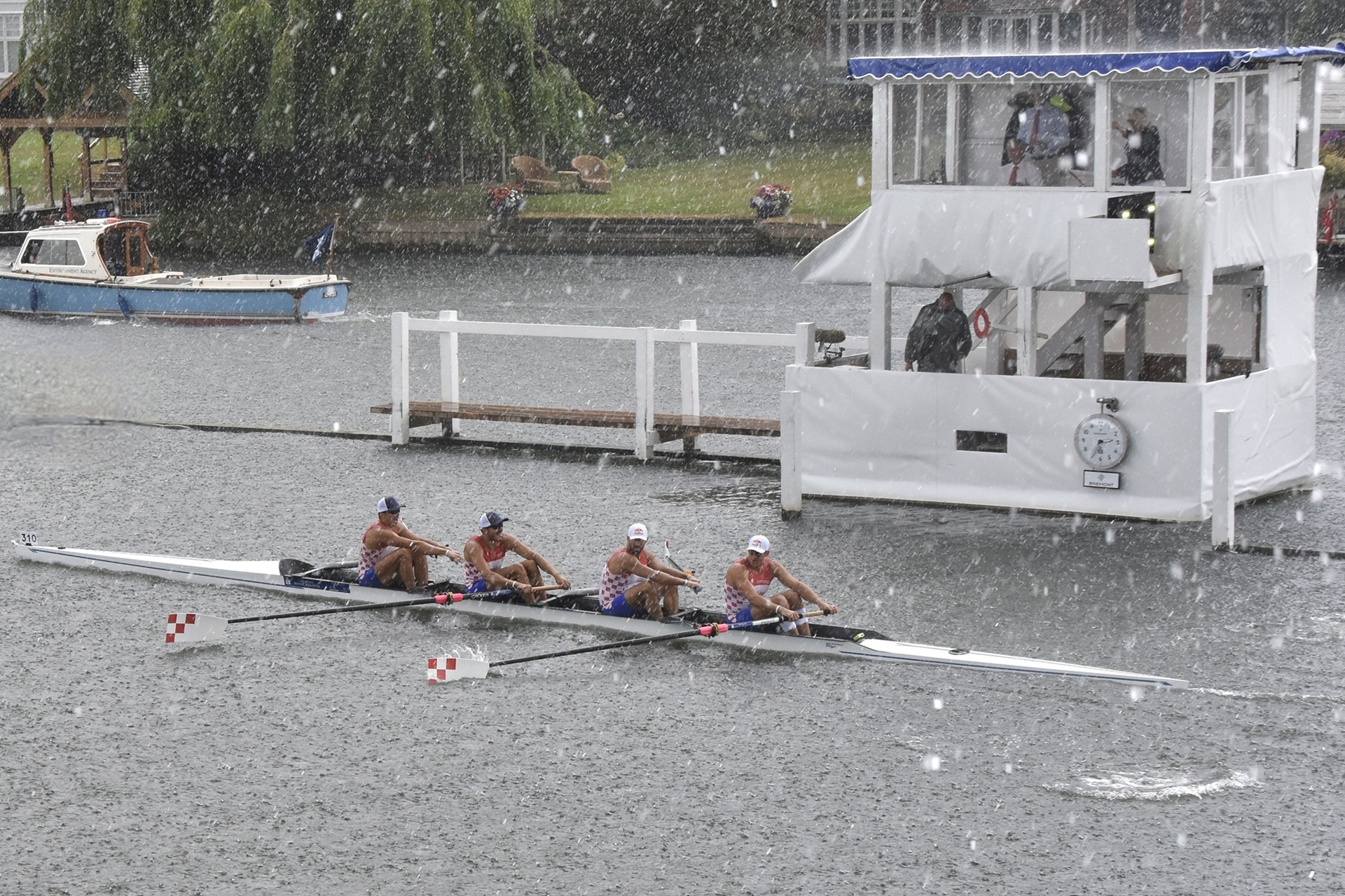 Some of the glittering prizes that in a short time will be covered in fingerprints, the regatta’s “Official Sparkling Wine” and various body fluids – though hopefully these will be limited to sweat and spittle.The Grand was a convincing one length win by the Australian national crew over the Dutch. The day before they had beaten the British by 2/3 length and Hollandia had beaten Cambridge University by just 1/3 of a length. It was a remarkable effort by CUBC, who were eligible for the Ladies’ Plate, and afterwards they seemed to have no regrets at undertaking the very brave attempt. The Australian crew included the coxless four that had back to back wins in the 2025 Rowing World Cups.Ain’t life Grand?Despite a sudden if brief downpour mid-race, the Croatians had no problem in finishing 1 1/2 lengths up on Canada.The four is a new boat for the remarkable Sinkovic brothers, Martin and Valent (now aged 36 and 37), who were joined by twins, Patrik and Anton Loncaric. The double Olympic Gold winning Sinkovics are arguably the two best rowers in the world and have one previous Henley win, the Silver Goblets in 2018.Umpire Pinsent could not be distracted by donning his waterproofs and stoically endured the rain.