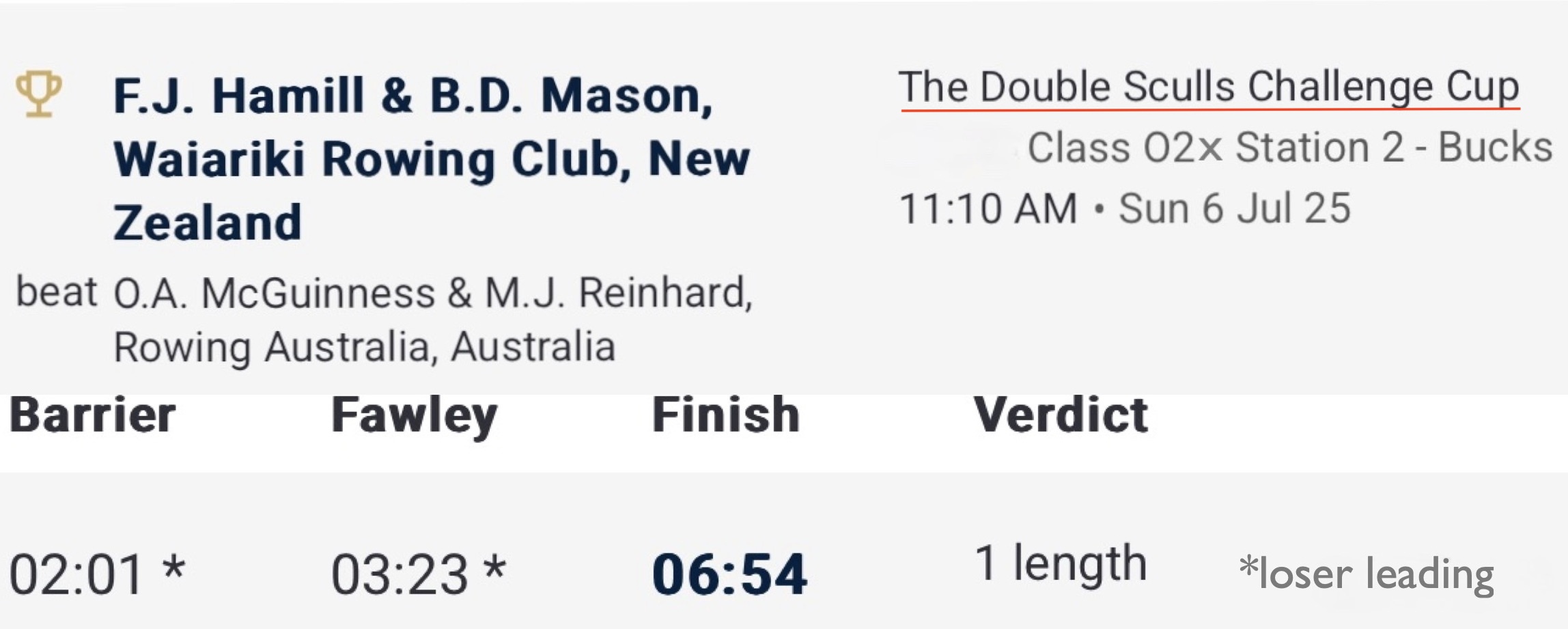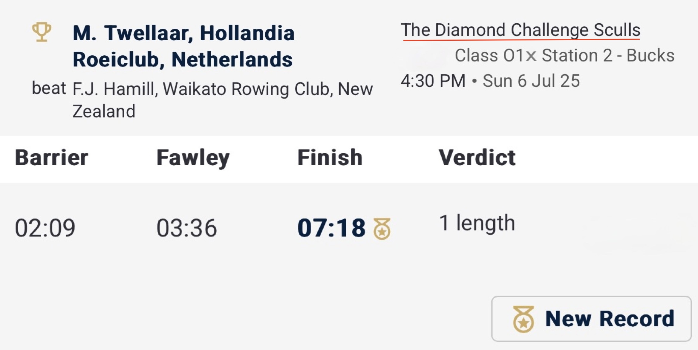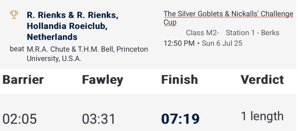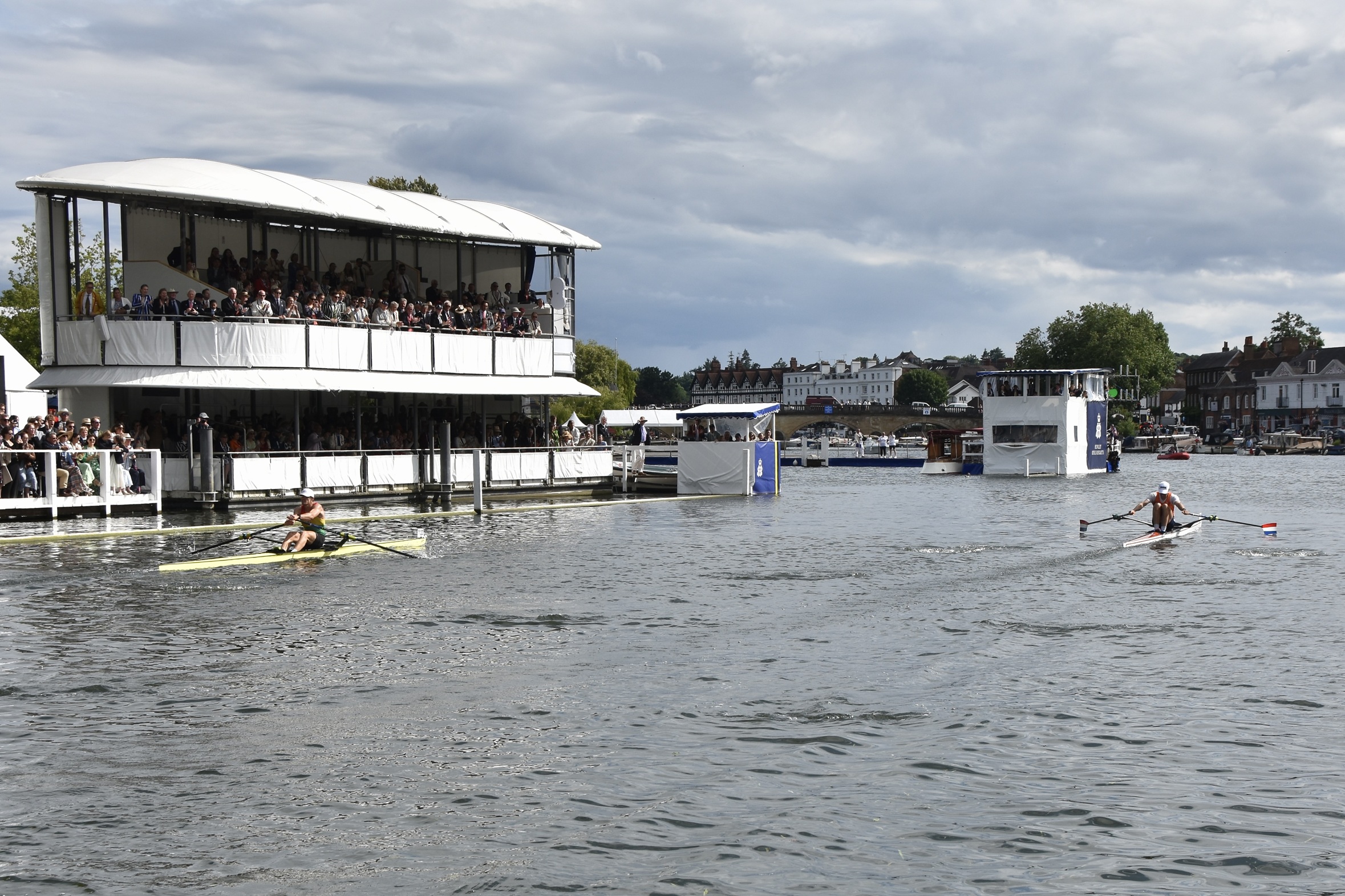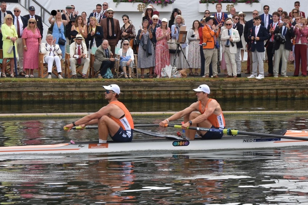 Brothers-in-Oar: The Loncarics and the Sinkovics.The GB Men’s Quad, racing as Nottingham RC and Leander Club, put on a great performance to come from behind and beat the Australians by a remarkable 2 1/2 lengths. Picture: Instagram/Row360.Silver service. It was good to see Callum Dixon (left) wearing the Wingfield Sculls medal that he won last year.The Rienks brothers, Ralf and Rik, of Hollandia Roeiclub, a few strokes from their one length victory.Both brothers raced at the Paris Games where Ralf won silver in the eight.The losing Princeton University boat was in fact crewed by two Brits, Marcus Chute and Theo Bell, both of whom have previously won at Henley.Ralf and Rik (or perhaps Rik and Ralf) enjoy their prizes.The New Zealanders no doubt took great pleasure in beating old rivals, Australia, especially as they came from behind after being down at the Barrier and Fawley.Hamill and Mason win by one length.I often wonder why the Double Sculls Challenge Cup is the least imaginatively named trophy in the regatta.Despite Finn Hamill beating World Rowing Cup I and Holland Beker winner, Simon Van Dorp, and then even more spectacularly, Olympic champion Oliver Zeidler in the heats, the Kiwi was unable to defeat Melvin Twellaar of Hollandia even with a rate that hardly dropped below 38. Hamill had won the Double Sculls five hours earlier.Melvin Twellaar won silver in the double at the Tokyo Games.Twellaar finishes one length up.Many sculling greats have won The Diamonds, Twellaar now joins them.Diamonds are forever.By finals day, only two boats for each of the 27 events are left in the boat tents. It’s a rather sad sight.