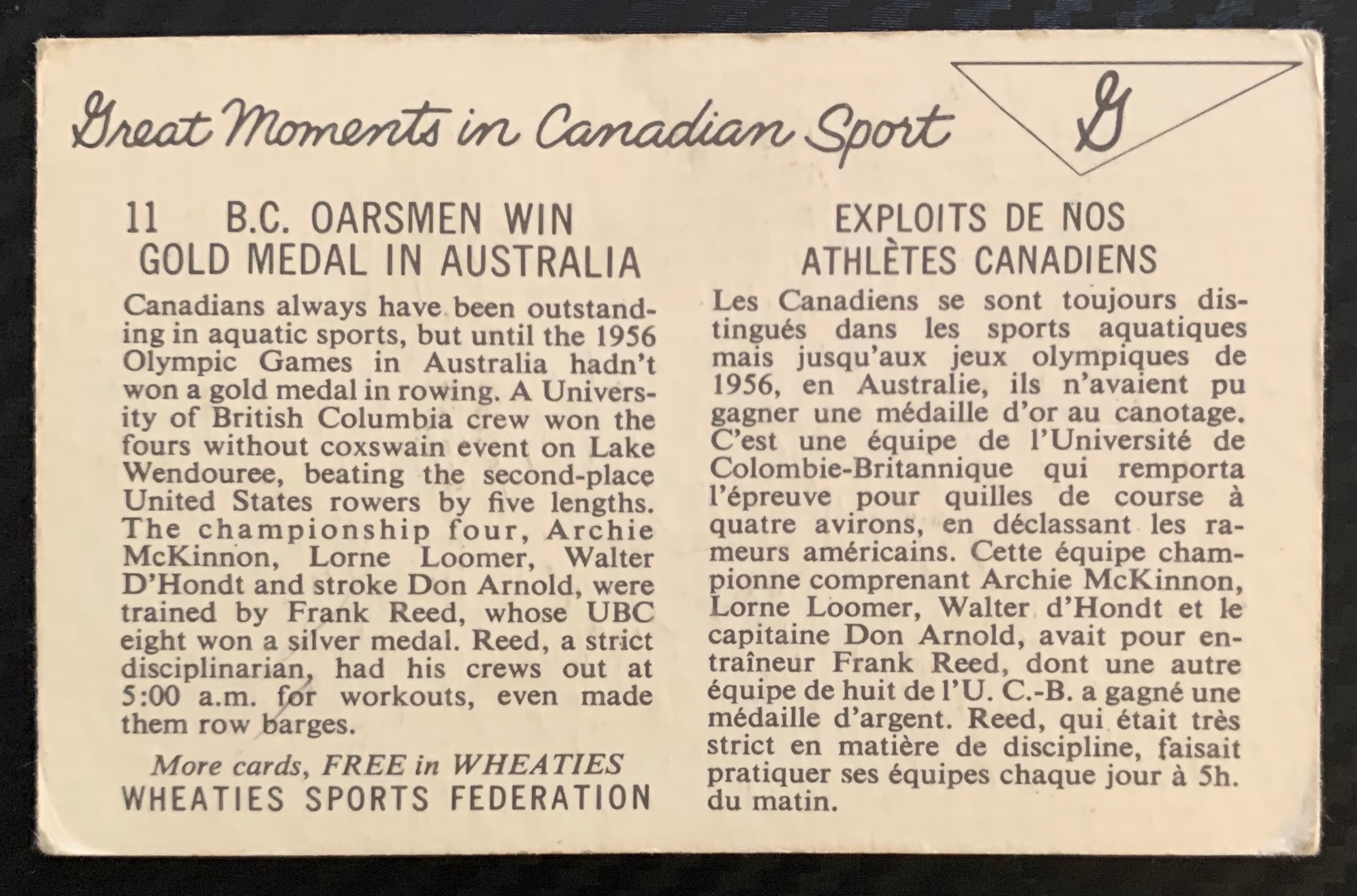 This is not to say that General Mill has never had any association with rowing. In 1962, General Mills Canada, through the Wheaties Sports Federation created to promote sports and physical fitness among youth, began offering a series of 3½ x 2¼-inch collector cards titled “Great Moments in Canadian Sport” inside boxes of Wheaties®. Each card featured an illustration of a significant moment in Canadian sports history. One card in the series, number 11, depicted the Canadian gold medal-winning men’s coxless four from the 1956 Melbourne Olympic Games.