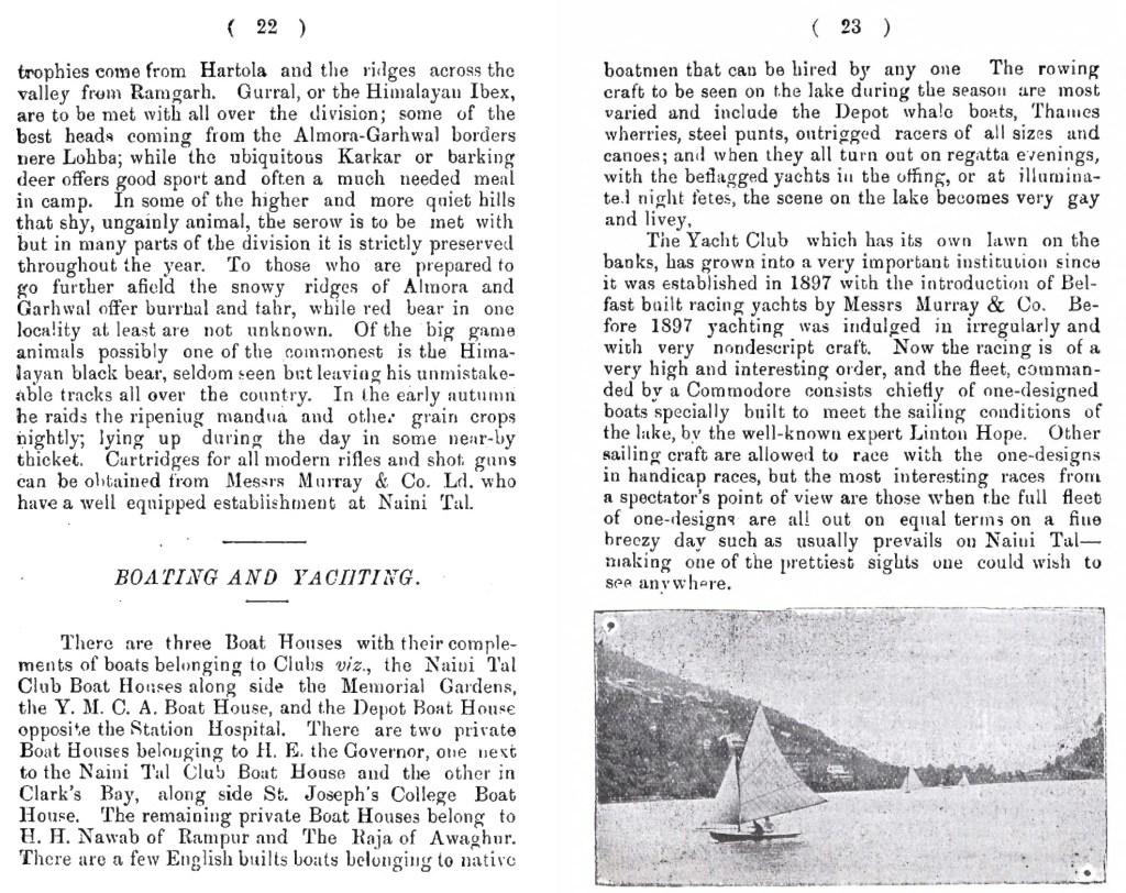 The Naval and Military Gazette of 18 September 1869 said of Nainital, During the season there are balls, cricket matches, croquet etc, and boat races on the lovely lake, the crews of the rival boats being some of the belles of the station.