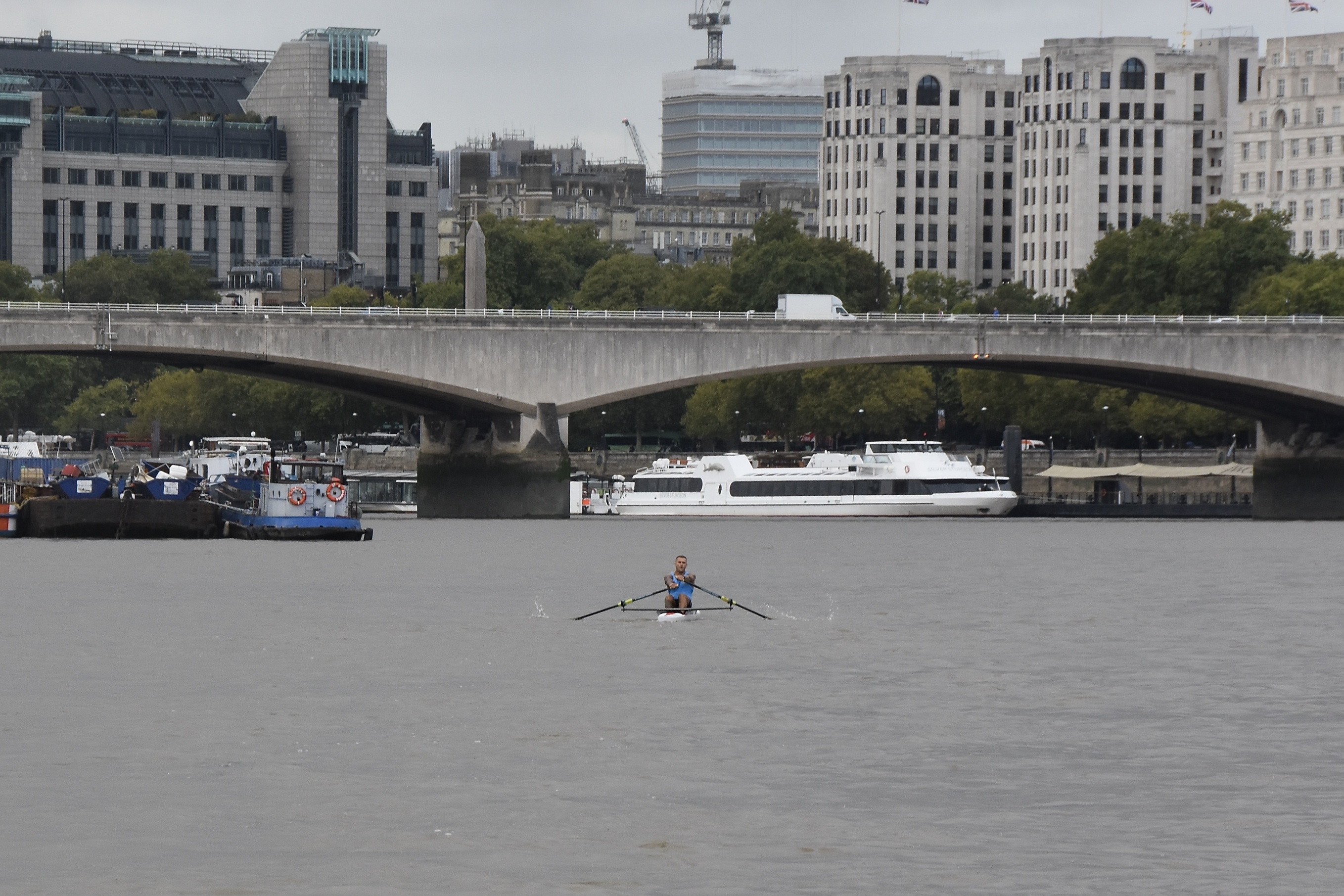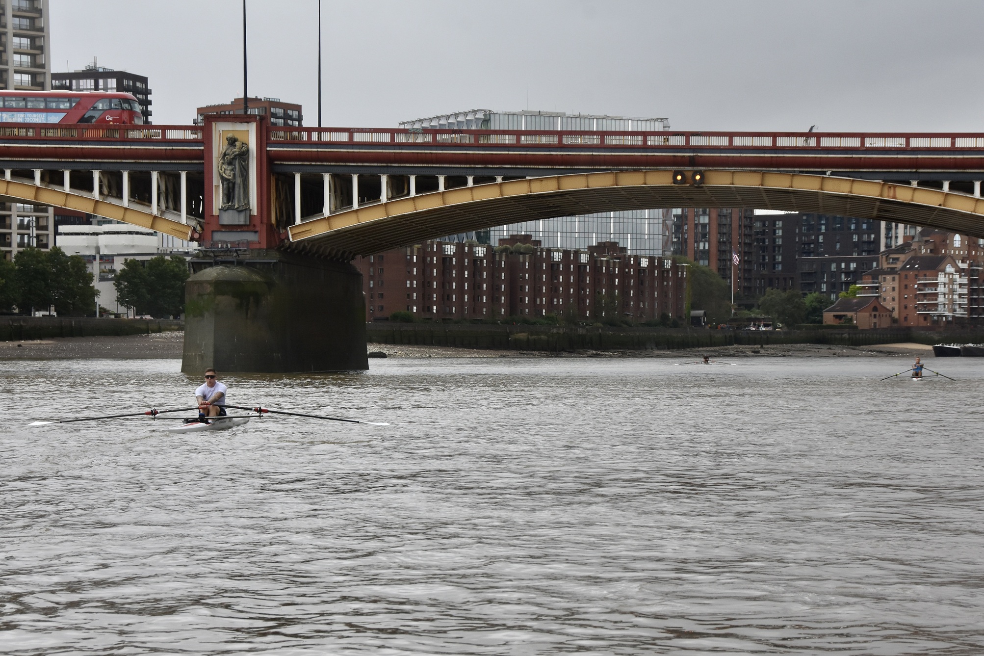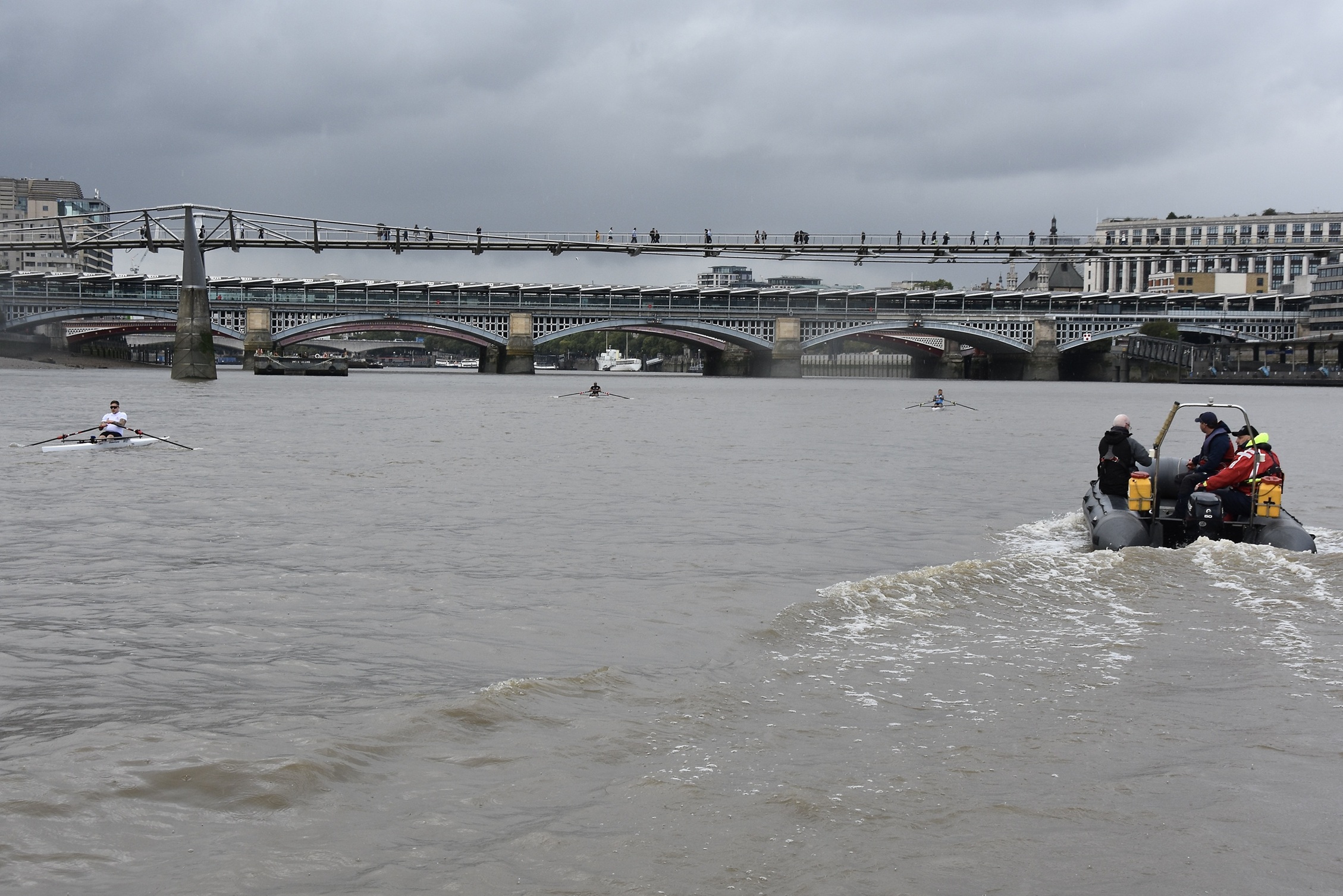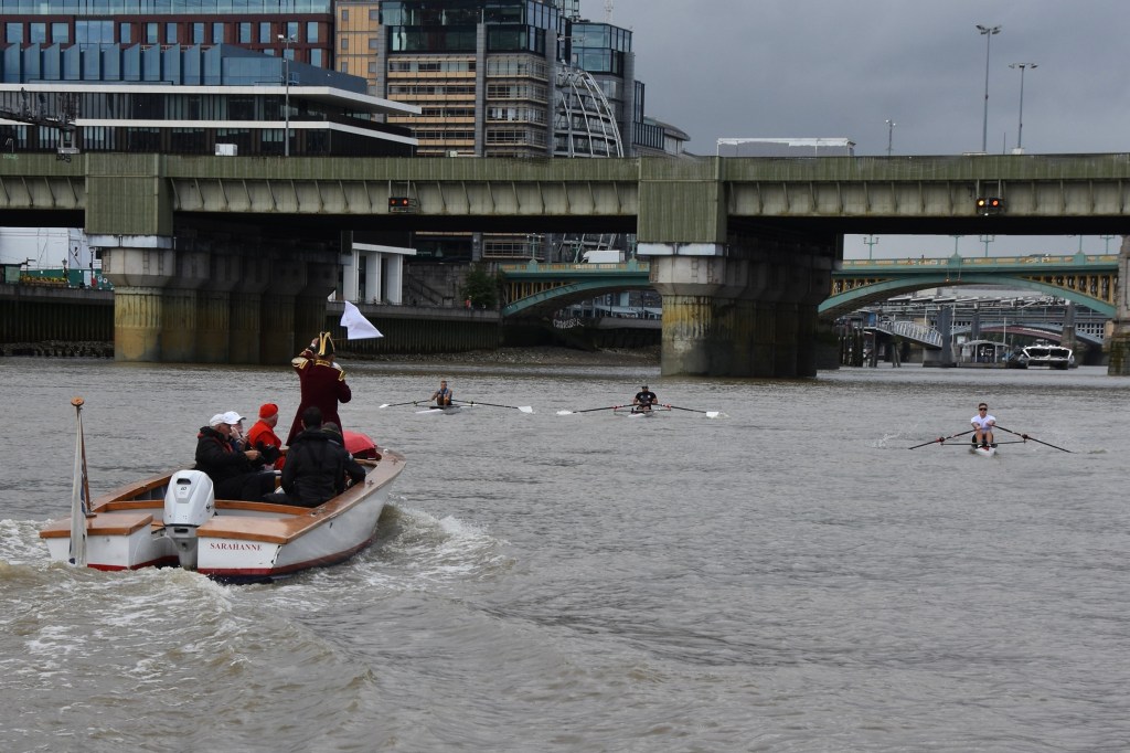 The course, 7400 metres of unsettled and unsuitable water between London Bridge and Cadogan Pier, Chelsea, containing washes, bends and currents, plus the potential to hit any of fourteen bridges and numerous other unyielding objects.Upstream of London Bridge, umpire Bobby Prentice raises the white flag to start the race. Left to right is Jack Finelli (in blue), Coran Cherry (in black) and Charlie Milward (in white). The green bridge in the background is Cannon Street Rail Bridge (250 metres into the course).The race order (Cherry first followed by Finelli then Milward) was quickly established and did not change. However, this does not mean that it was a dull race. Finelli constantly challenged Cherry and Milward made up the distance as the race progressed. Here the race is pictured as it approaches Southwark Bridge (400 metres).Left to right, Milward, Cherry, Finelli. The four bridges in view here are the Millennium Foot Bridge (700 metres), Blackfriars Rail Bridge (1050 metres), Blackfriars Road Bridge (1150 metres) and Waterloo Bridge (2000 metres). Cherry later told me that it was at Blackfriars that he felt confident that he could win.In the 850 metres between Blackfriars Road Bridge (1150 metres) and Waterloo Bridge (2000 metres), the competitors can choose to hug the south shore and go inside the moored barges at Coin Street, cutting the corner and taking flatter but slower water, or stay in the middle of the river and go outside of the moorings, taking a longer route but with faster though potentially rougher water. Cherry (left here) and Milward (out of the picture) went inside, Finelli (right here) stayed in the middle.Jack Finelli’s decision to take the less common course in the centre at Coin Street was a logical one for someone trying to move from second place to first. It was a gamble that ultimately did not pay off, but it was still one worth taking.While the boys were negotiating Coin Street, the umpire’s launch suddenly stopped (it was later discovered that a plastic bag had wrapped around the propeller). Very quickly, Umpire Prentice, Assistant Umpire Ken Dwan and commentators Martin Cross and Camilla Hadland Horrocks were transferred into the press boat – which then became the umpire’s launch. Picture: Jenifer Andersen. The new umpire’s launch caught up with the boys after they passed Waterloo Bridge (2000 metres) but before the Golden Jubilee Bridges and Hungerford Bridge (2350 metres, pictured). The race order was the same and no incidents had occurred while the umpire was indisposed. Approaching Westminster Bridge (2950 metres) and the Houses of Parliament, Cherry continued to pull away but Finelli and Milward were not giving up. Note the name on the tourist boat on the right, the MV Thomas Doggett.The water between Westminster Bridge and Lambeth Bridge (3650 metres, pictured) was rough but all the competitors handled the conditions well.Lambeth Bridge – the approximate half-way point.Conditions improved between Lambeth and Vauxhall Bridges.Vauxhall Bridge (4500 metres).Umpire Prentice keeps an eye on things on the long stretch between Vauxhall Bridge and the former Battersea Power Station.At the former Battersea Power Station (5900 metres).Heading towards the last two bridges on the course, Grosvenor Rail and Chelsea (6300 metres), it is still Cherry leading followed by Finelli then Milward.Just before the Grosvenor Rail Bridge, Umpire Prentice made the always hard decision to pass the last placed competitor, Charlie Milward. Here, Cherry has gone through the bridges, Finelli has yet to do so.After the Grosvenor Rail and Chelsea Bridges, Umpire Prentice also passed Jack Finelli (pictured), Coran Cherry’s lead now being unassailable.As he approached the finish at Cadogan Pier (7400 metres), just downstream of the Albert Bridge, the race was Cherry’s to lose – he just had to stay upright.In the dying minutes of the race there was a terrific squall.Driving rain accompanies Cherry’s final strokes.Cherry victorious on his fourth and final attempt in a time of 27m 01s.Finelli finished in 28m 14 s, Milward in 28m 30s.On Cadogan Pier, Milward is helped in by 2021 winner, James Berry.James Berry with Coran Cherry, the newest member of a very exclusive club, the Doggett’s Men.Finelli, Cherry and Milward – winners all.Coran with some of his family including his aunt on his right and his father on his left. His mother was originally from Grenada.