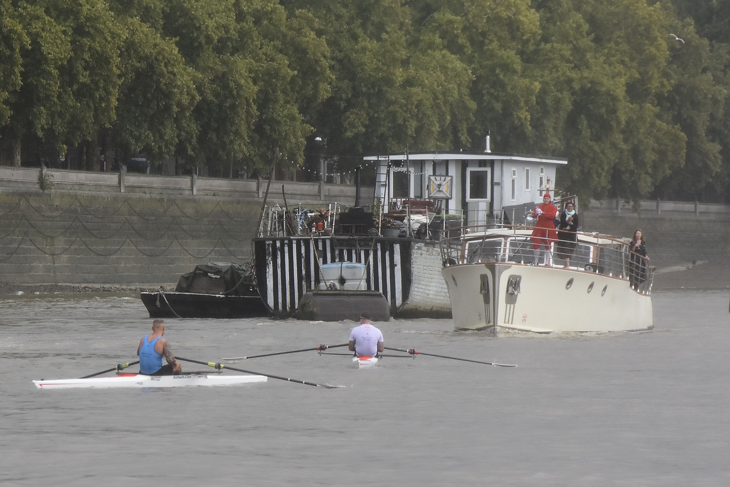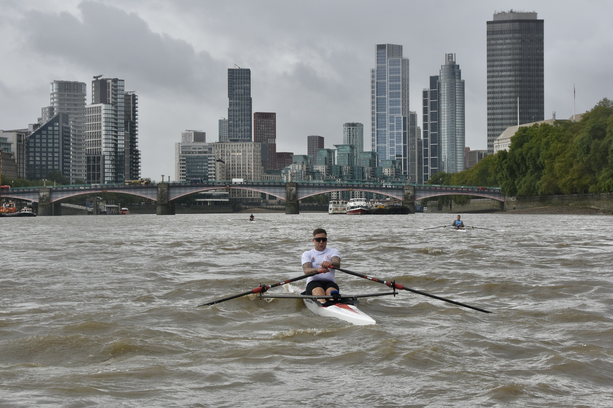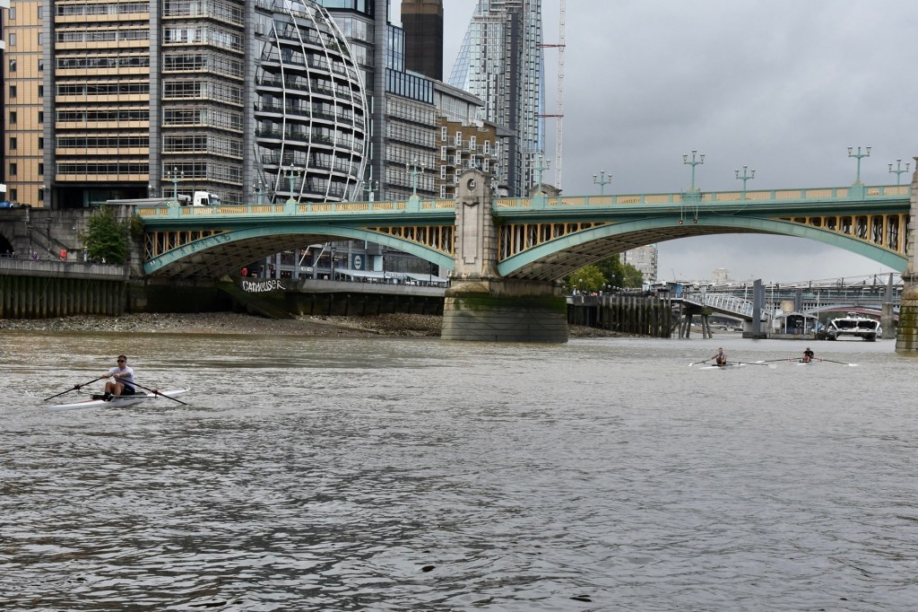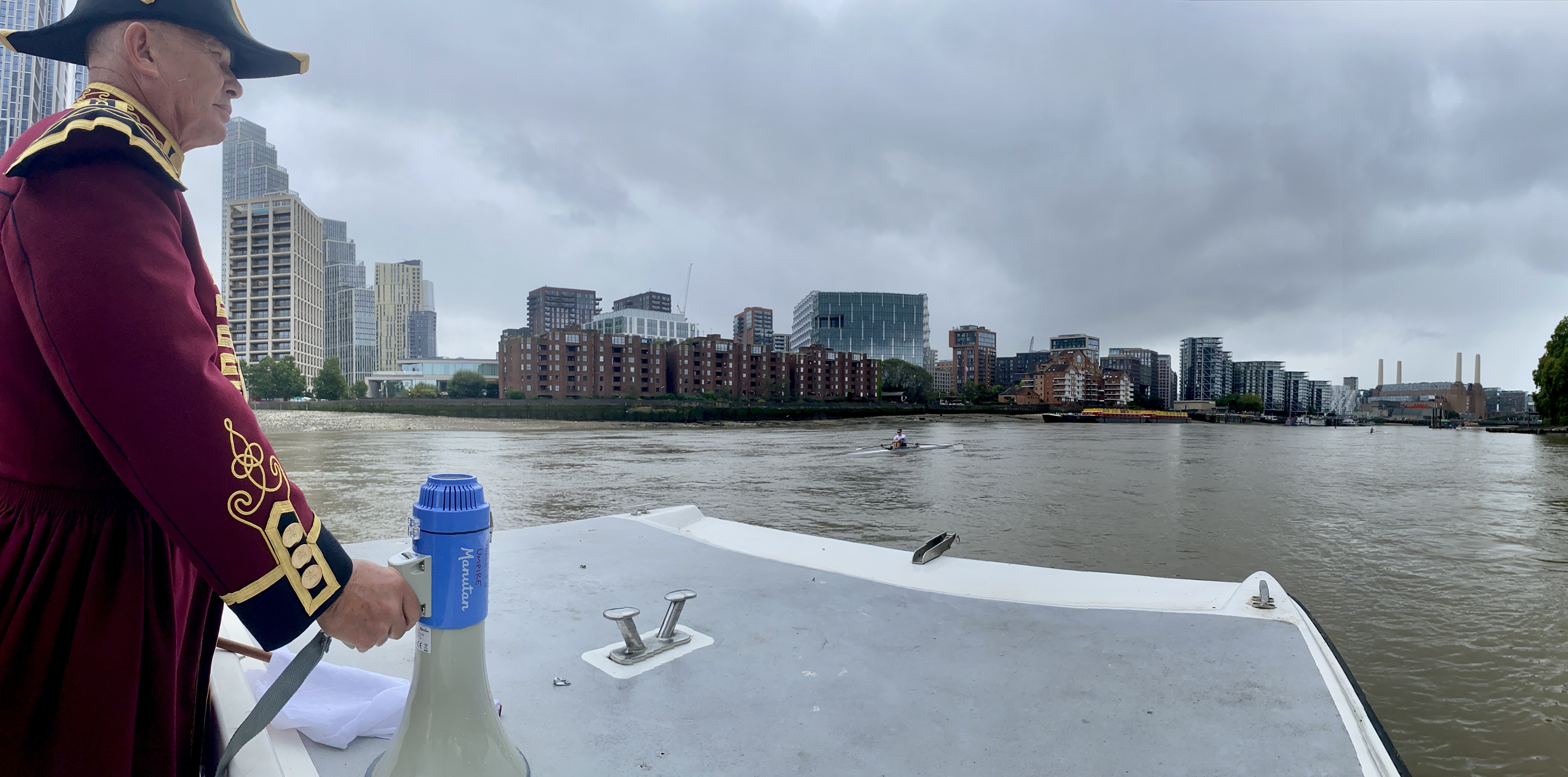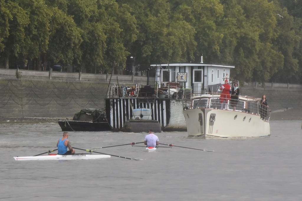 The course, 7400 metres of unsettled and unsuitable water between London Bridge and Cadogan Pier, Chelsea, containing washes, bends and currents, plus the potential to hit any of fourteen bridges and numerous other unyielding objects.Upstream of London Bridge, umpire Bobby Prentice raises the white flag to start the race. Left to right is Jack Finelli (in blue), Coran Cherry (in black) and Charlie Milward (in white). The green bridge in the background is Cannon Street Rail Bridge (250 metres into the course).The race order (Cherry first followed by Finelli then Milward) was quickly established and did not change. However, this does not mean that it was a dull race. Finelli constantly challenged Cherry and Milward made up the distance as the race progressed. Here the race is pictured as it approaches Southwark Bridge (400 metres).Left to right, Milward, Cherry, Finelli. The four bridges in view here are the Millennium Foot Bridge (700 metres), Blackfriars Rail Bridge (1050 metres), Blackfriars Road Bridge (1150 metres) and Waterloo Bridge (2000 metres). Cherry later told me that it was at Blackfriars that he felt confident that he could win.In the 850 metres between Blackfriars Road Bridge (1150 metres) and Waterloo Bridge (2000 metres), the competitors can choose to hug the south shore and go inside the moored barges at Coin Street, cutting the corner and taking flatter but slower water, or stay in the middle of the river and go outside of the moorings, taking a longer route but with faster though potentially rougher water. Cherry (left here) and Milward (out of the picture) went inside, Finelli (right here) stayed in the middle.Jack Finelli’s decision to take the less common course in the centre at Coin Street was a logical one for someone trying to move from second place to first. It was a gamble that ultimately did not pay off, but it was still one worth taking.While the boys were negotiating Coin Street, the umpire’s launch suddenly stopped (it was later discovered that a plastic bag had wrapped around the propeller). Very quickly, Umpire Prentice, Assistant Umpire Ken Dwan and commentators Martin Cross and Camilla Hadland Horrocks were transferred into the press boat – which then became the umpire’s launch. Picture: Jenifer Andersen. The new umpire’s launch caught up with the boys after they passed Waterloo Bridge (2000 metres) but before the Golden Jubilee Bridges and Hungerford Bridge (2350 metres, pictured). The race order was the same and no incidents had occurred while the umpire was indisposed. Approaching Westminster Bridge (2950 metres) and the Houses of Parliament, Cherry continued to pull away but Finelli and Milward were not giving up. Note the name on the tourist boat on the right, the MV Thomas Doggett.The water between Westminster Bridge and Lambeth Bridge (3650 metres, pictured) was rough but all the competitors handled the conditions well.Lambeth Bridge – the approximate half-way point.Conditions improved between Lambeth and Vauxhall Bridges.Vauxhall Bridge (4500 metres).Umpire Prentice keeps an eye on things on the long stretch between Vauxhall Bridge and the former Battersea Power Station.At the former Battersea Power Station (5900 metres).Heading towards the last two bridges on the course, Grosvenor Rail and Chelsea (6300 metres), it is still Cherry leading followed by Finelli then Milward.Just before the Grosvenor Rail Bridge, Umpire Prentice made the always hard decision to pass the last placed competitor, Charlie Milward. Here, Cherry has gone through the bridges, Finelli has yet to do so.After the Grosvenor Rail and Chelsea Bridges, Umpire Prentice also passed Jack Finelli (pictured), Coran Cherry’s lead now being unassailable.As he approached the finish at Cadogan Pier (7400 metres), just downstream of the Albert Bridge, the race was Cherry’s to lose – he just had to stay upright.In the dying minutes of the race there was a terrific squall.Driving rain accompanies Cherry’s final strokes.Cherry victorious on his fourth and final attempt in a time of 27m 01s.Finelli finished in 28m 14 s, Milward in 28m 30s.On Cadogan Pier, Milward is helped in by 2021 winner, James Berry.James Berry with Coran Cherry, the newest member of a very exclusive club, the Doggett’s Men.Finelli, Cherry and Milward – winners all.Coran with some of his family including his aunt on his right and his father on his left. His mother was originally from Grenada.