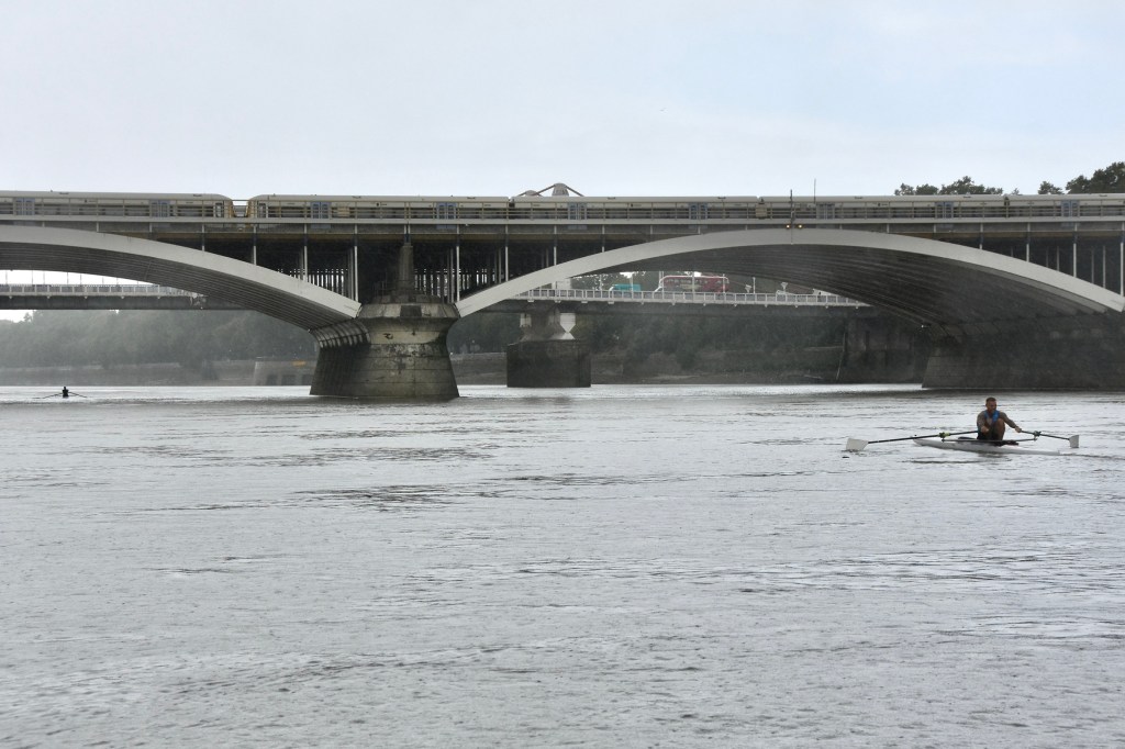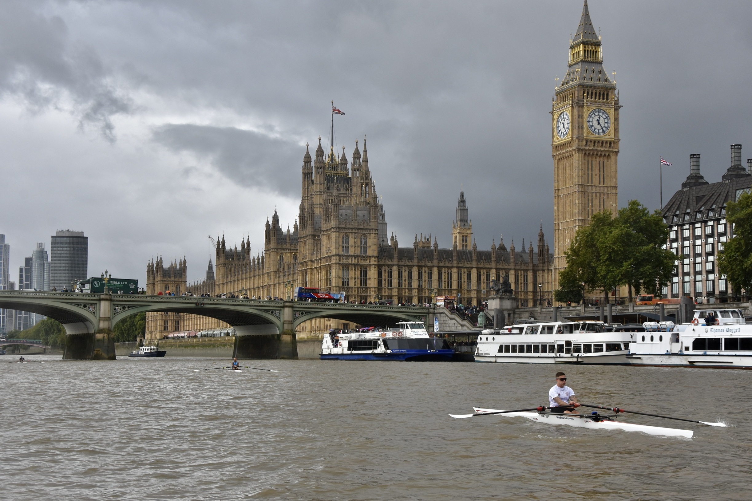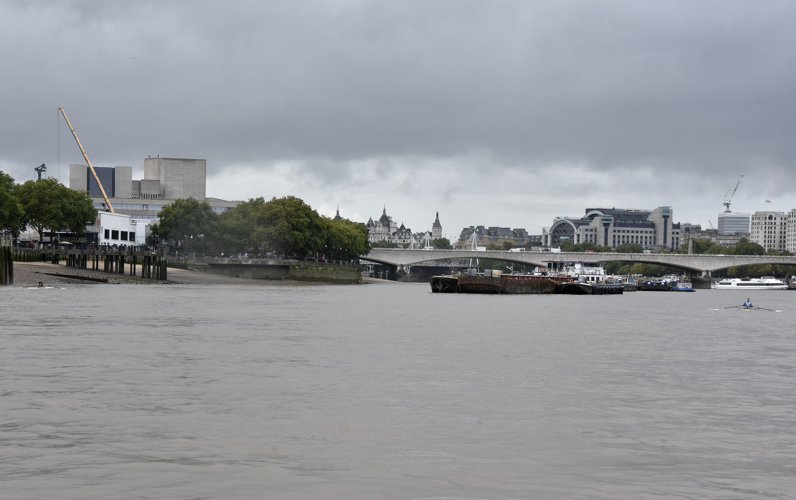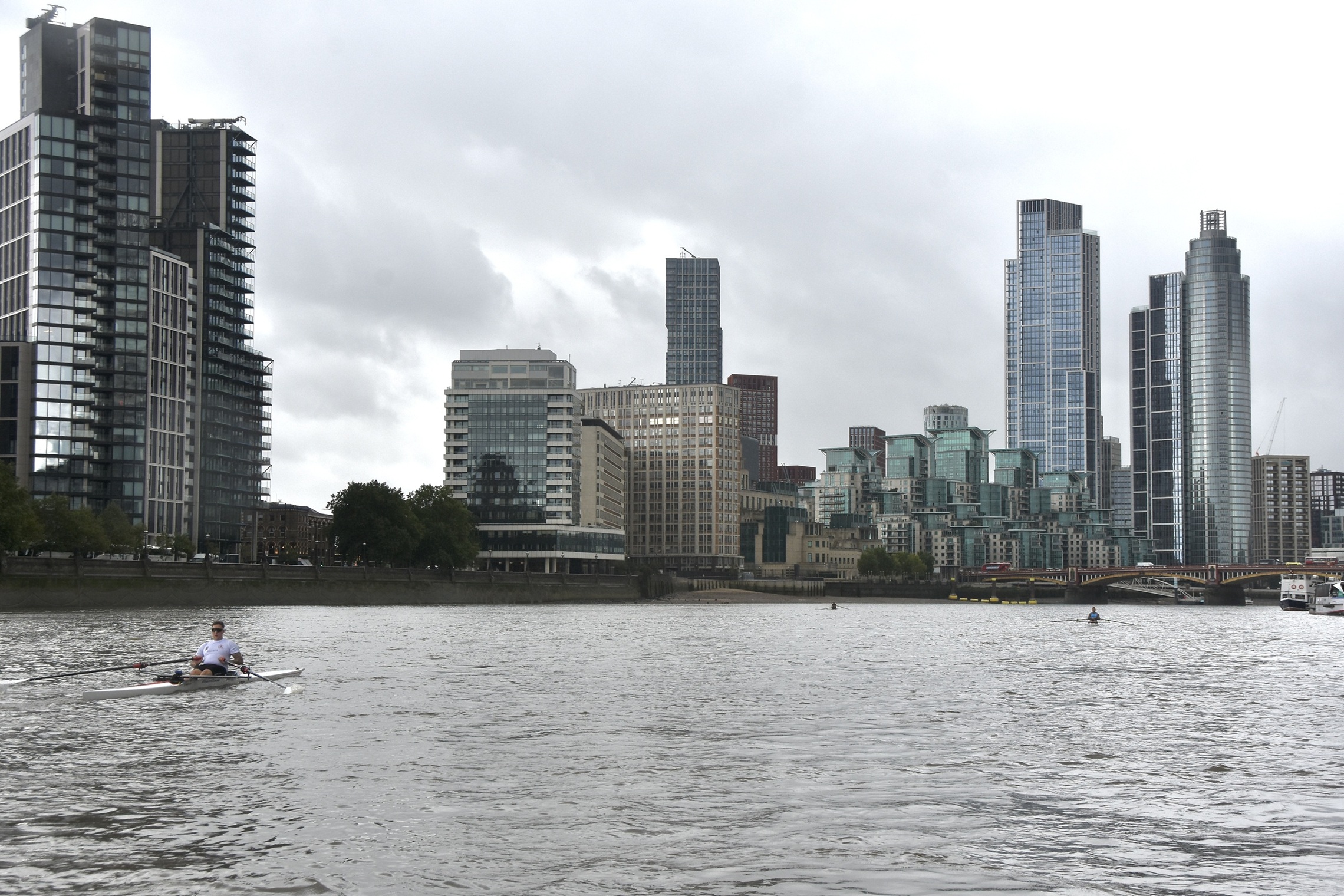 The course, 7400 metres of unsettled and unsuitable water between London Bridge and Cadogan Pier, Chelsea, containing washes, bends and currents, plus the potential to hit any of fourteen bridges and numerous other unyielding objects.Upstream of London Bridge, umpire Bobby Prentice raises the white flag to start the race. Left to right is Jack Finelli (in blue), Coran Cherry (in black) and Charlie Milward (in white). The green bridge in the background is Cannon Street Rail Bridge (250 metres into the course).The race order (Cherry first followed by Finelli then Milward) was quickly established and did not change. However, this does not mean that it was a dull race. Finelli constantly challenged Cherry and Milward made up the distance as the race progressed. Here the race is pictured as it approaches Southwark Bridge (400 metres).Left to right, Milward, Cherry, Finelli. The four bridges in view here are the Millennium Foot Bridge (700 metres), Blackfriars Rail Bridge (1050 metres), Blackfriars Road Bridge (1150 metres) and Waterloo Bridge (2000 metres). Cherry later told me that it was at Blackfriars that he felt confident that he could win.In the 850 metres between Blackfriars Road Bridge (1150 metres) and Waterloo Bridge (2000 metres), the competitors can choose to hug the south shore and go inside the moored barges at Coin Street, cutting the corner and taking flatter but slower water, or stay in the middle of the river and go outside of the moorings, taking a longer route but with faster though potentially rougher water. Cherry (left here) and Milward (out of the picture) went inside, Finelli (right here) stayed in the middle.Jack Finelli’s decision to take the less common course in the centre at Coin Street was a logical one for someone trying to move from second place to first. It was a gamble that ultimately did not pay off, but it was still one worth taking.While the boys were negotiating Coin Street, the umpire’s launch suddenly stopped (it was later discovered that a plastic bag had wrapped around the propeller). Very quickly, Umpire Prentice, Assistant Umpire Ken Dwan and commentators Martin Cross and Camilla Hadland Horrocks were transferred into the press boat – which then became the umpire’s launch. Picture: Jenifer Andersen. The new umpire’s launch caught up with the boys after they passed Waterloo Bridge (2000 metres) but before the Golden Jubilee Bridges and Hungerford Bridge (2350 metres, pictured). The race order was the same and no incidents had occurred while the umpire was indisposed. Approaching Westminster Bridge (2950 metres) and the Houses of Parliament, Cherry continued to pull away but Finelli and Milward were not giving up. Note the name on the tourist boat on the right, the MV Thomas Doggett.The water between Westminster Bridge and Lambeth Bridge (3650 metres, pictured) was rough but all the competitors handled the conditions well.Lambeth Bridge – the approximate half-way point.Conditions improved between Lambeth and Vauxhall Bridges.Vauxhall Bridge (4500 metres).Umpire Prentice keeps an eye on things on the long stretch between Vauxhall Bridge and the former Battersea Power Station.At the former Battersea Power Station (5900 metres).Heading towards the last two bridges on the course, Grosvenor Rail and Chelsea (6300 metres), it is still Cherry leading followed by Finelli then Milward.Just before the Grosvenor Rail Bridge, Umpire Prentice made the always hard decision to pass the last placed competitor, Charlie Milward. Here, Cherry has gone through the bridges, Finelli has yet to do so.After the Grosvenor Rail and Chelsea Bridges, Umpire Prentice also passed Jack Finelli (pictured), Coran Cherry’s lead now being unassailable.As he approached the finish at Cadogan Pier (7400 metres), just downstream of the Albert Bridge, the race was Cherry’s to lose – he just had to stay upright.In the dying minutes of the race there was a terrific squall.Driving rain accompanies Cherry’s final strokes.Cherry victorious on his fourth and final attempt in a time of 27m 01s.Finelli finished in 28m 14 s, Milward in 28m 30s.On Cadogan Pier, Milward is helped in by 2021 winner, James Berry.James Berry with Coran Cherry, the newest member of a very exclusive club, the Doggett’s Men.Finelli, Cherry and Milward – winners all.Coran with some of his family including his aunt on his right and his father on his left. His mother was originally from Grenada.