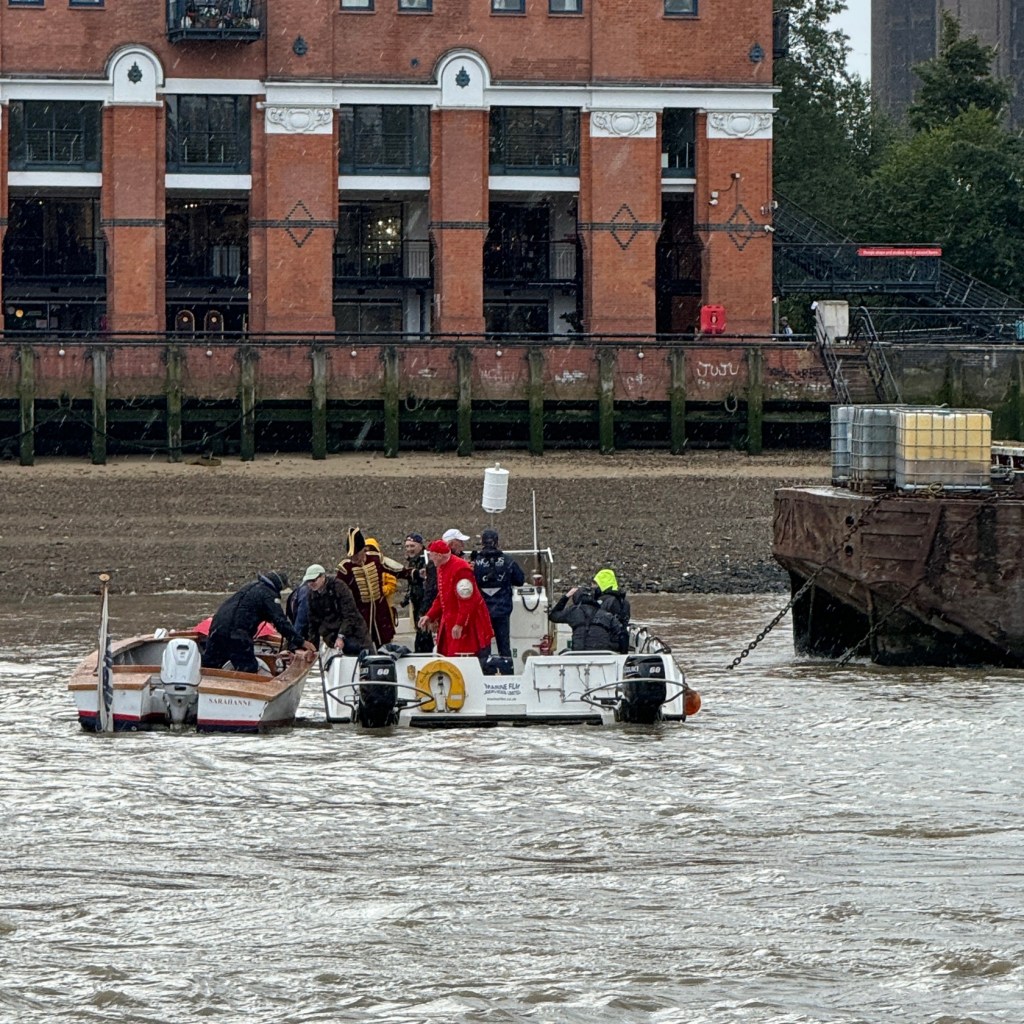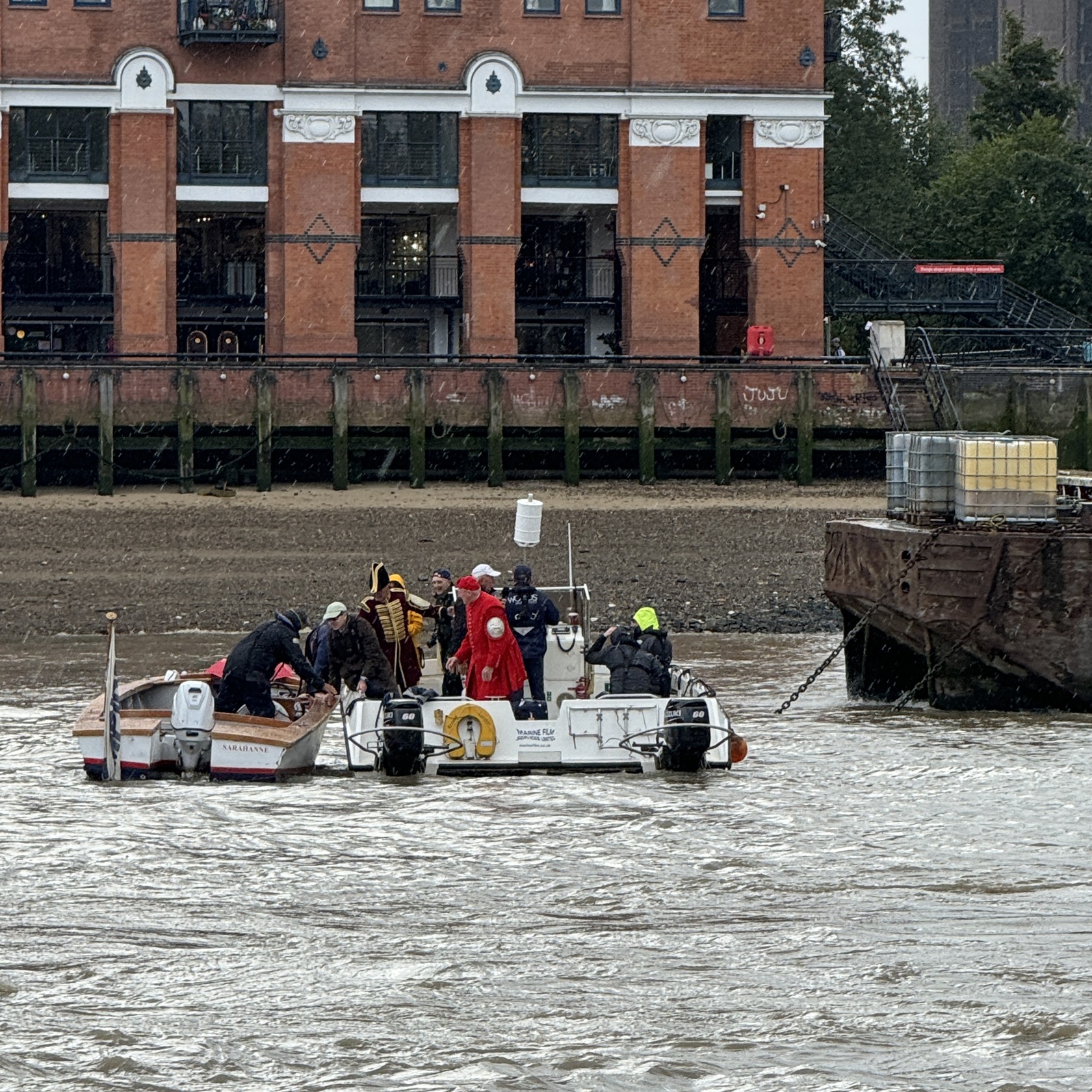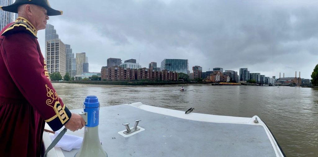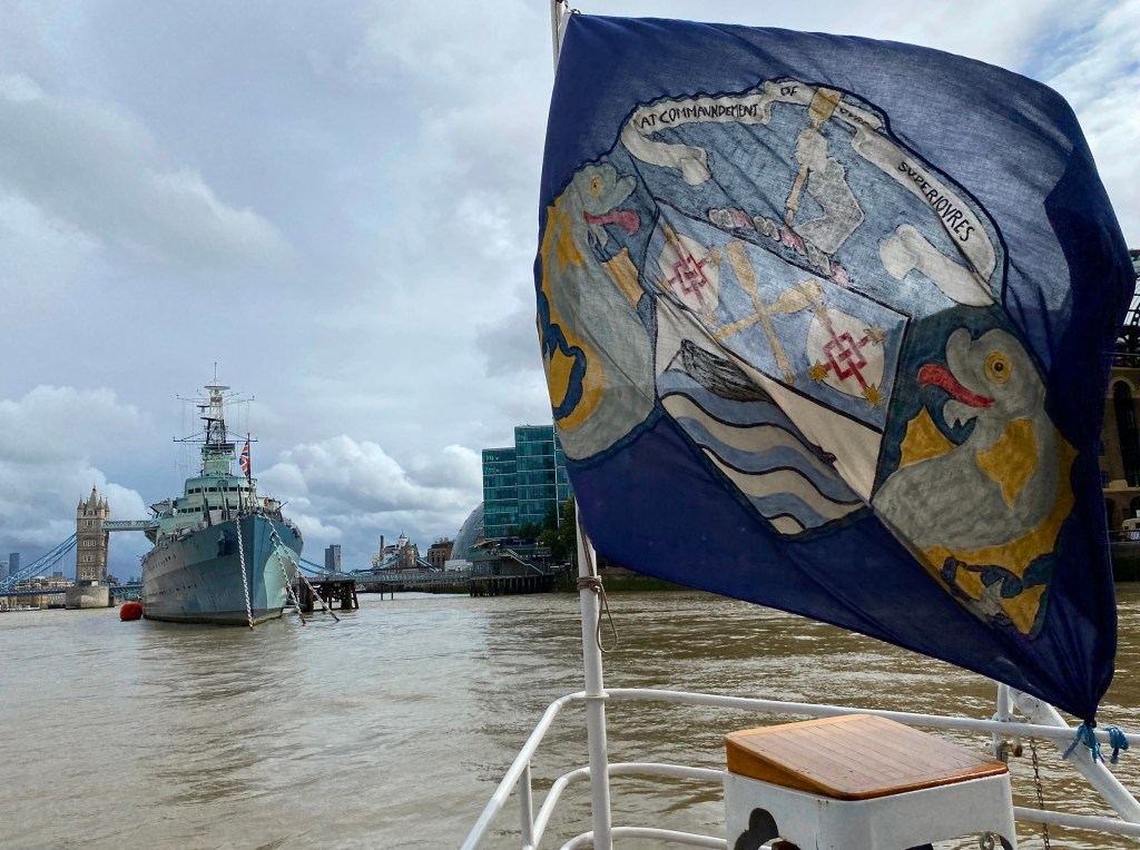 The flag of the Watermen’s Company flies from the bow of the MV Elizabethan carrying members of the Company watching the 2025 Doggett’s Coat and Badge Race.