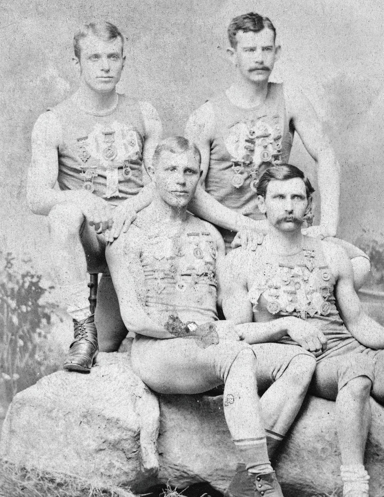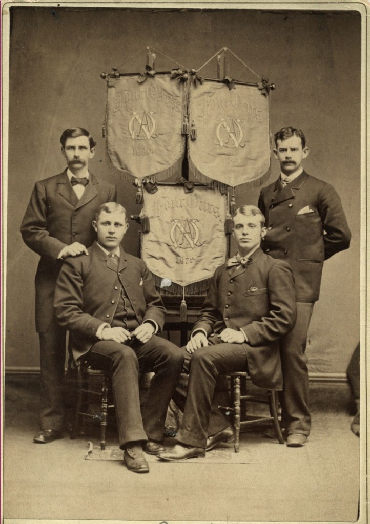 The Hilldale crew wearing medals, 1881: Homer P. Mead, Esbon B. Van Valkenburgh, Lewis F. Beckhardt and Clarence W. Terwilliger. Photo courtesy Hillsdale County Historical Society