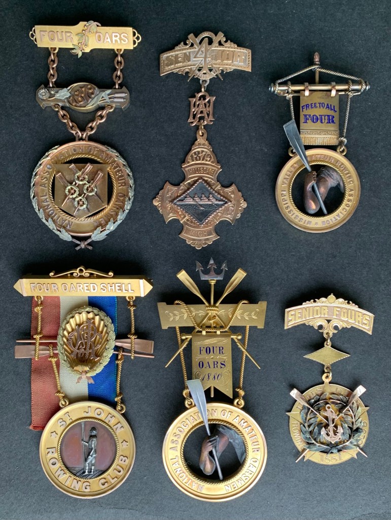 Bottom – left to right: 1880 St. John Rowing Club Interstate Regatta – Four Oared Shell; 1880 NAAO National Champion – Four Oars; 1881 Hillsdale Rowing Club Regatta – Senior Fours