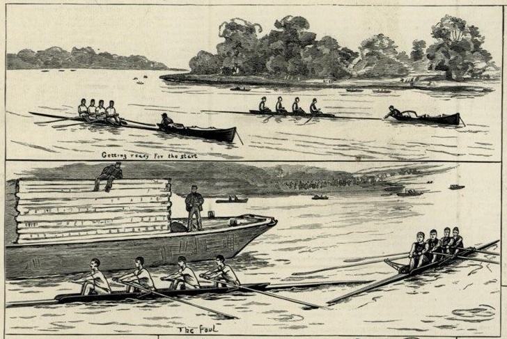 In the final, the crews shot off the start – the Shoes @ 47 spm, the Elizabeths @ 40, the Hillsdales @ 46, the Mutuals @ 46, and the Wah-Wahs @ 36. The Shoes, the Elizabeths, the Hillsdales and the Wah-Wahs were all even at the mile mark. Steering was amiss. The Shoes fouled the Elizabeths and the Wah-Wahs fouled the Mutuals but it was still a very close finish among them all. The referee, William Curtis, disqualified the Shoes and the Wah-Wahs and ordered the race to be re-rowed at 3:30 PM that day by the remaining three boats.