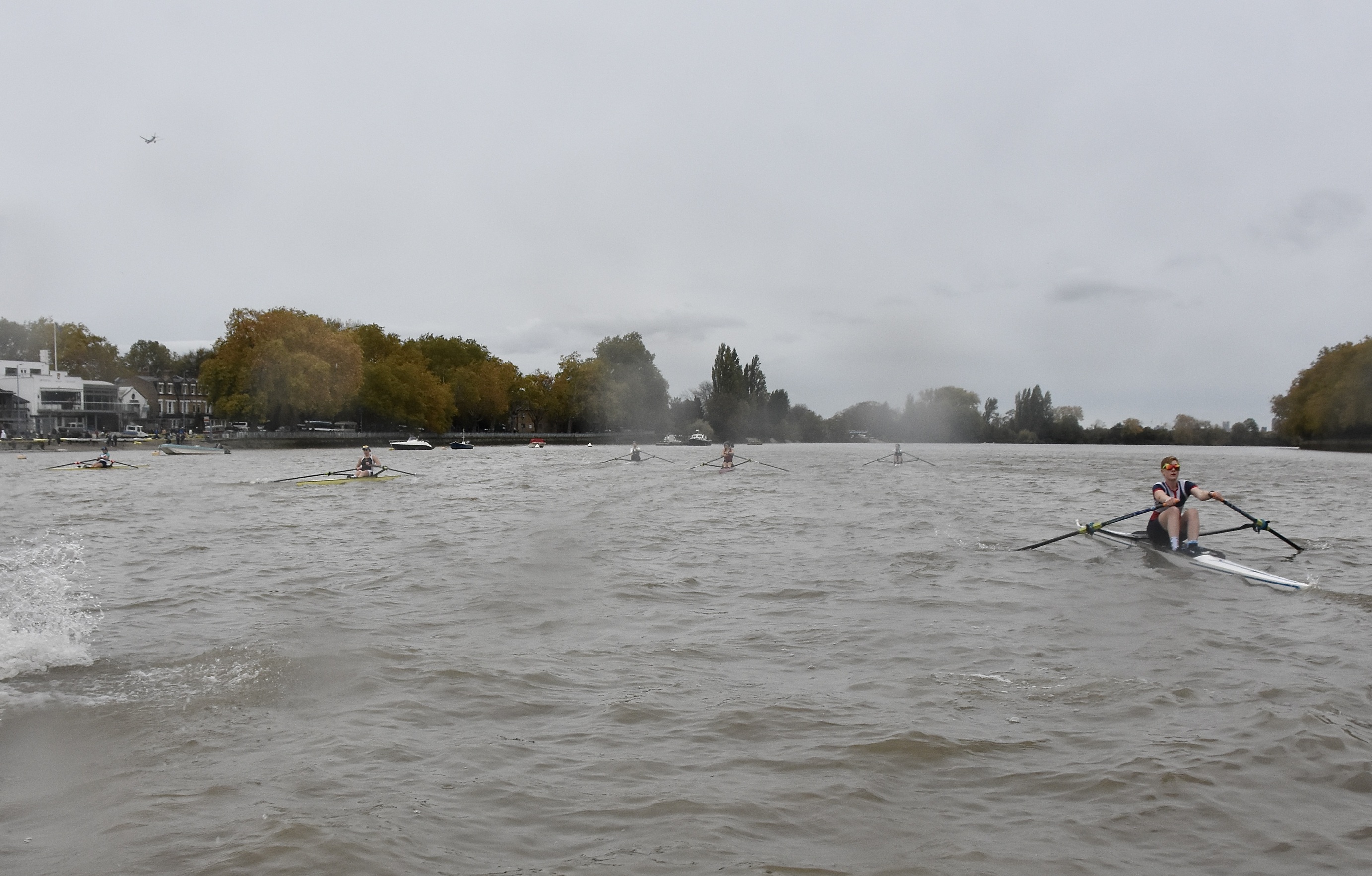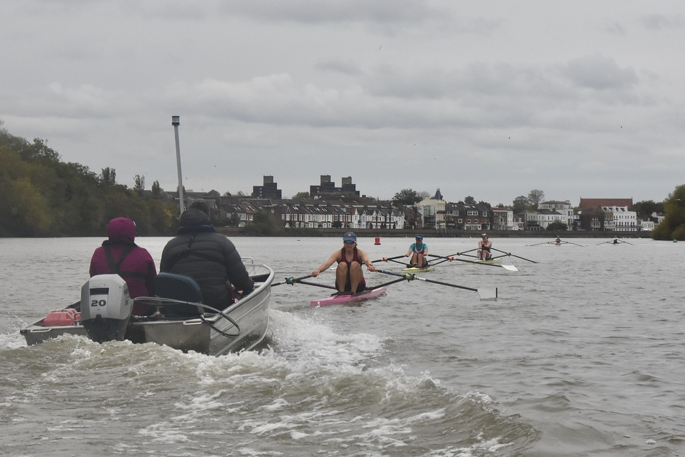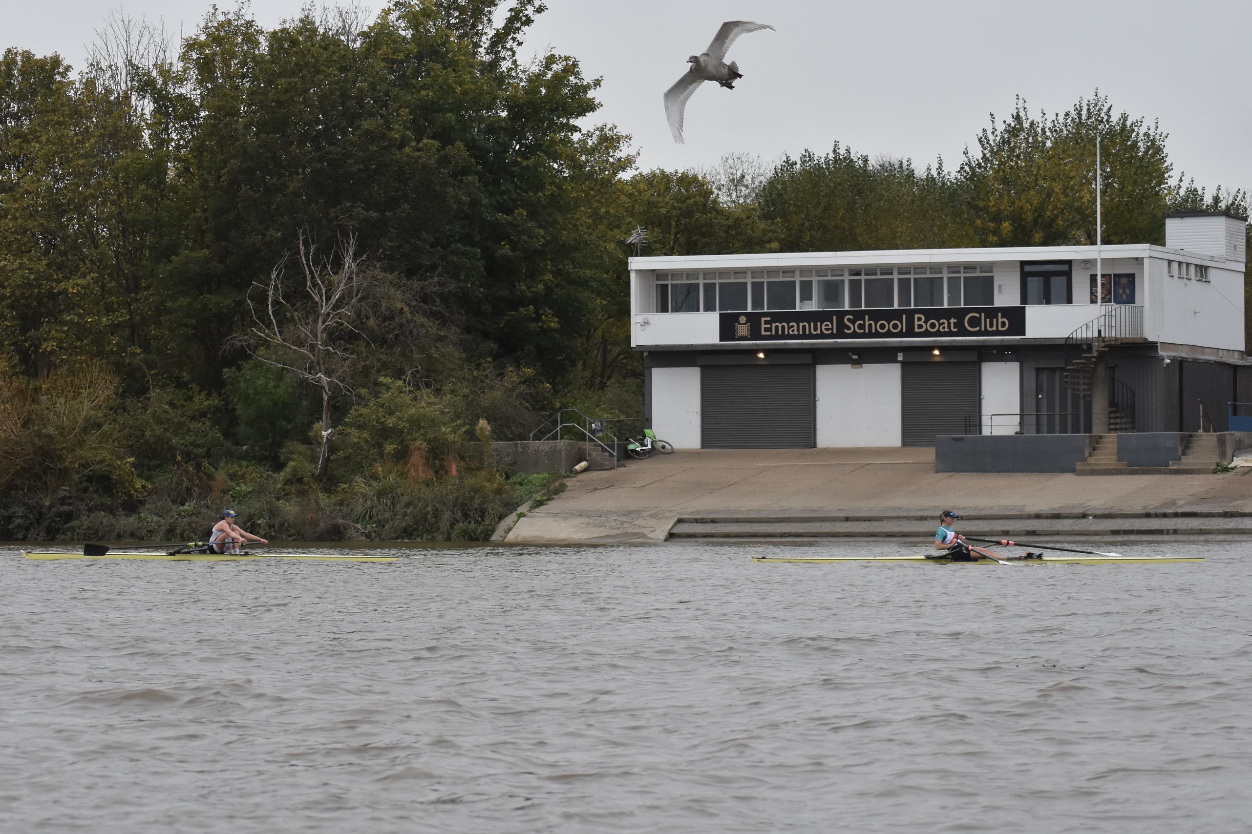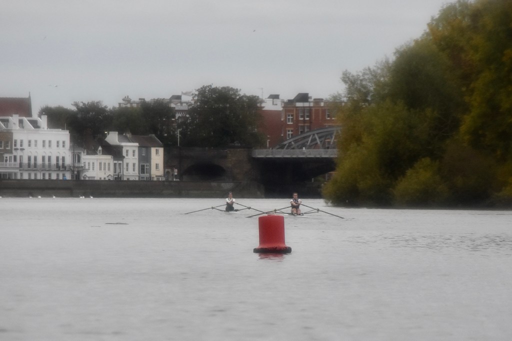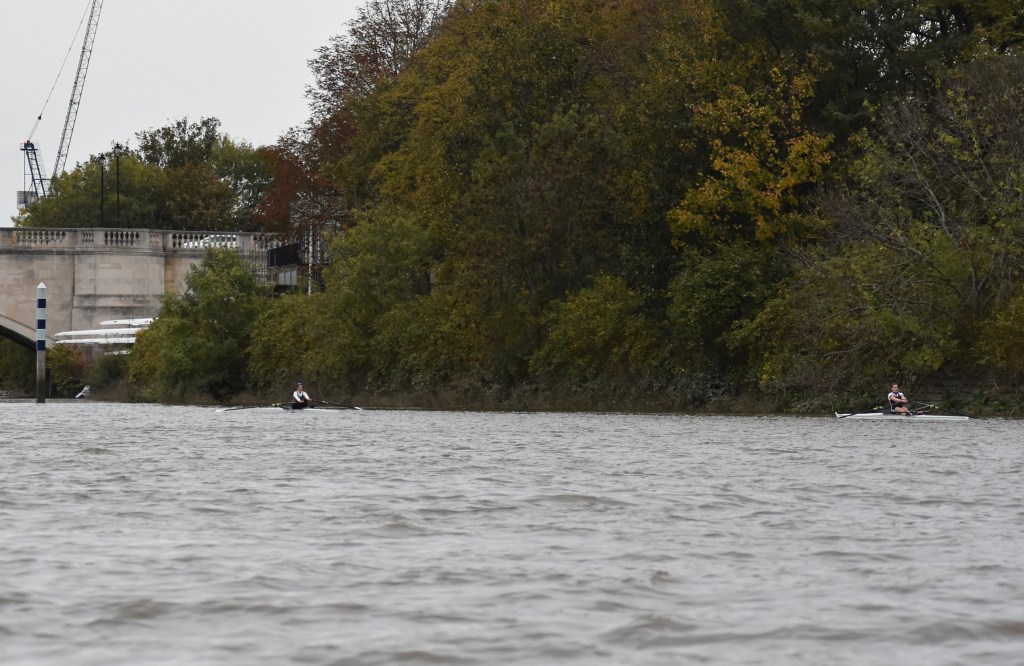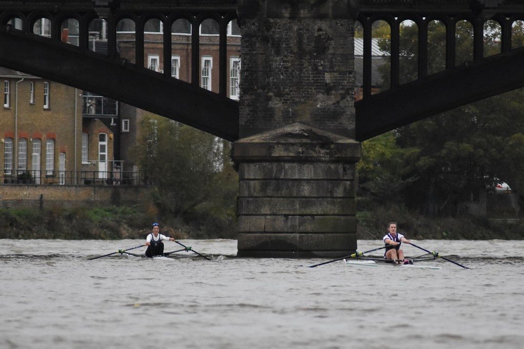 Third placed Keane and fourth placed Titterington pass Emanuel School Boat Club downstream of Barnes Bridge.