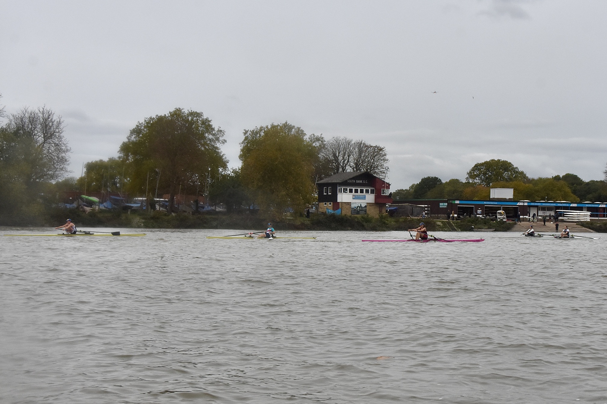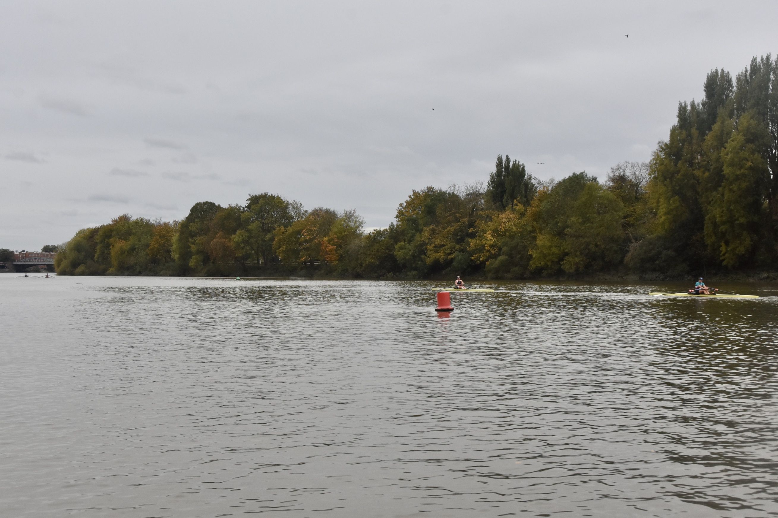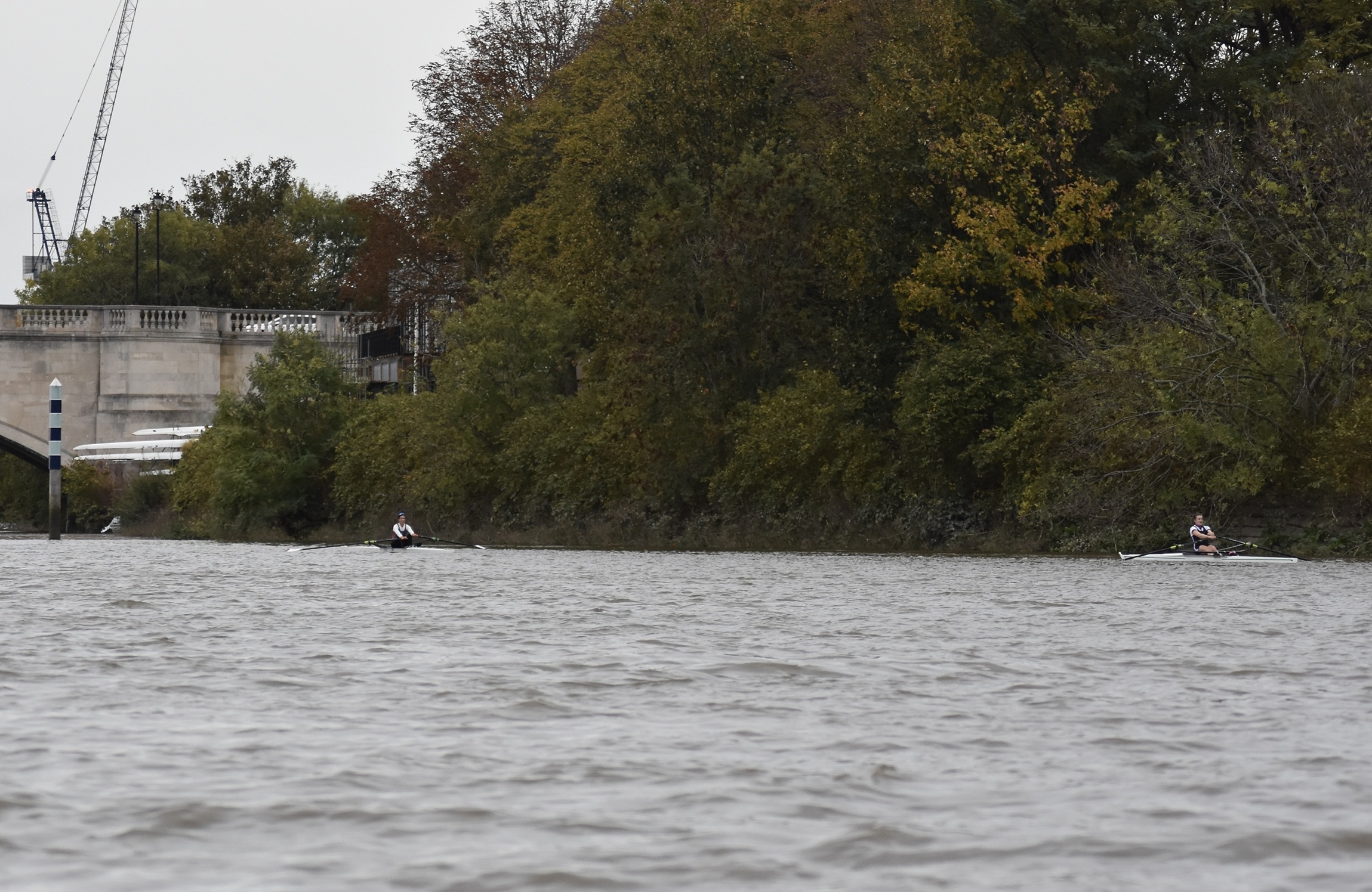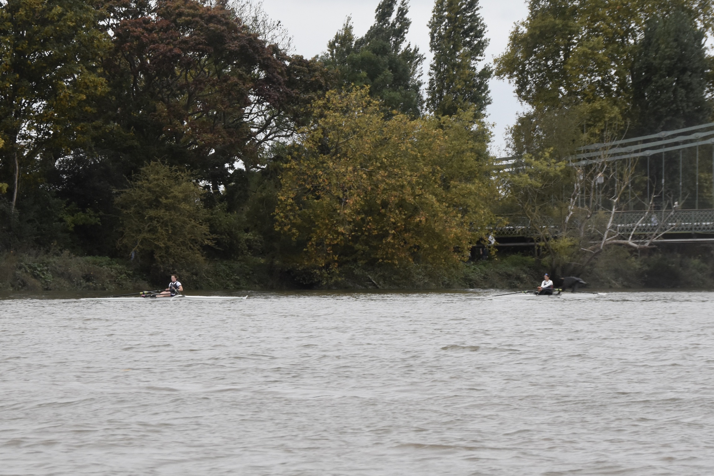 Third placed Keane and fourth placed Titterington pass Emanuel School Boat Club downstream of Barnes Bridge.