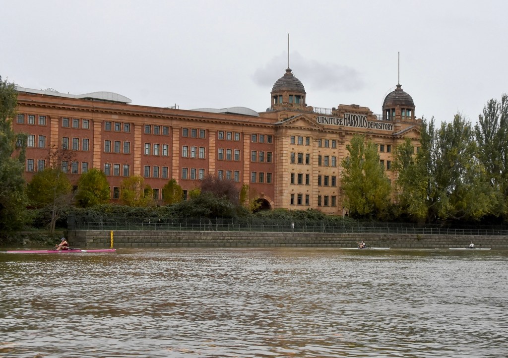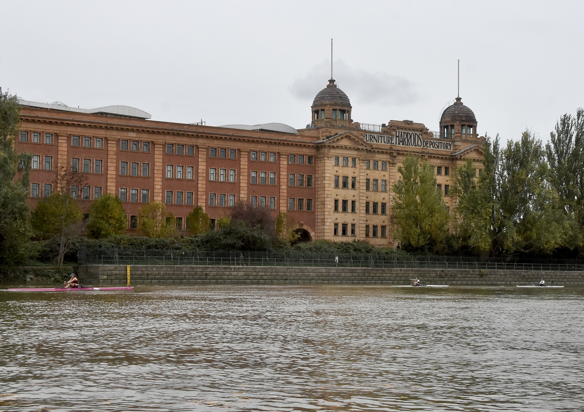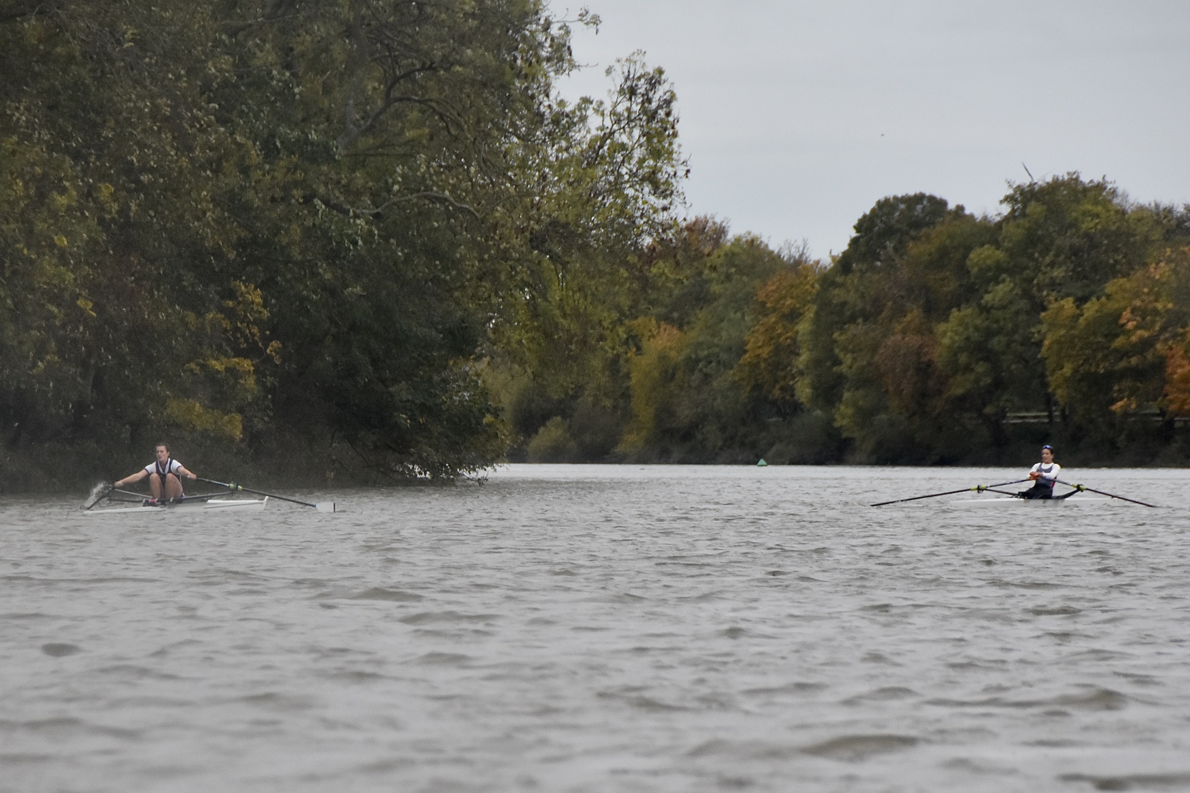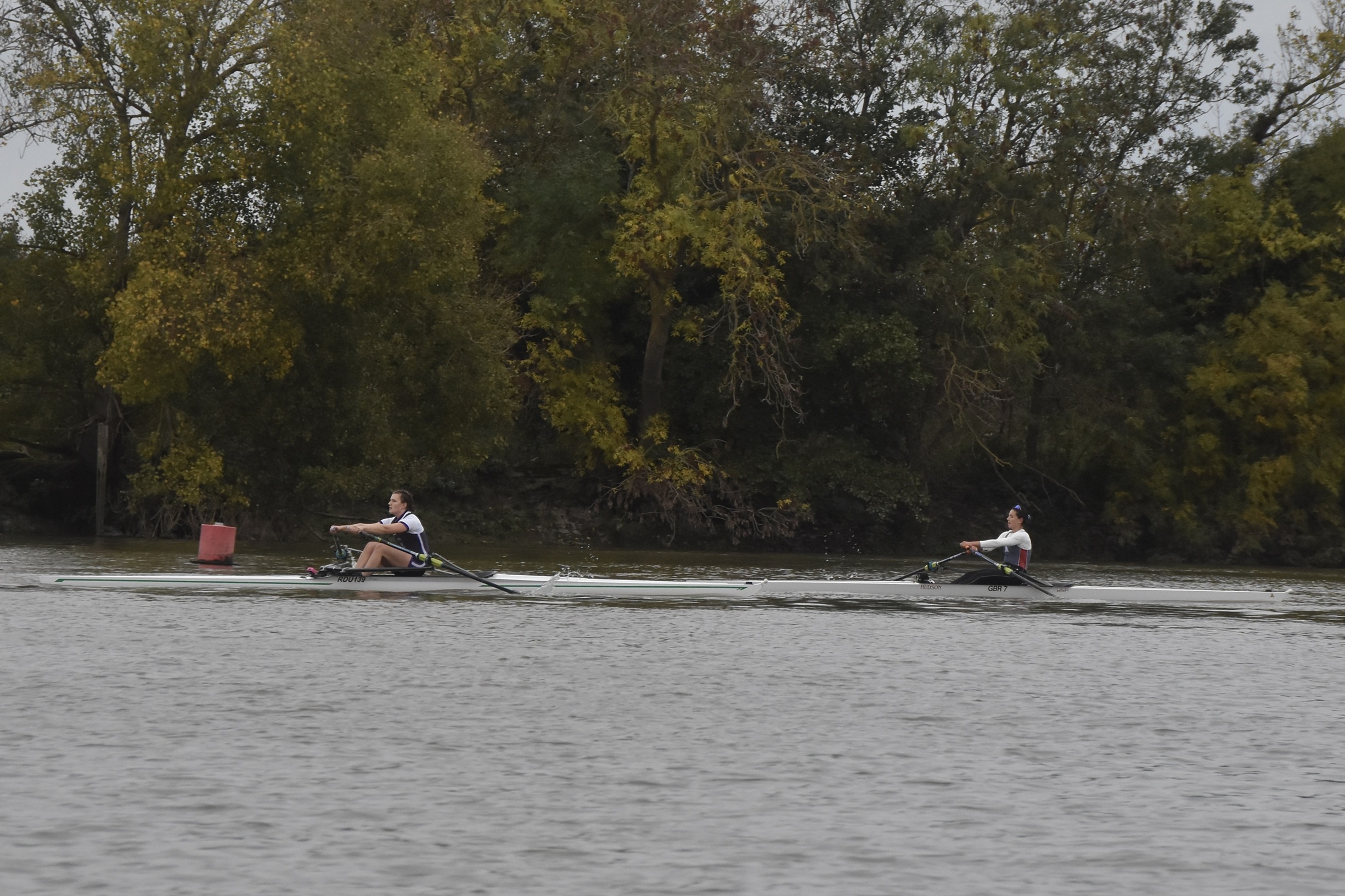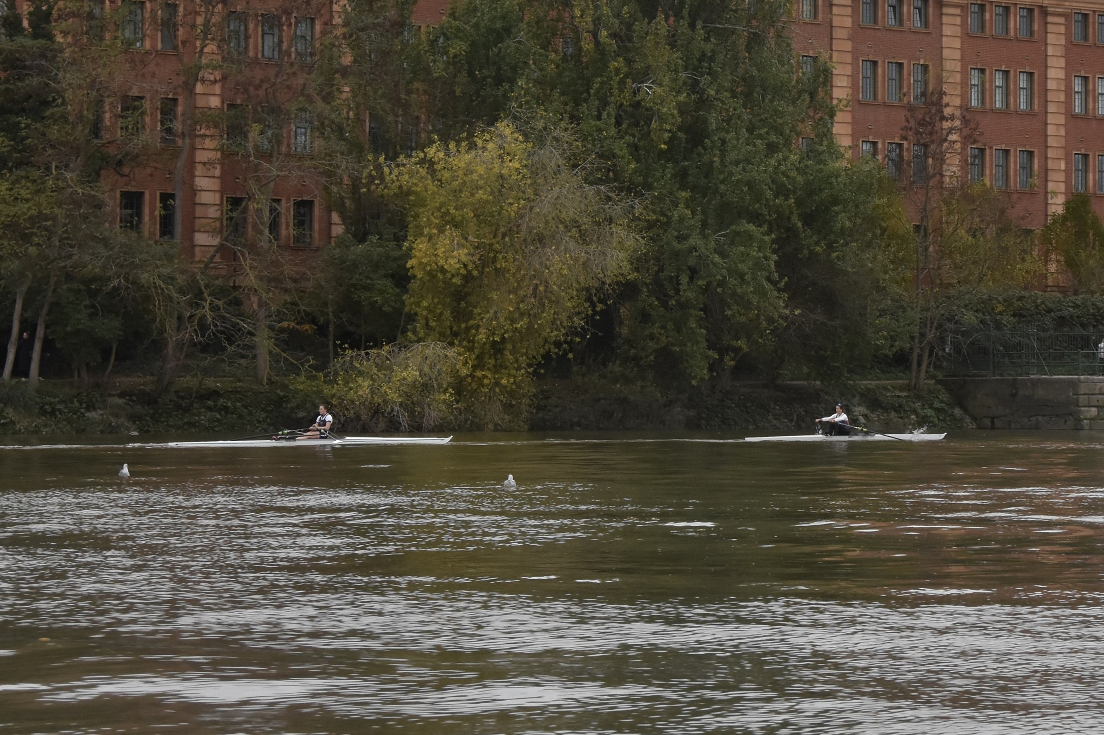 Third placed Keane and fourth placed Titterington pass Emanuel School Boat Club downstream of Barnes Bridge.