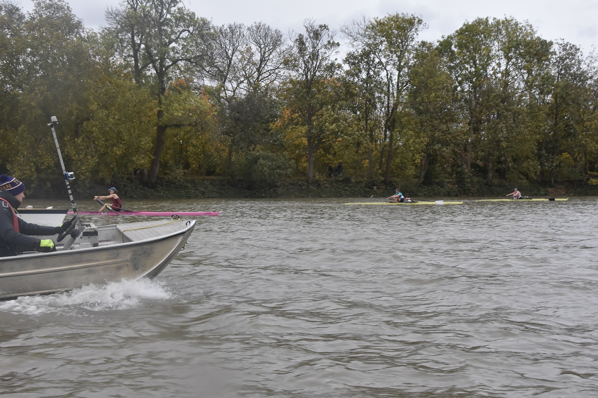 Just before Barnes Bridge, fifth placed Maxwell is passed by the umpire and following flotilla.