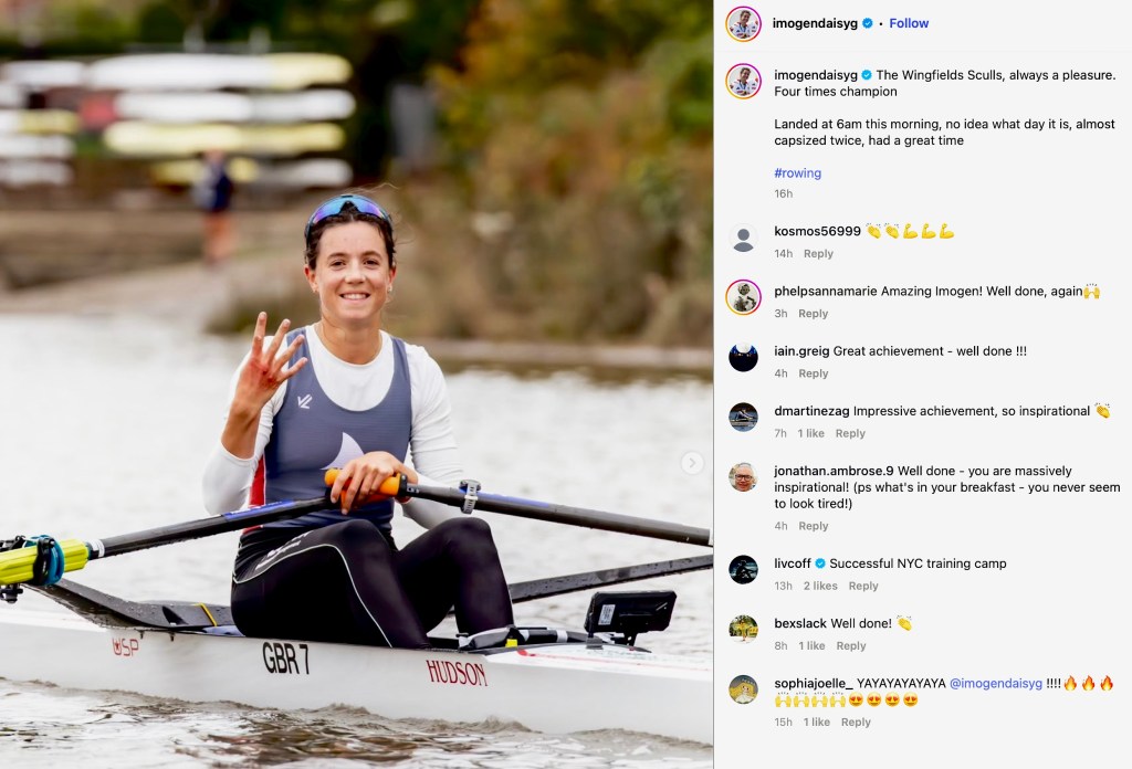 On 26 October, Imogen Grant recorded her fourth consecutive win in the Women’s Wingfield Sculls, the 19th such race. Image: @imogendaisyg/AllMarkOne.