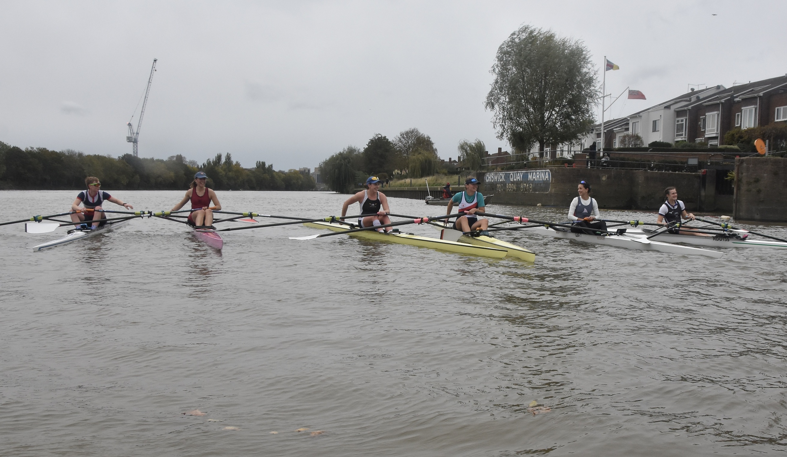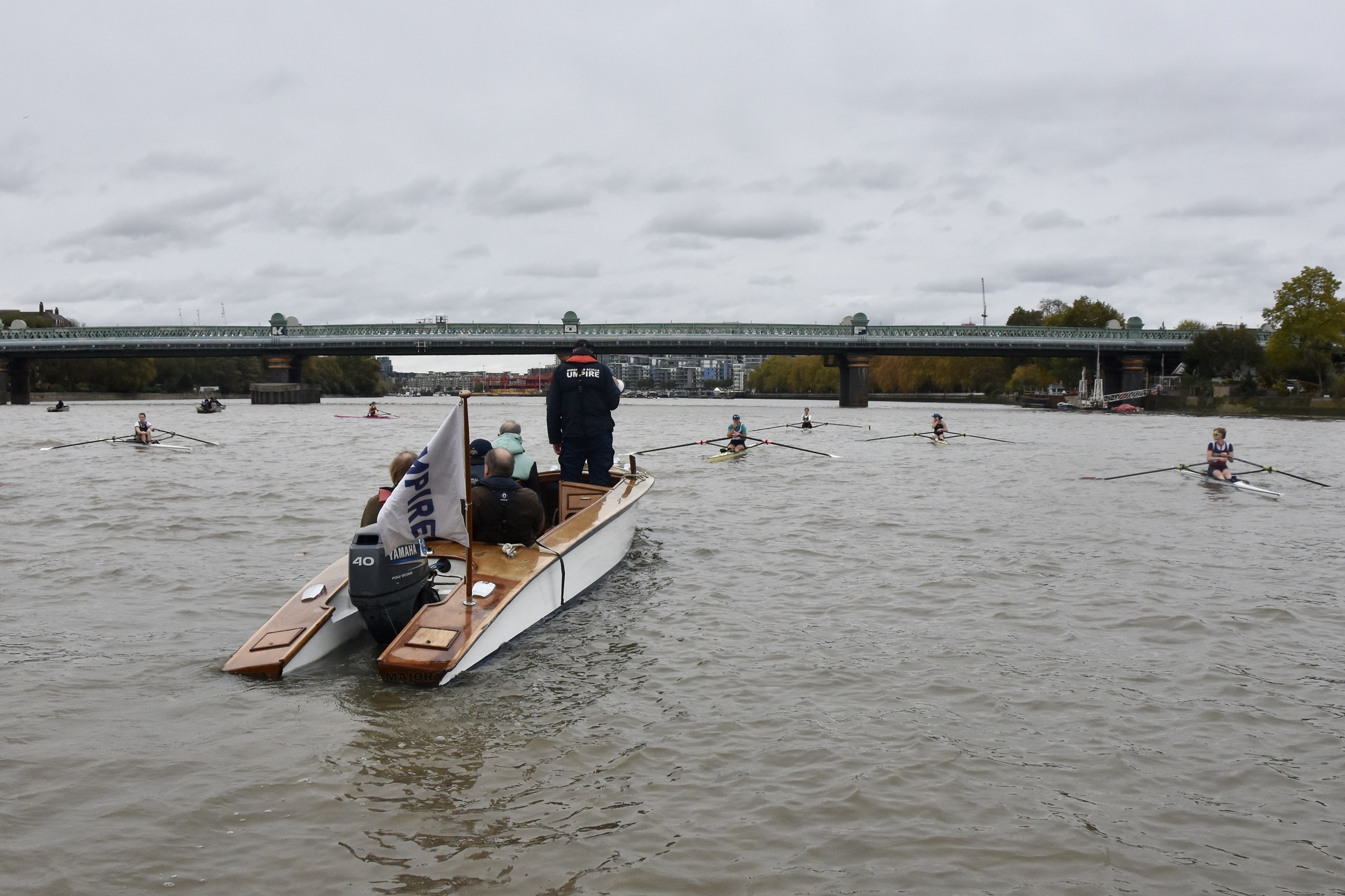 Just above Putney Rail Bridge, Umpire Greg Searle prepares to turn, left to right, Lancaster, Maxwell, Titterington, Grant, Keane and Wake.