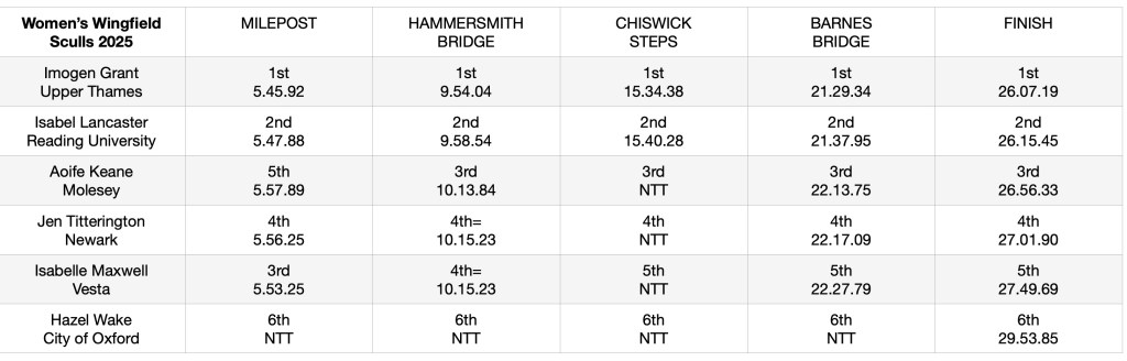 Hammersmith Bridge times: 1st Grant (9.54), 2nd Lancaster (9.58), 3rd Keane (10.13), 4th Titterington, 5th Maxwell (10.15) and 6th Wake (NTT).