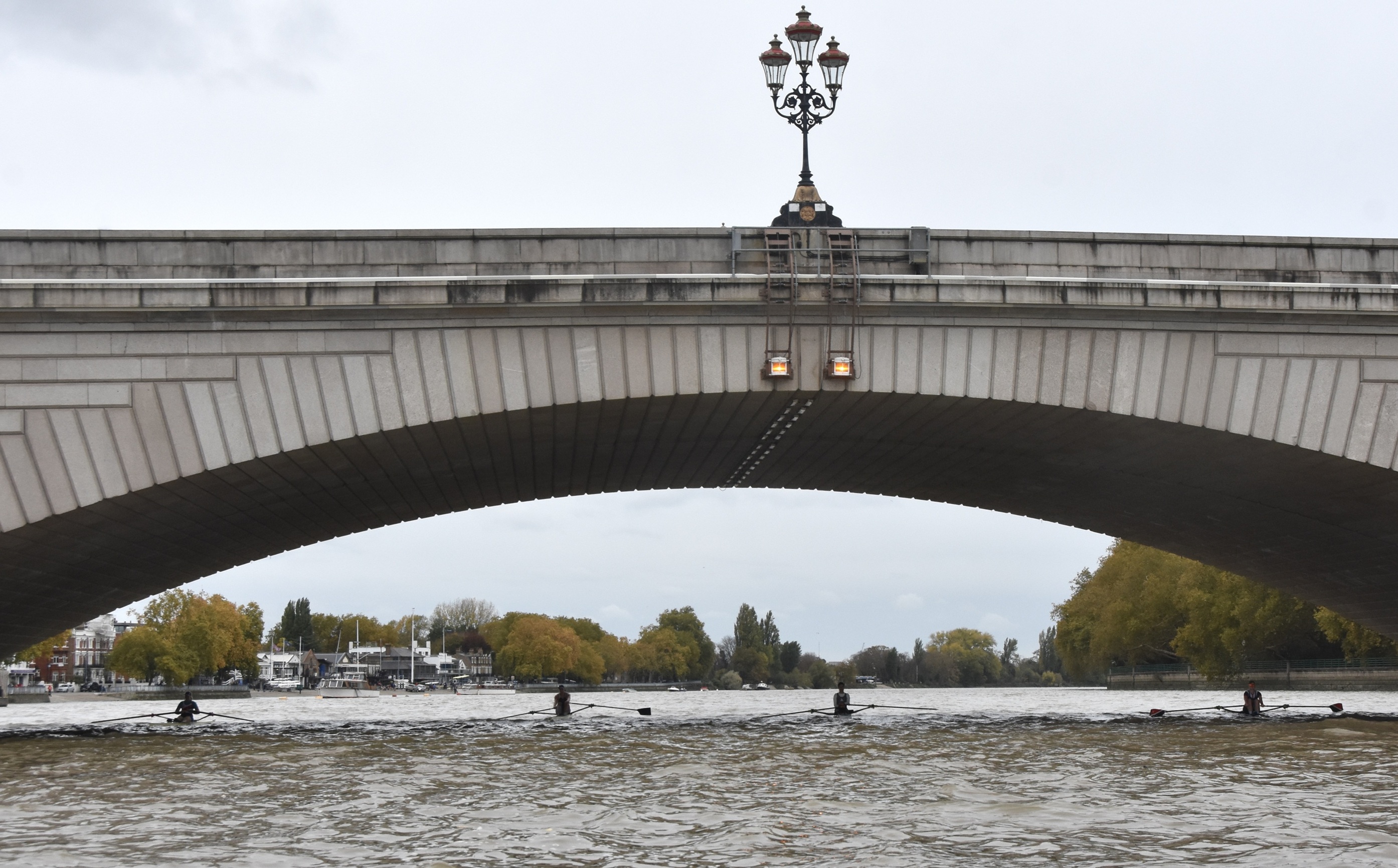 Titterington, Keane, Grant and Wake under Putney Bridge on their way to the start line.