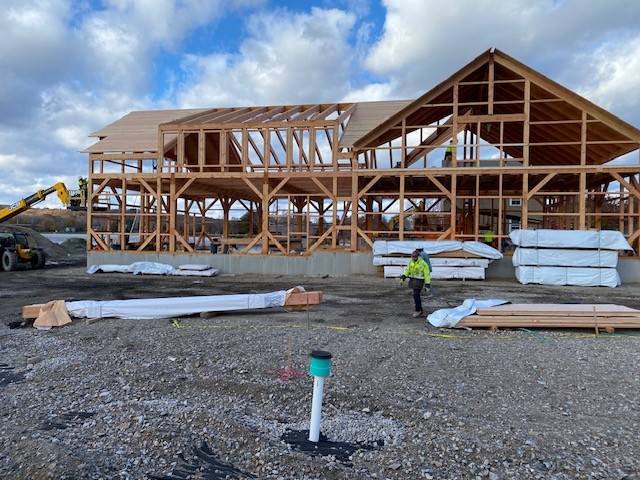 Since the groundbreaking ceremony in mid-July, the Lovelace House was moved away from Greenmanville Avenue to the north side of the property, so the house foundation installation could begin and the boathouse slab could be poured. After carpenters had repaired the Lovelace House, it was moved back to its permanent place by the road.