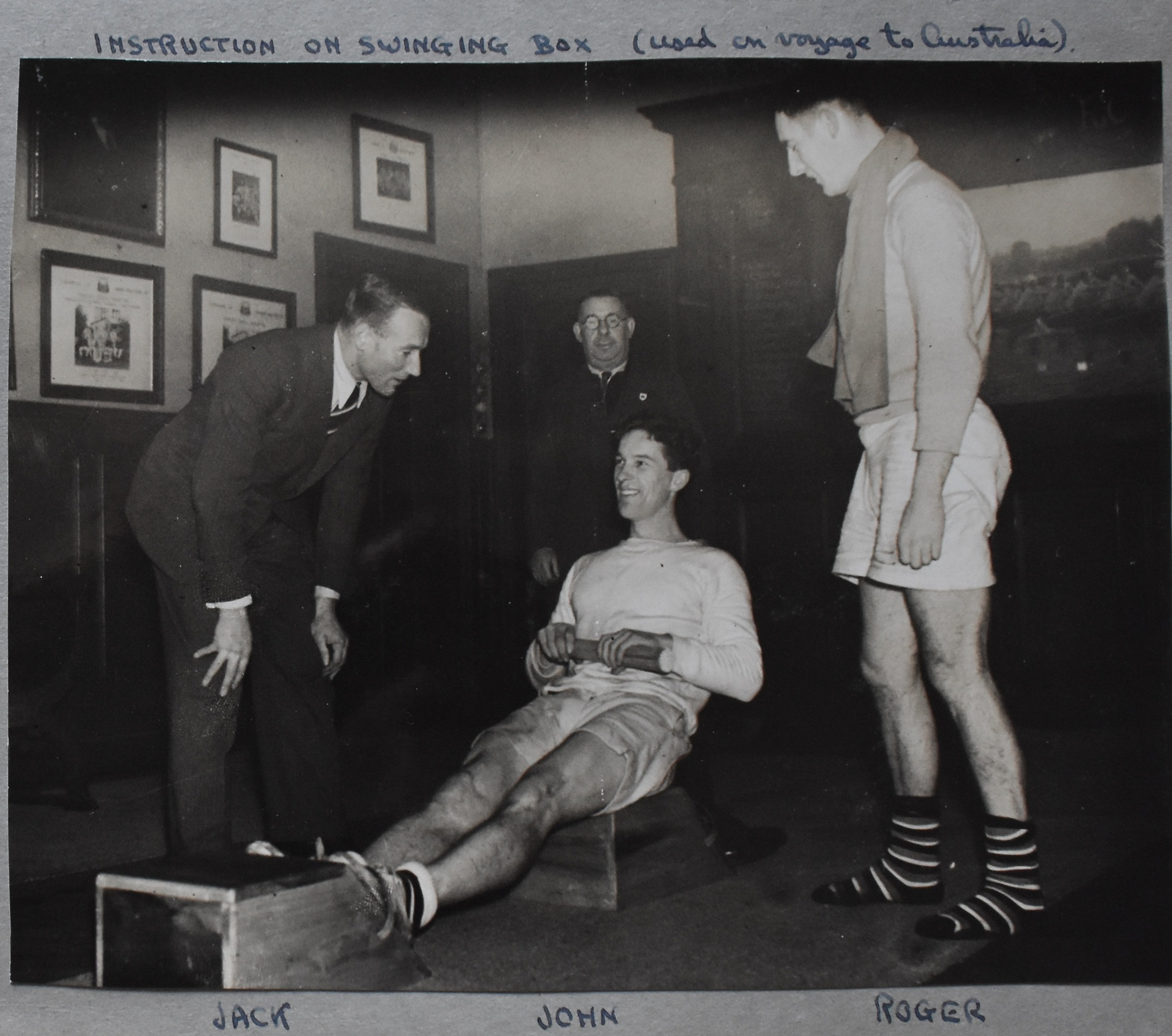 When the crew to represent England at the Empire Games Regatta in Sydney, Australia, in February, leave for “down under,” they are taking no chances of getting out of training through a lazy life as ship-board passengers. They will, on the contrary, be able to keep fit during the weeks of the voyage. Jack Beresford has designed a very neat little device to help over this. It consists of a series of swinging boxes which look like shoe-black’s rests. These are placed in a row, so that the eight occupy their usual positions, each sitting on his box. On the sloping back of the box in front of each, heel-traps and straps are fixed in exact imitation of the stretcher on which an oarsman rests his feet in a boat. Each man holds a dummy oar handle, and cox gives the orders. Rhythmical swinging from these boxes is found to be a better physical exercise than anything else.