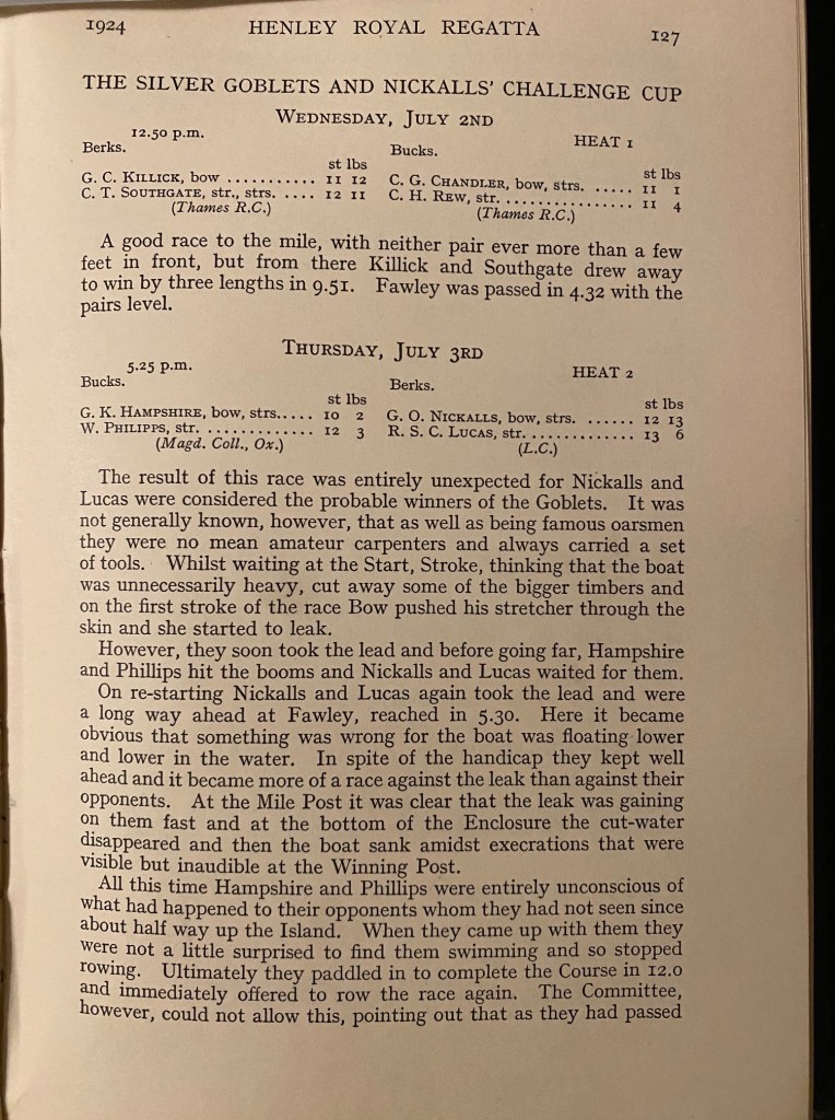 *Editor’s Note: ‘Henley Records 1919-1938’ (1939), edited by Clifford Thomas Steward, pp 127-128, tells the story about the Nickalls & Lucas and Hampshire & Phillips race that Mark Blandford-Baker mentions above: