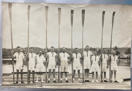 Plum writes that her father is the fourth person (third oarsman) from the left, and she believes the crew is from the Singapore Rowing Club.