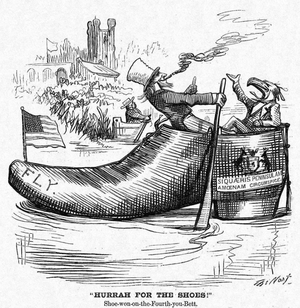 To celebrate the “Shoes”’ first-heat victory, Harper’s Weekly published a cartoon by the celebrated American editorial cartoonist Thomas Nast. The victory is represented by a giant shoe being rowed by a cigar-smoking Uncle Sam symbolizing the United States and coxed by an eagle, another symbol of the United States. At the shoe’s toe is an American flag and the letters FLY. I can only speculate that the letters are intended to suggest the quintessentially American traditional dessert known as shoofly (shoefly) pie. The side of the giant shoe acknowledges the “Shoes’” home state of Michigan by displaying the Michigan Great Seal showing an elk and a moose, both symbols of the state, and an eagle symbolizing the United States. Below the seal is a banner displaying the Latin state motto: Si quaeris peninsulam amoenam circumspice (If you seek a pleasant peninsula, look about you). In the distance of the scene is the iconic tower of Henley’s St. Mary’s Church visible from the Thames. Near the shoreline, a corpulent gentleman rows a wooden tub, the meaning of which I have no idea. The cartoon’s caption reads “Hurrah For The Shoes!” Shoe-won-on-the-Fourth-you-Bett, a play on the “Shoes’” lengthy hyphenated name.